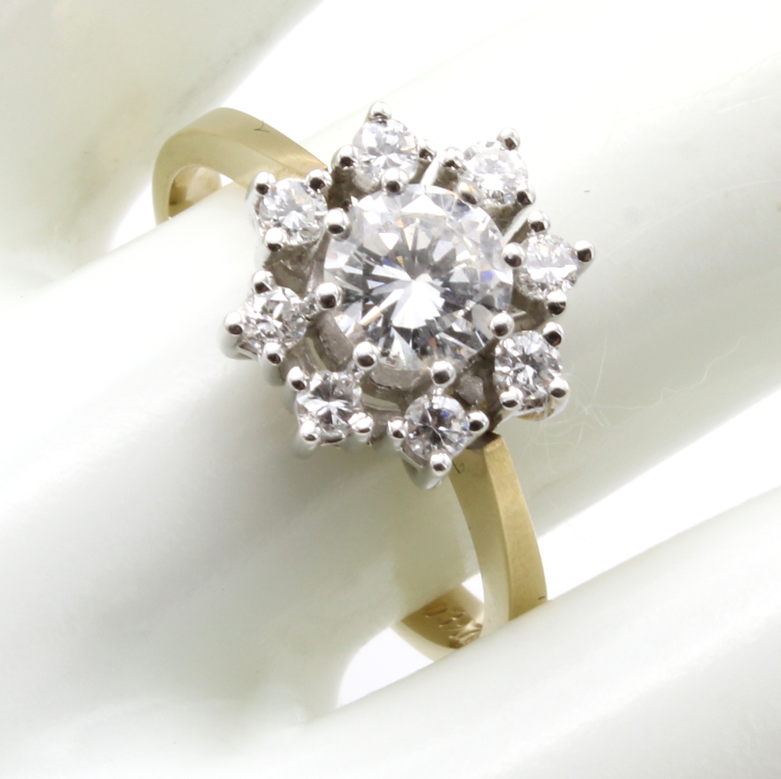 Ring mit Brillanten, GG/WG 585/000, Mittel- stein ca. 0.59 ct u. 8 Besatzbrill. zus. ca. 0.32 ct feines Weiß/p, RW ca. 55 Schätzpreis: 3800, - EUR