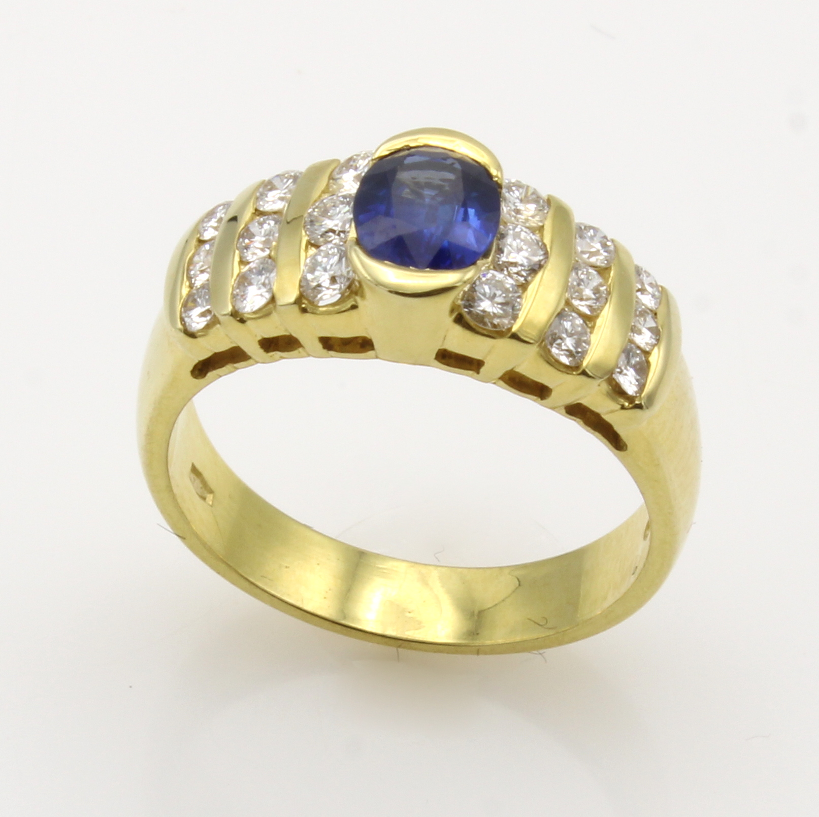 Ring mit Saphir und Brillanten, GG 750/000, ovaler Saphir ca. 0.83 ct, 18 Brill. zus. ca. 0.62 ct feines Weiß/vs, RW ca. 54 Schätzpreis: 4580, - EUR