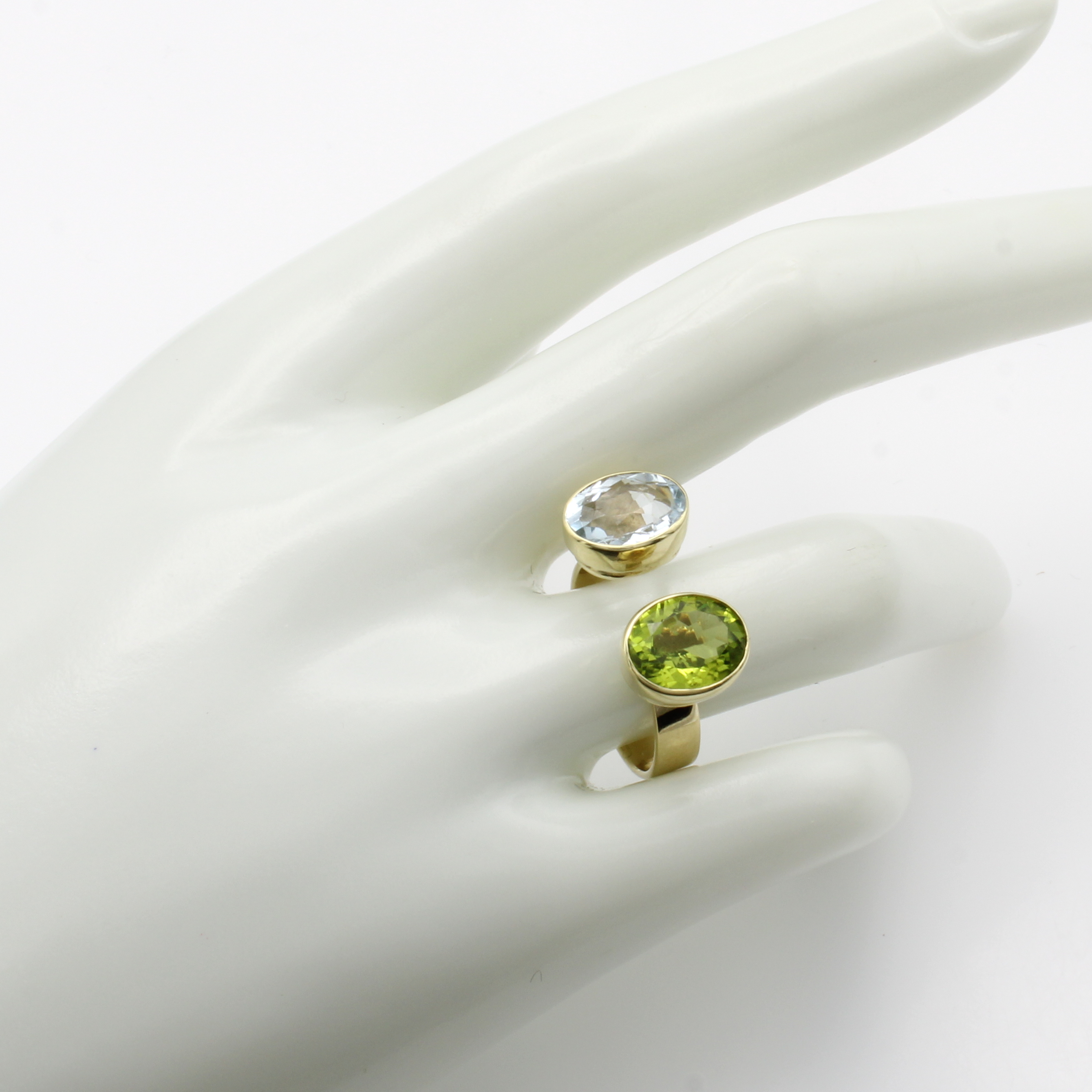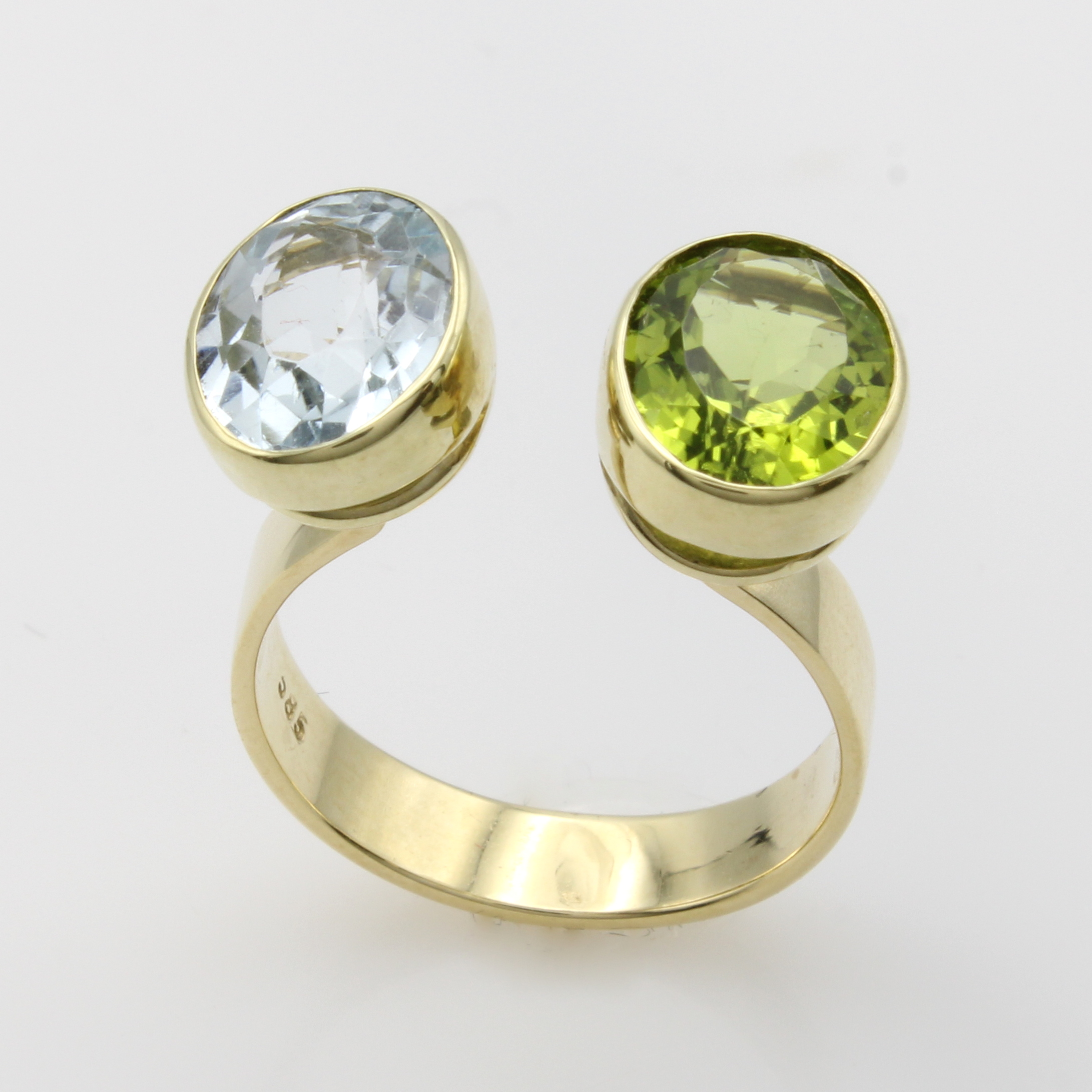 Ring mit Farbsteinen, GG 585/000, offen gearb., Aquam. ca. 3 ct, Peridot ca. 2.7 ct, RW ca. 55 Schätzpreis: 2380, - EUR