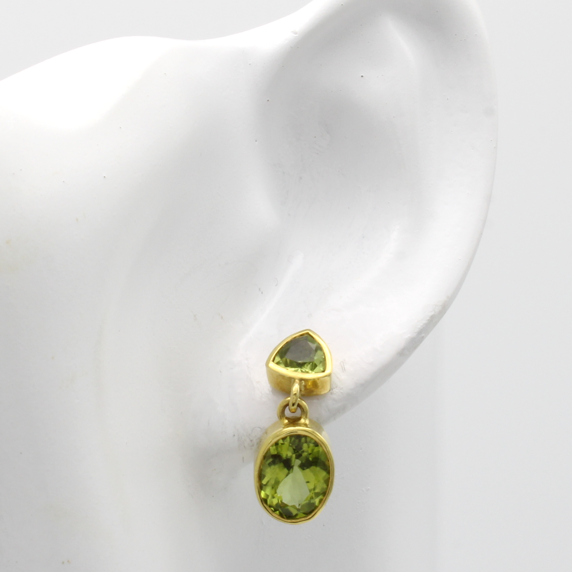 Paar Ohrstecker mit Peridots, GG 585/000, 2 dreieckige u. 2 ovale Peridots zus. ca. 4.6 ct, bewegl. gearb. Schätzpreis: 1890, - EUR
