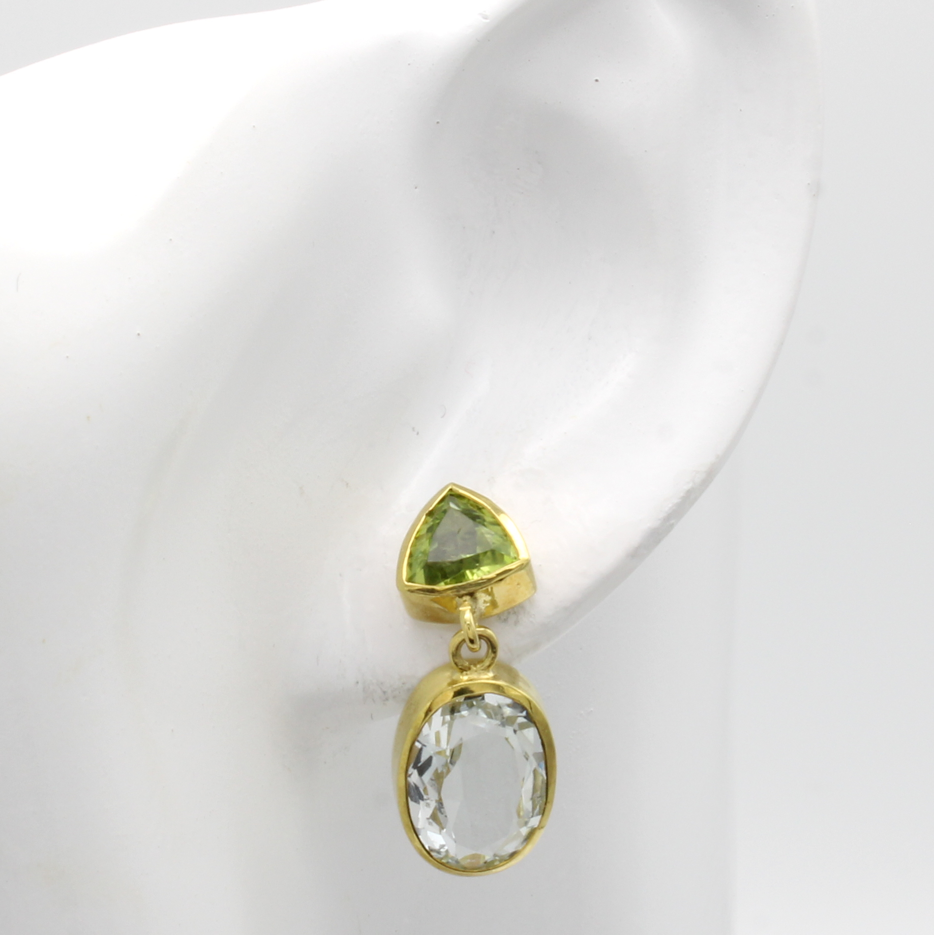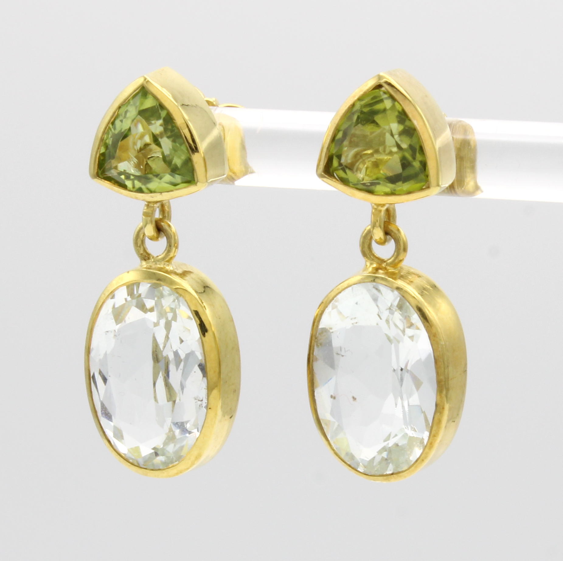 Paar Ohrstecker mit Farbsteinen, GG 585/000, 2 ovale Aquam. zus. ca. 6.5 ct, 2 dreieckige Peridots zus. ca. 1.7 ct, bewegl. gearb. Schätzpreis: 2200, - EUR