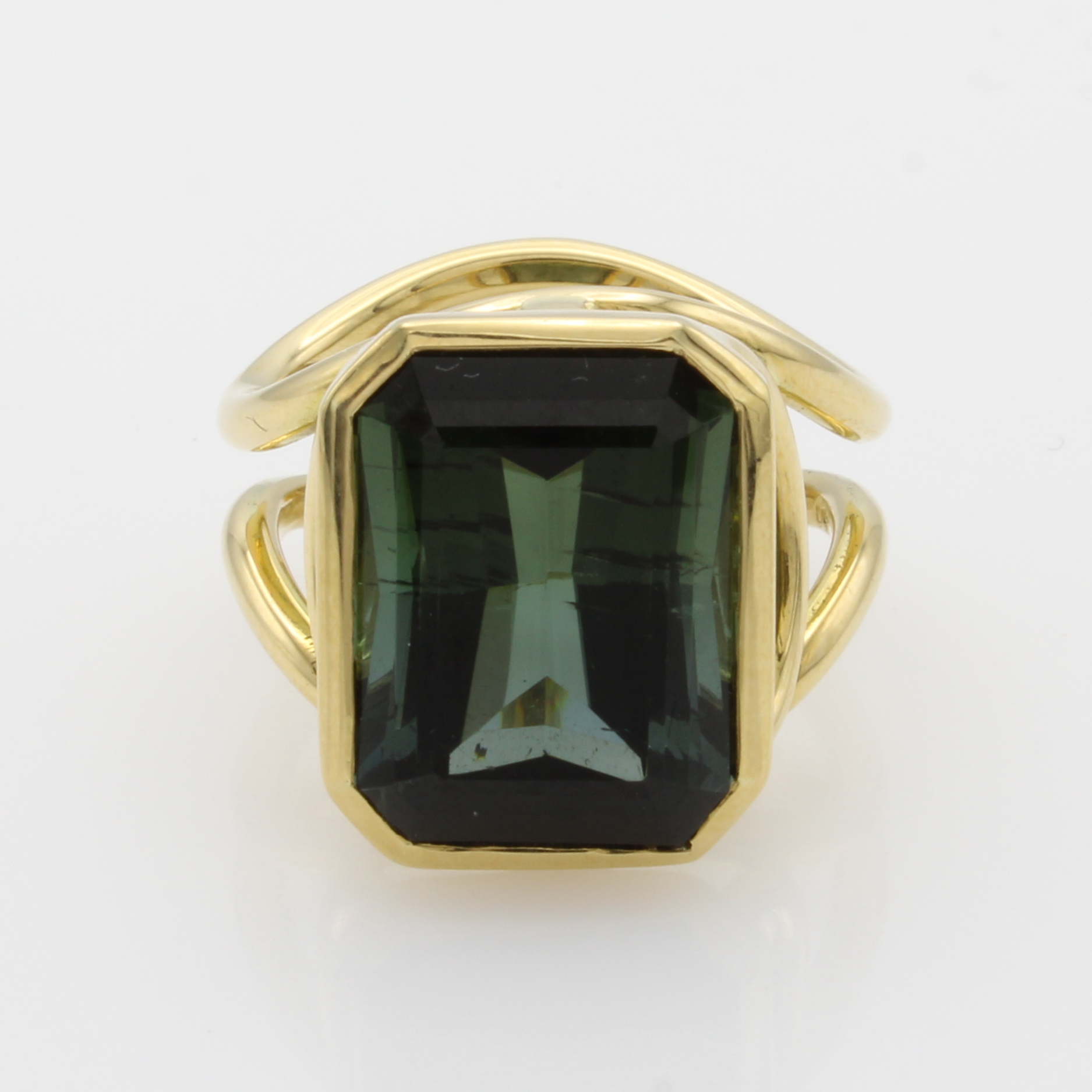 Ring mit Turmalin, GG 750/000, achteckiger, grüner Turmalin ca. 11.5 ct, 2-rhg. Schiene, RW ca. 55 Schätzpreis: 7100, - EUR