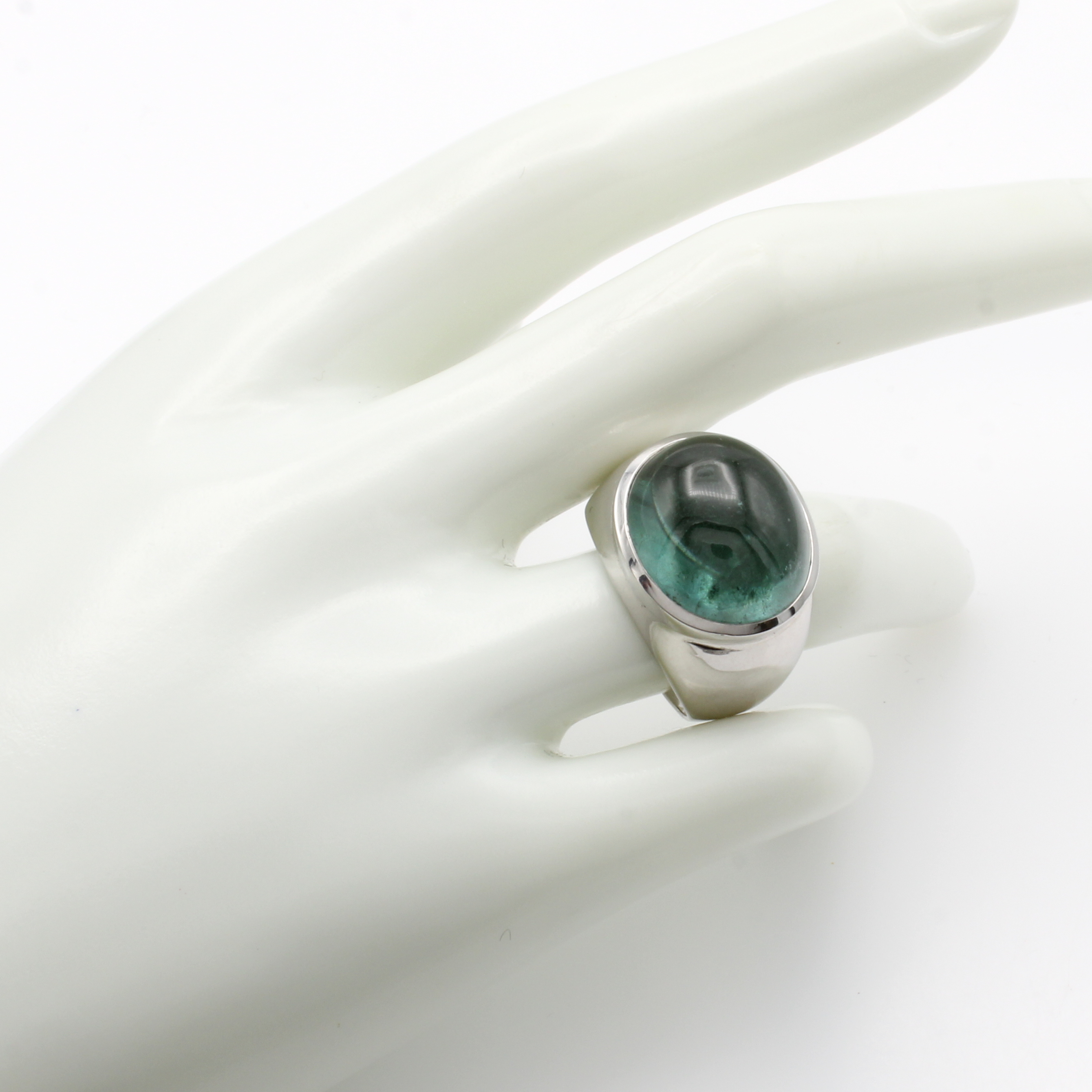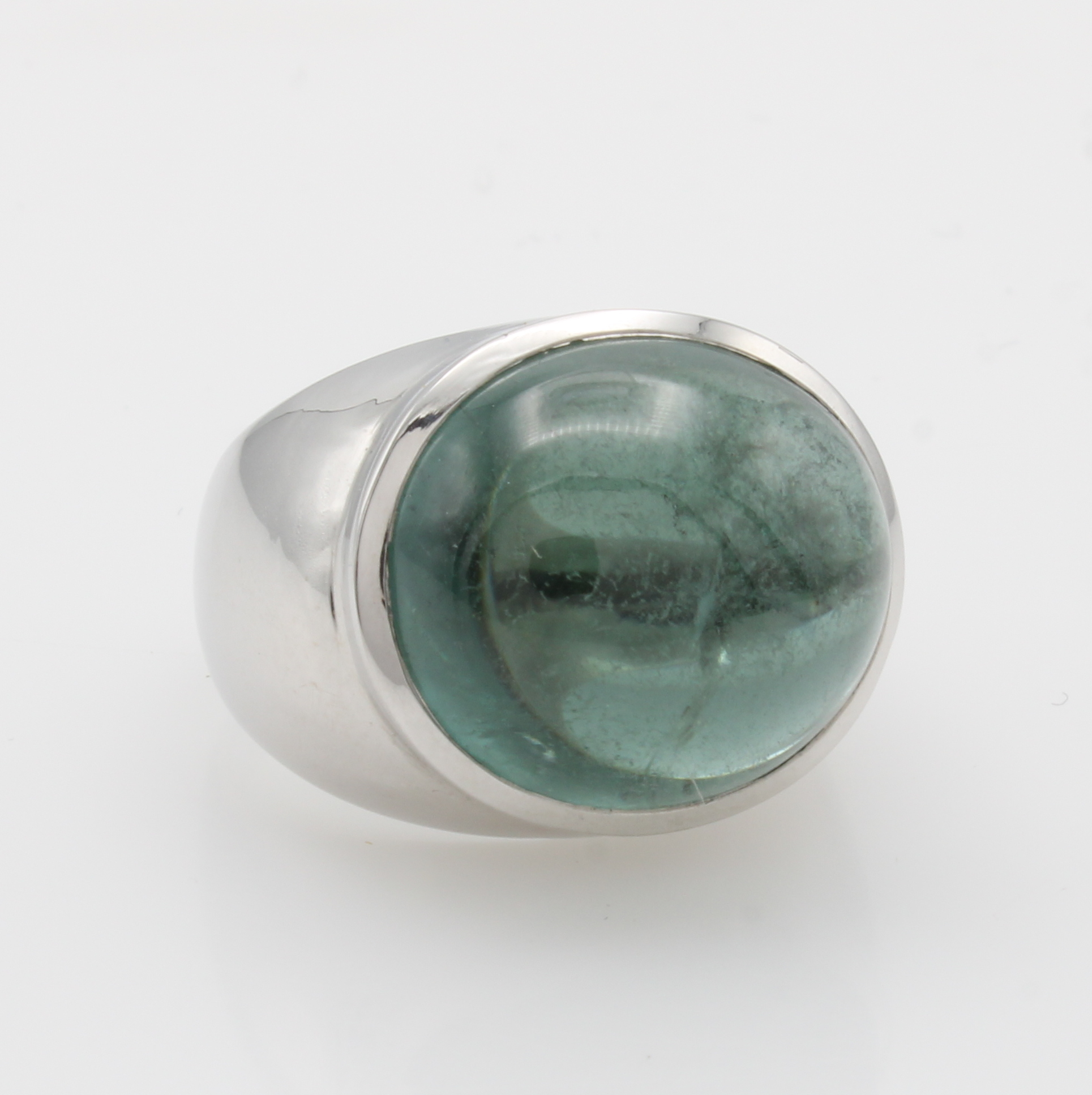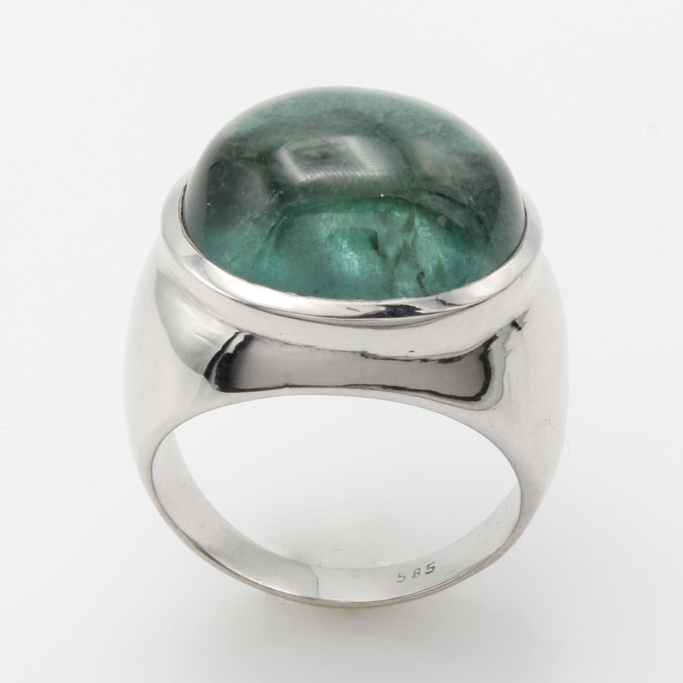 Ring mit Turmalin, WG 585/000, grüner Turmalincabochon ca. 23.6 ct, glattes Design, RW ca. 58 Schätzpreis: 9970, - EUR