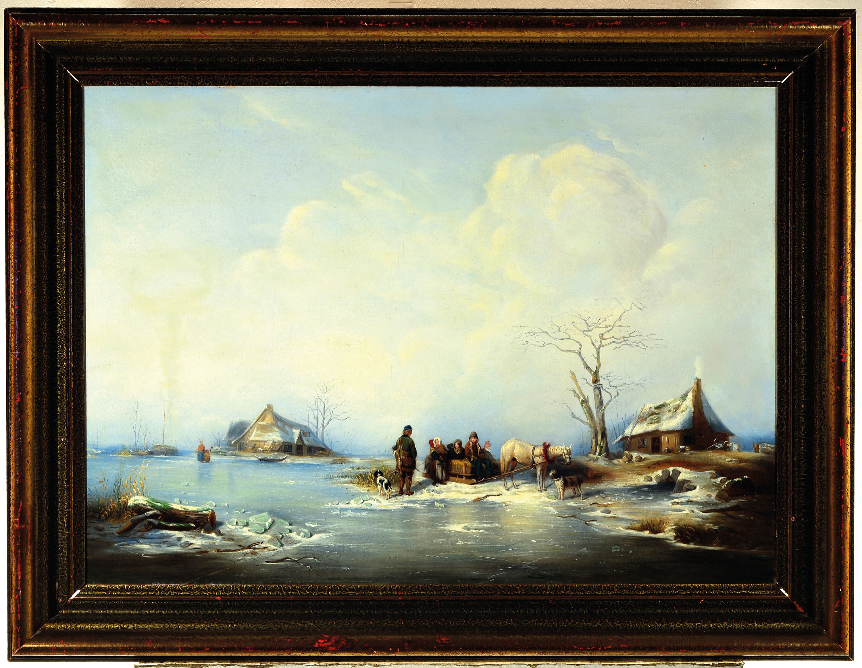 und Pferdeschlitten auf dem Eis, Öl/Lwd, rest., doubl., links unten Reste alter