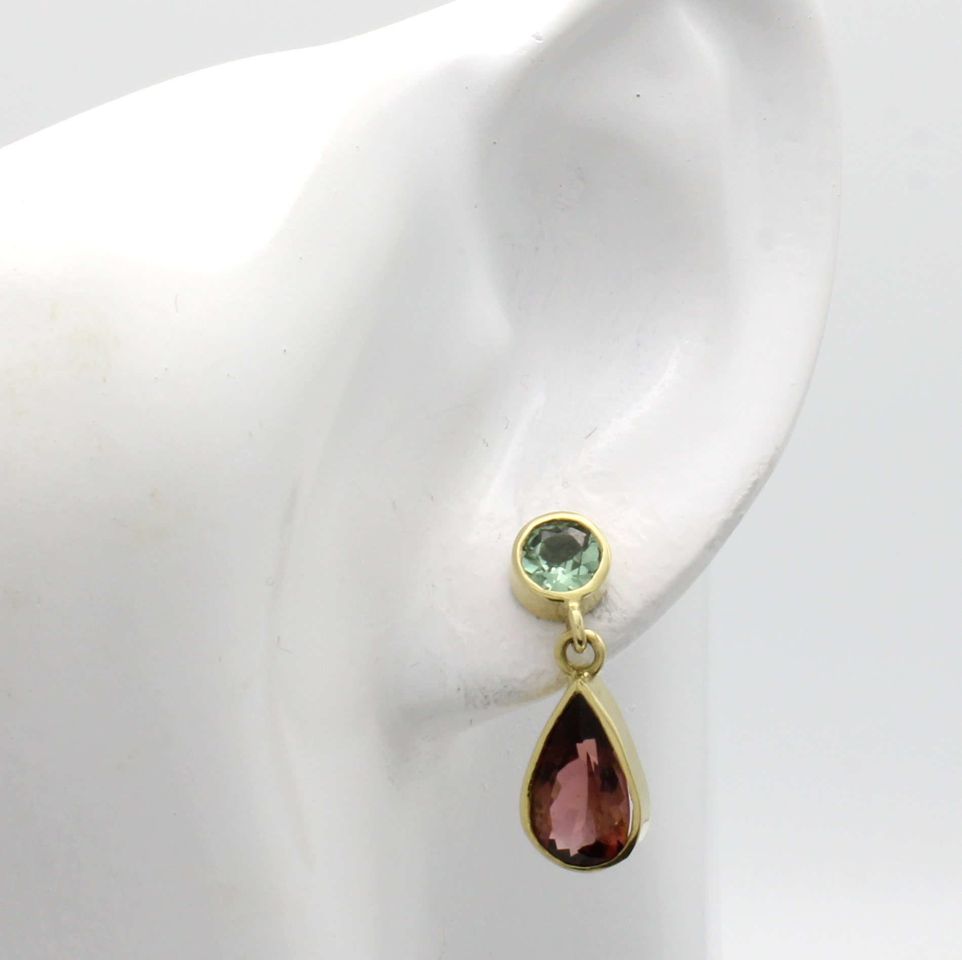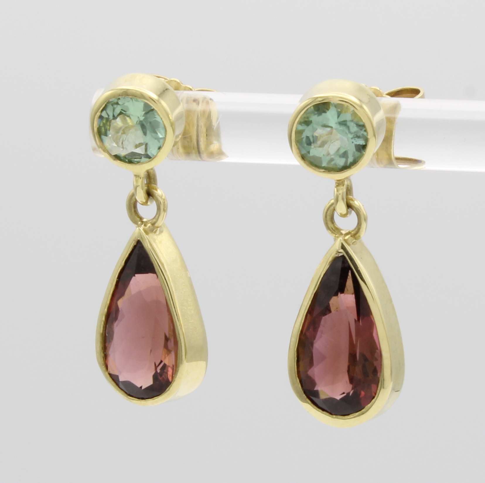 Paar Ohrstecker mit Turmalinen, GG 585/000, runde u. tropfenf. Turmaline in versch. Farben zus. ca. 4.6 ct, bewegl. gearb. Schätzpreis: 2700, - EUR