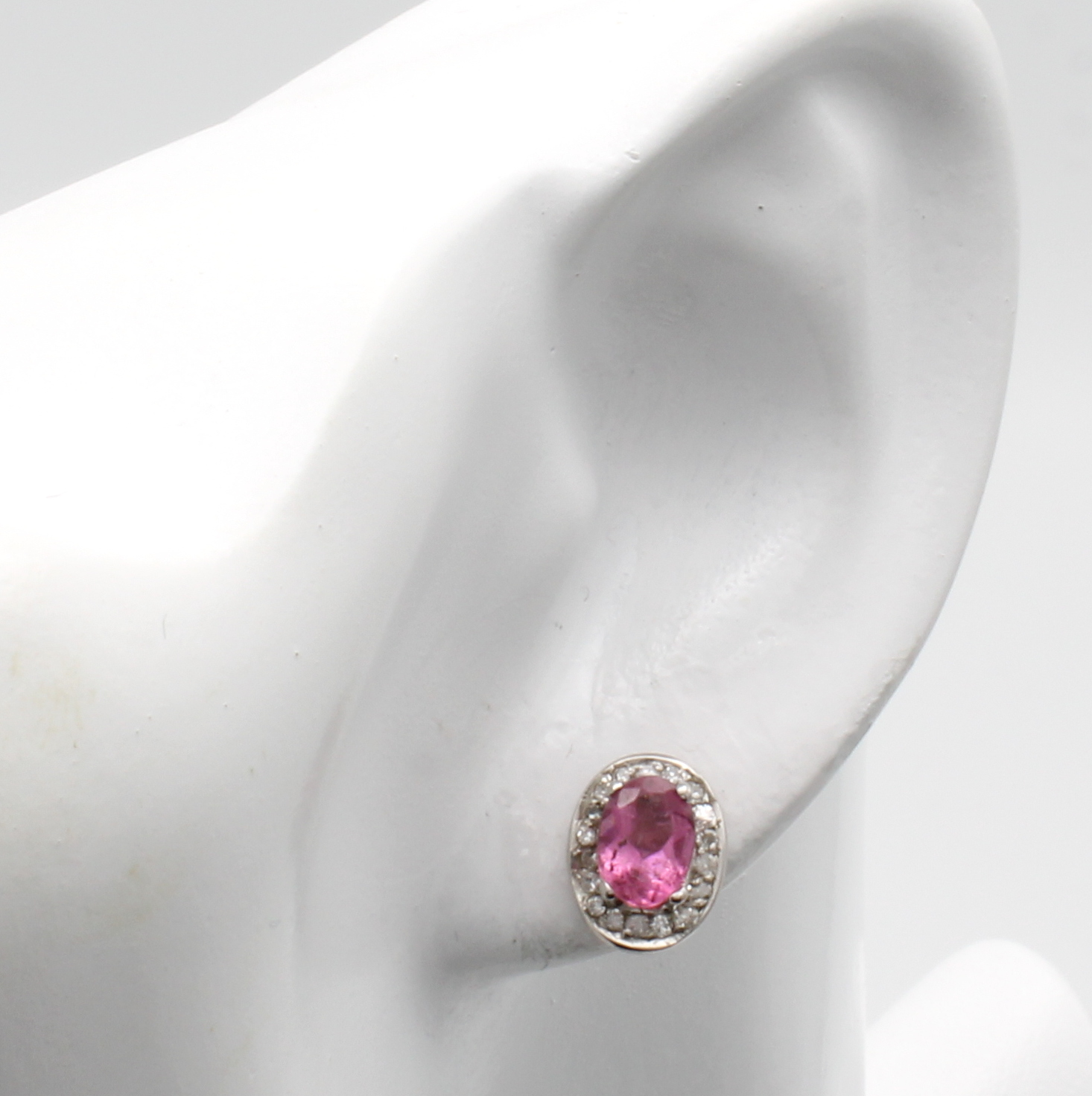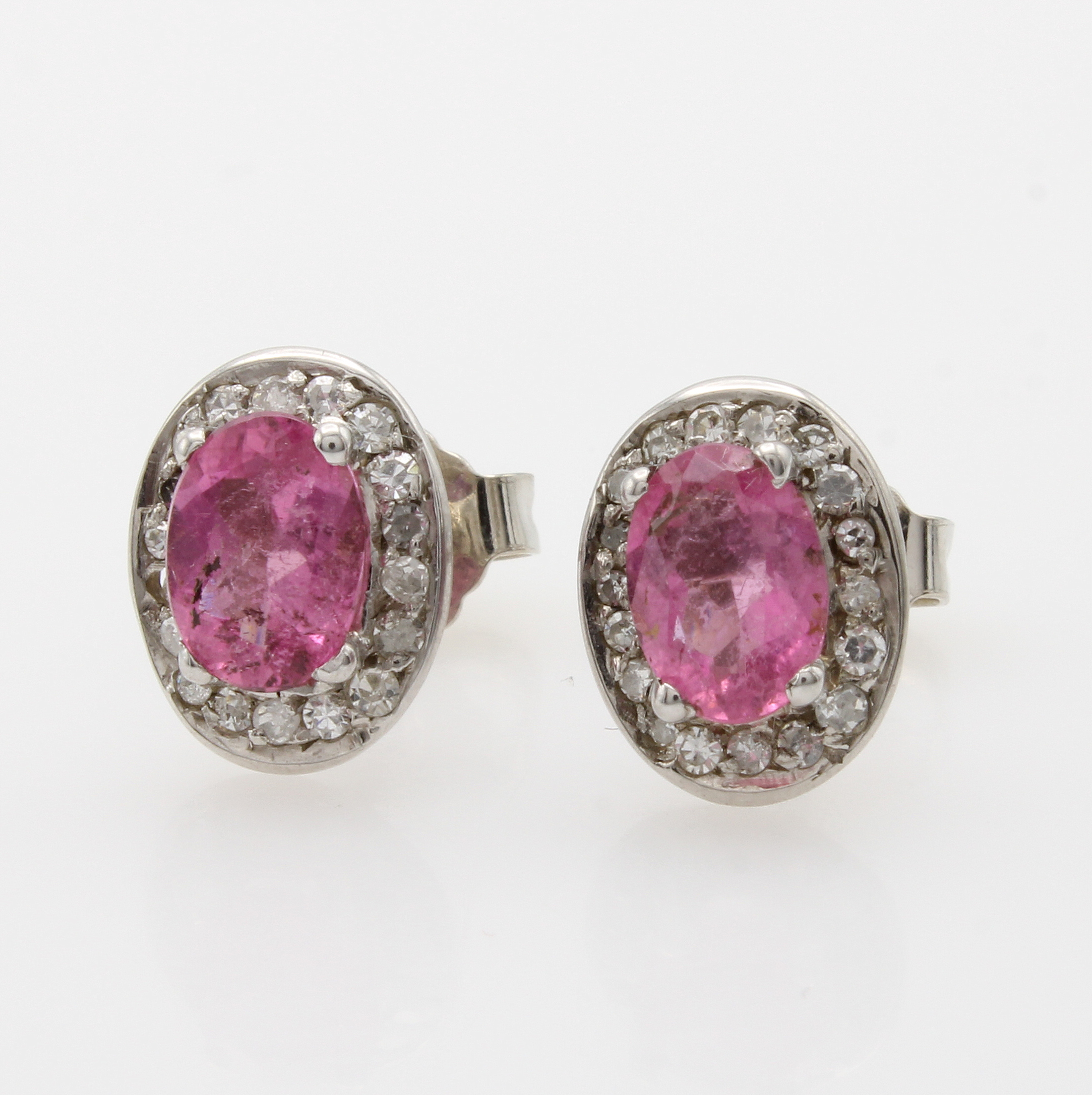 Paar Ohrstecker mit Turmalinen und Diamanten, WG 585/000, 2 ovale, rosa Turmaline in Krappenfassungen zus. ca. 1.3 ct umgeben v. Diam. zus. ca. 0.24 ct Weiß/si Schätzpreis: 2350, - EUR