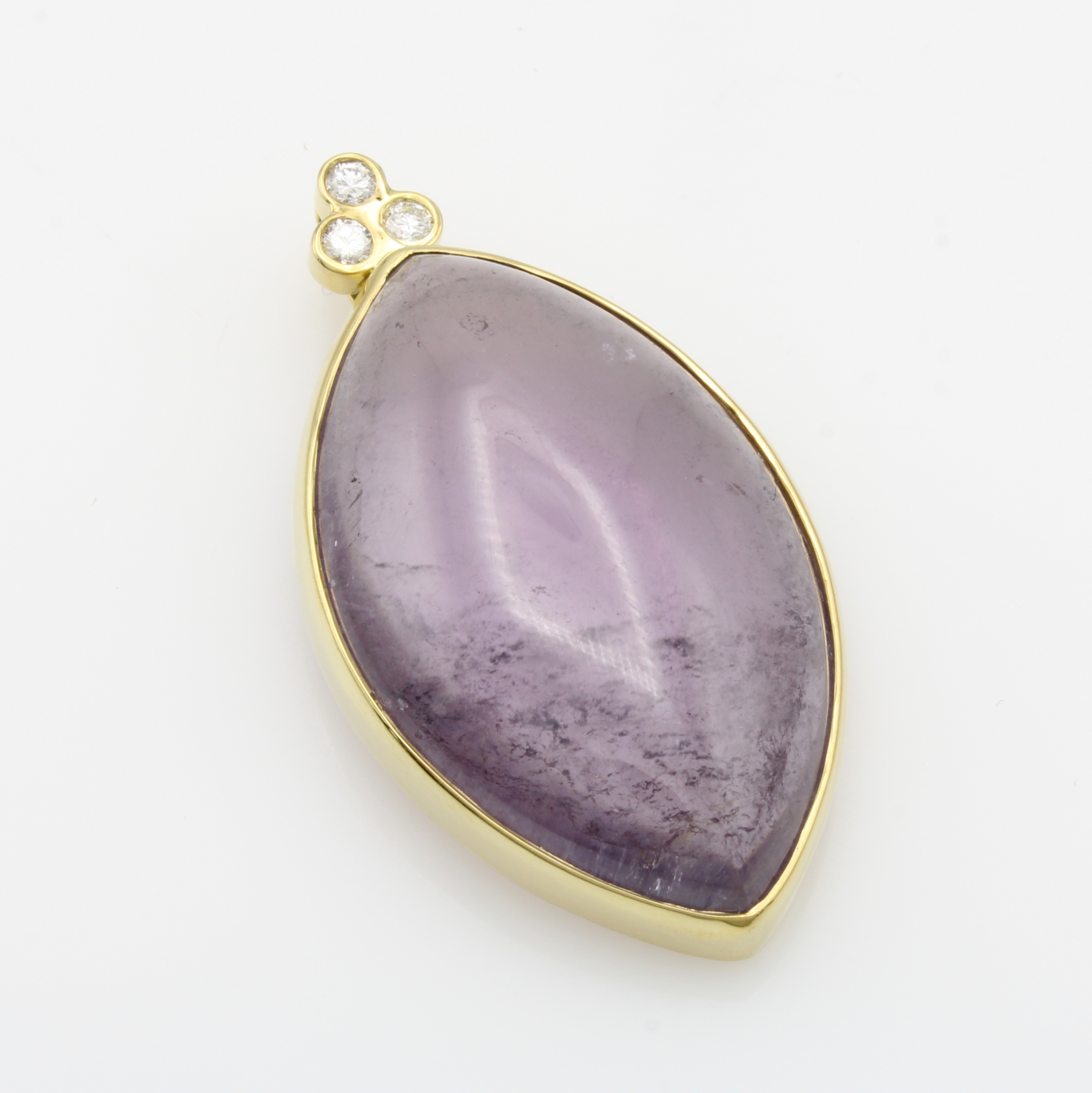 Anhänger mit Turmalin und Brillanten, GG 585/000, navettef., rosa Turmalincabochon ca. 58 ct, 3 Brill. zus. ca. 0.19 ct get./vs-si Schätzpreis: 7200, - EUR