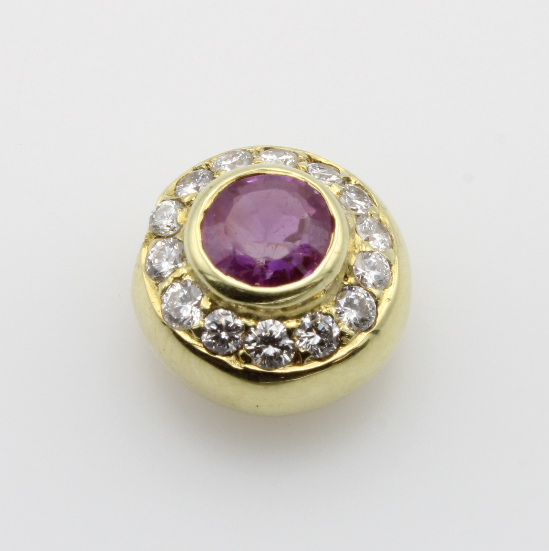 Anhänger mit Rubin und Brillanten, GG 585/ 000, runde Form, Rubin ca. 0.4 ct umgeben v. Brill. zus. ca. 0.25 ct feines Weiß/vs-si Schätzpreis: 1880, - EUR