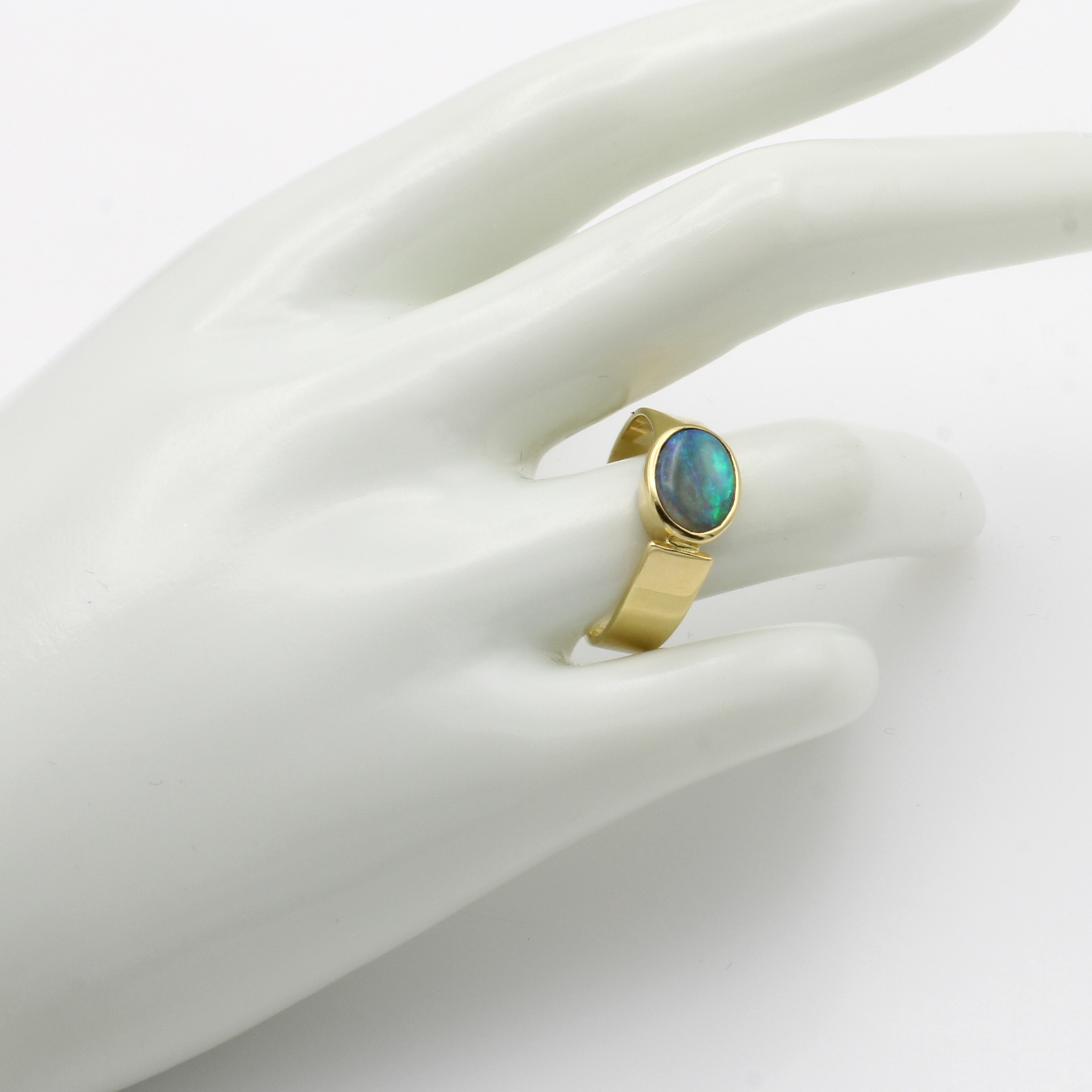 Ring mit Opal, GG 585/000, ovaler Opal ca. 2 ct, Schiene asymmetrisch angesetzt, RW ca. 62 Schätzpreis: 2680, - EUR