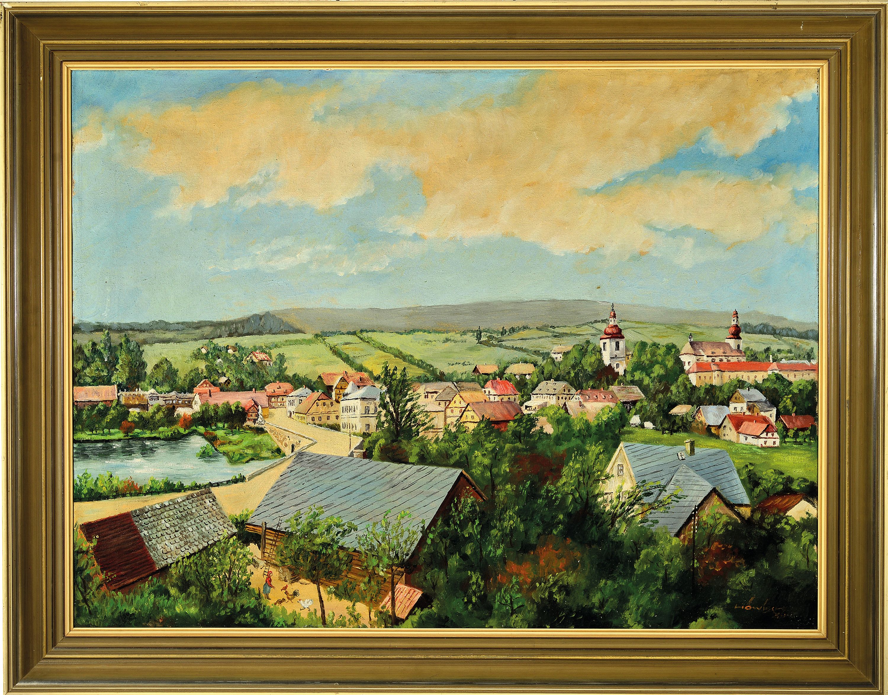Höwisch, datiert (19)34, Blick auf eine Ortschaft, Öl/Lwd, rechts unten sign. und datiert