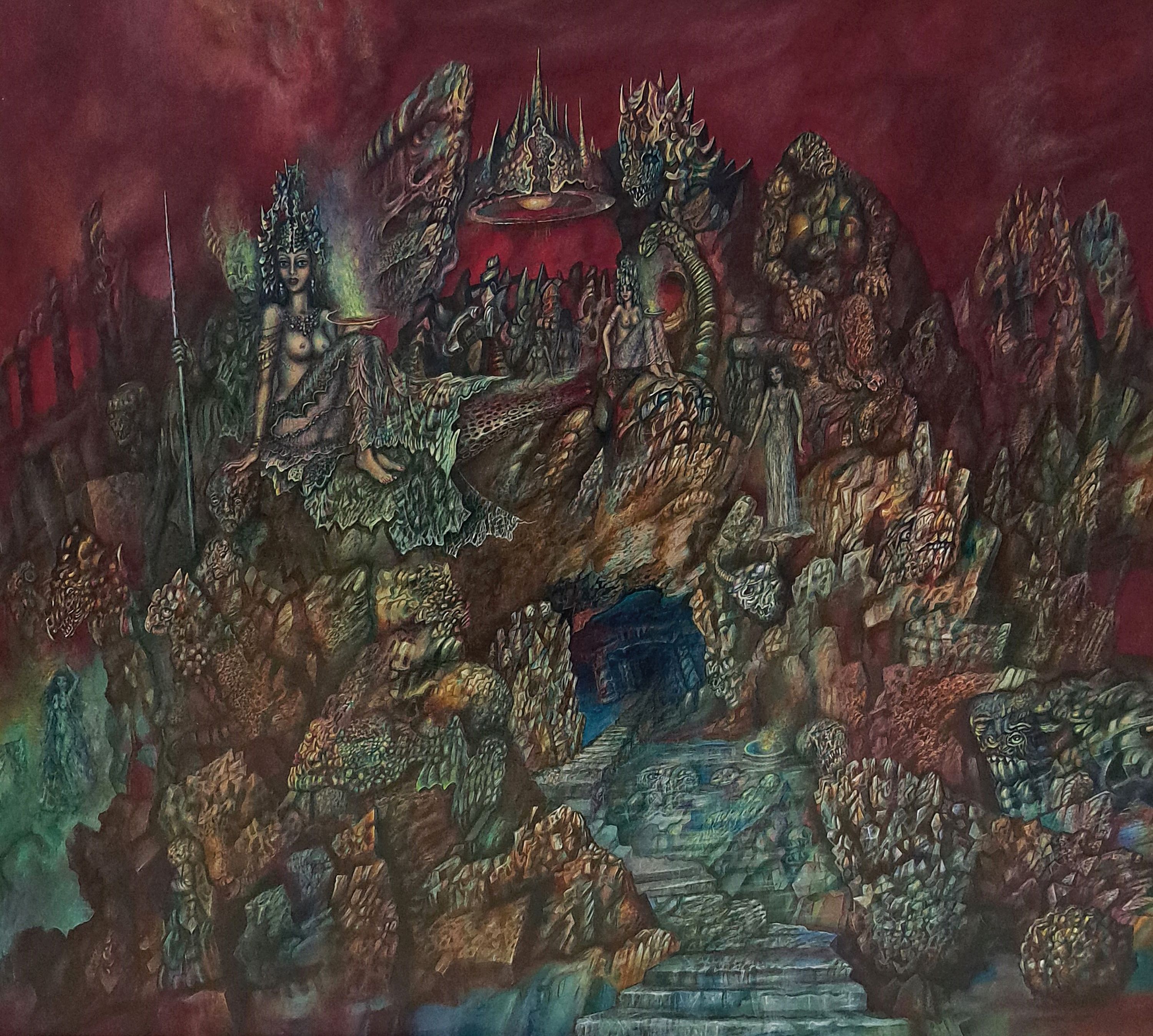 Hellmut Neukirch, geb. 1937 Berlin, vielfigurige surrealistische Komposition, Öl/Holz,
