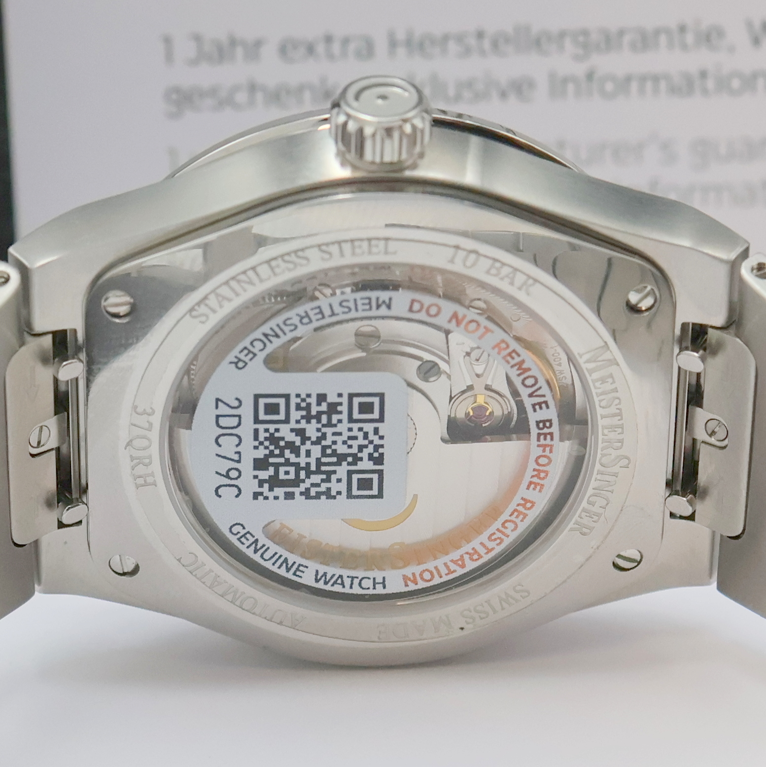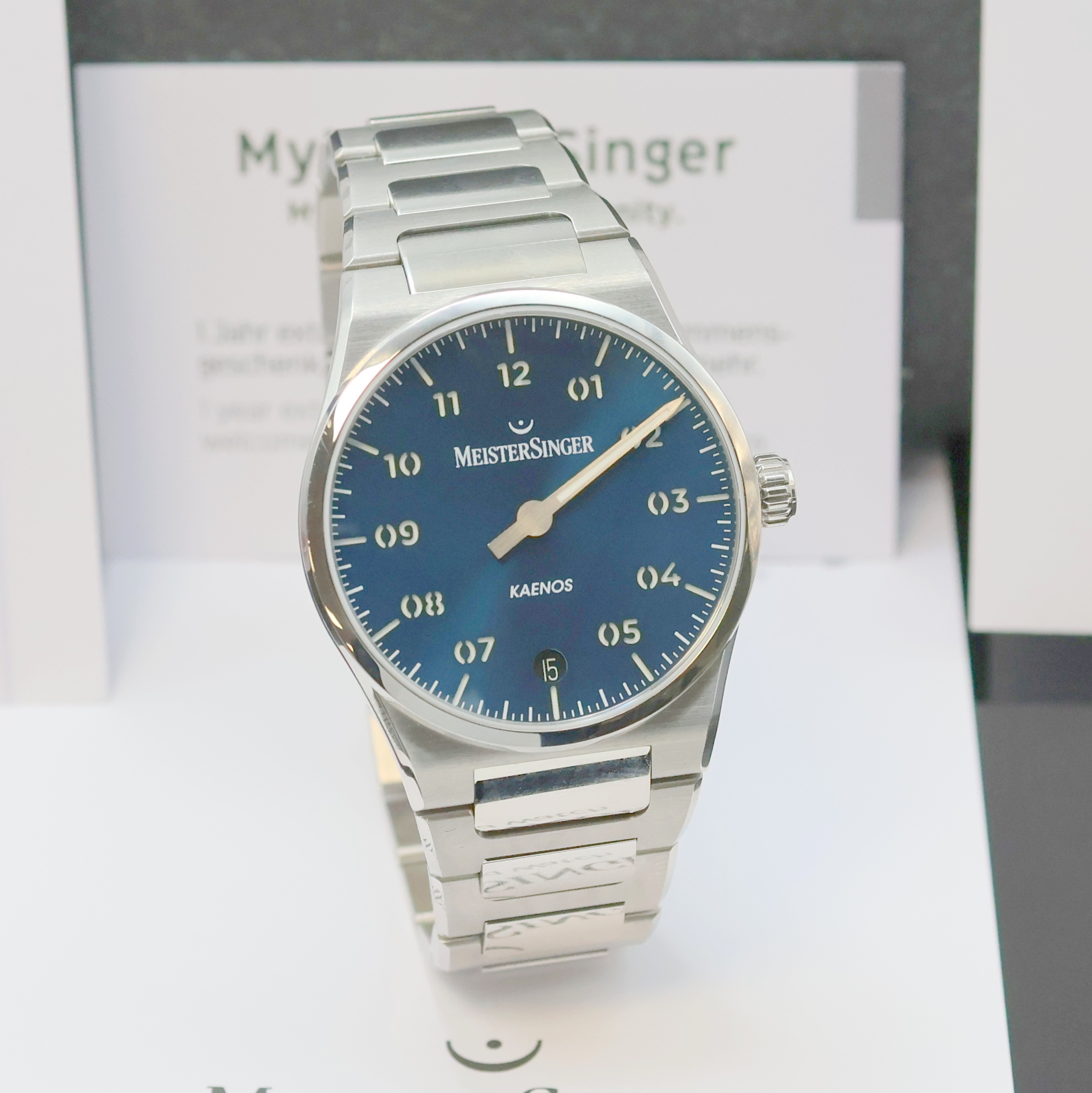 MEISTERSINGER Einzeiger-Herrenarmbanduhr Kaenos Petrol Referenz KS939, Automatik, Edelstahlgeh. inkl. Gliederband m. dopp. Faltschl., beids. vergl., Boden 4-fach verschr., Datum bei 6, D. ca. 40 mm, L. ca. 21cm, orig. Etui & Pap., EZ 1