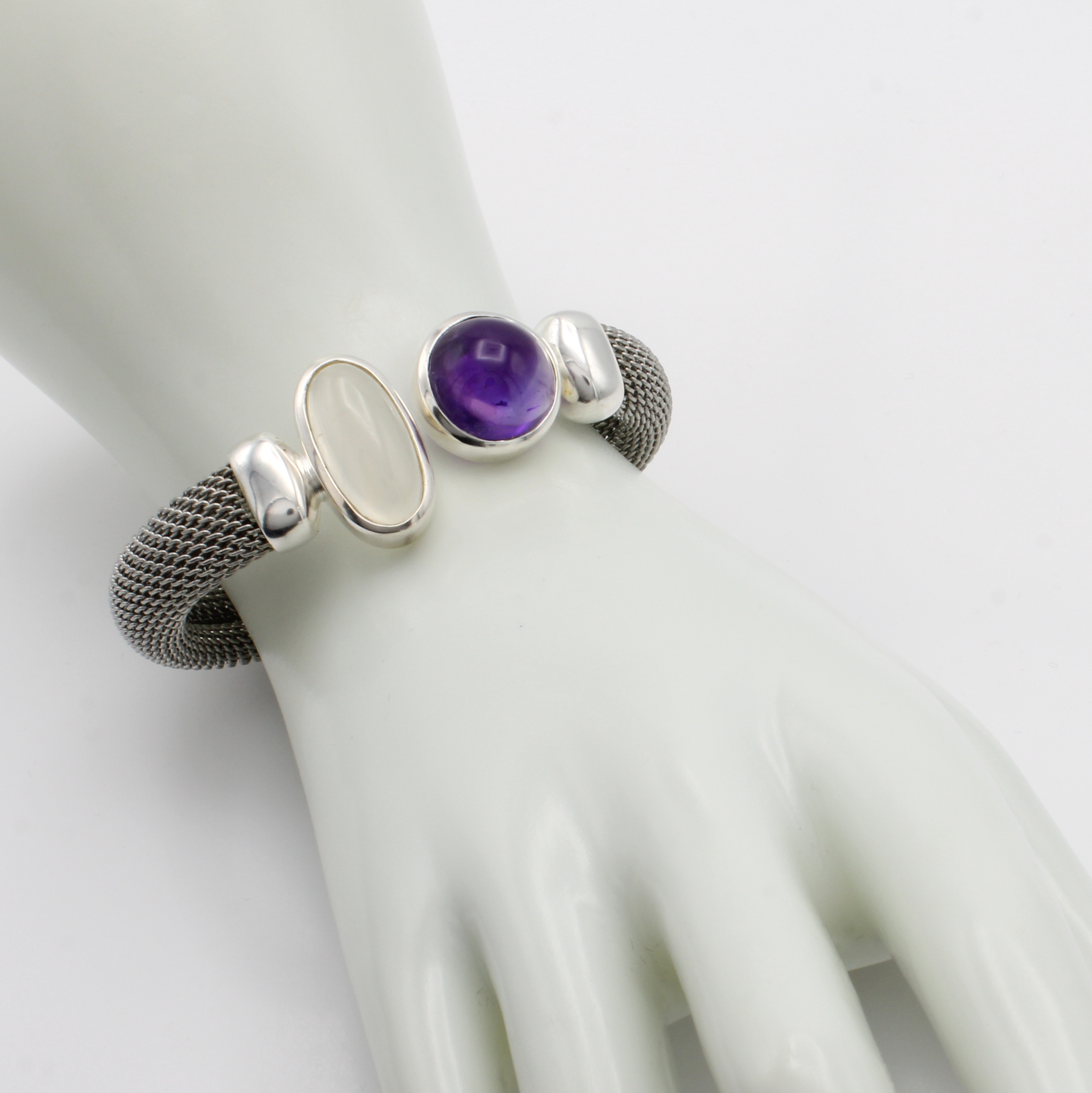 Armreif mit Girasol und Amethyst, Stahl, Endkappen u. Fassungen Silber, ovaler Girasol, runder Amethyst, offen u. l. flexibel gearb. Schätzpreis: 500, - EUR