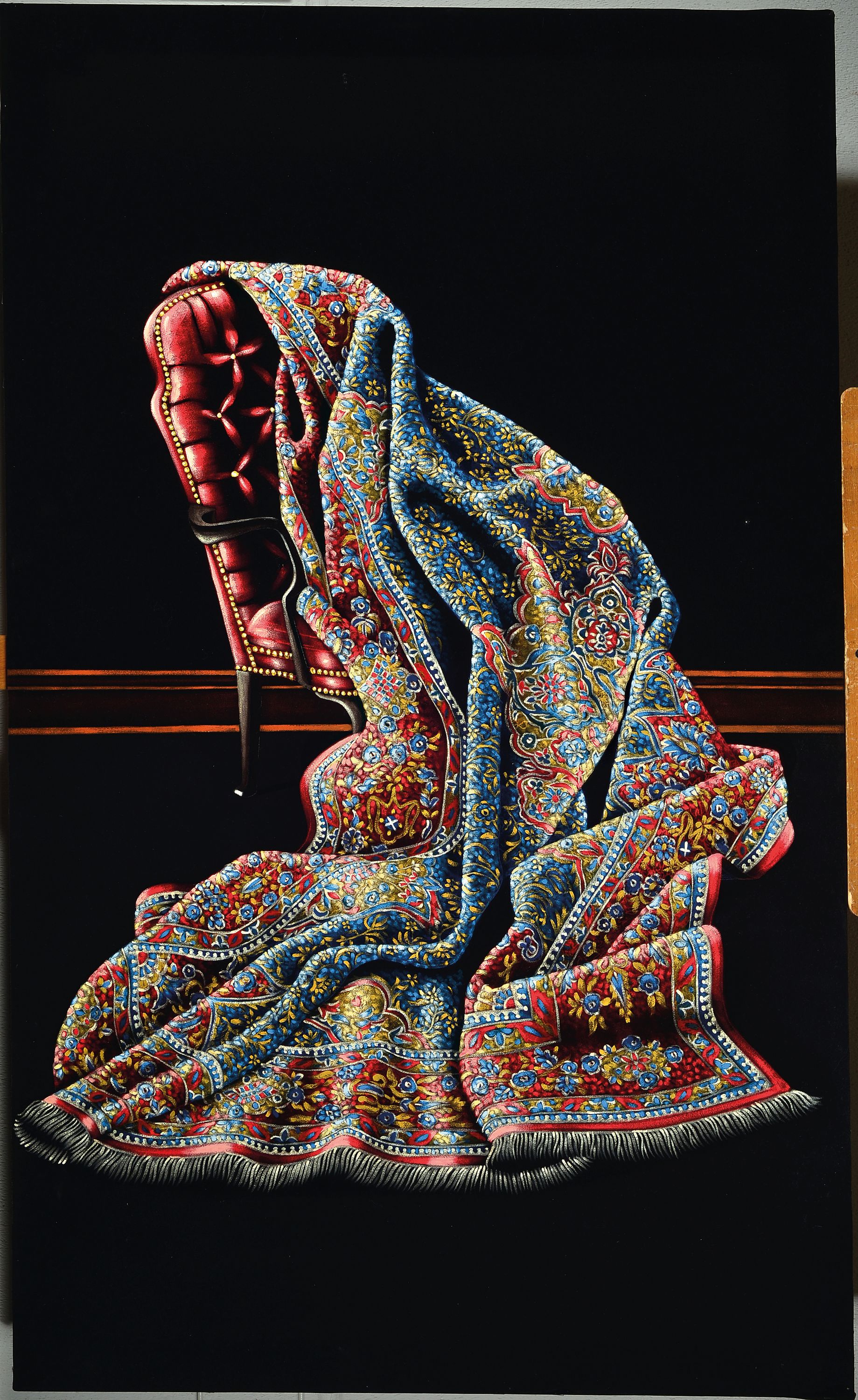 Parinaz Bajalanlou, geb. 1985, iranische Künstlerin, Teppich auf Stuhl drapiert,