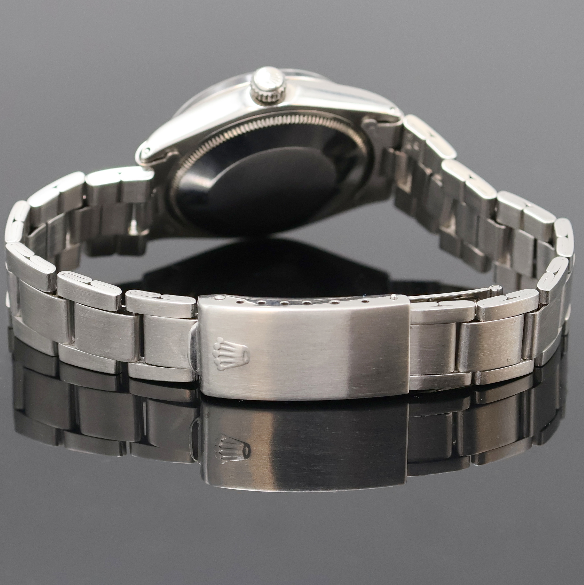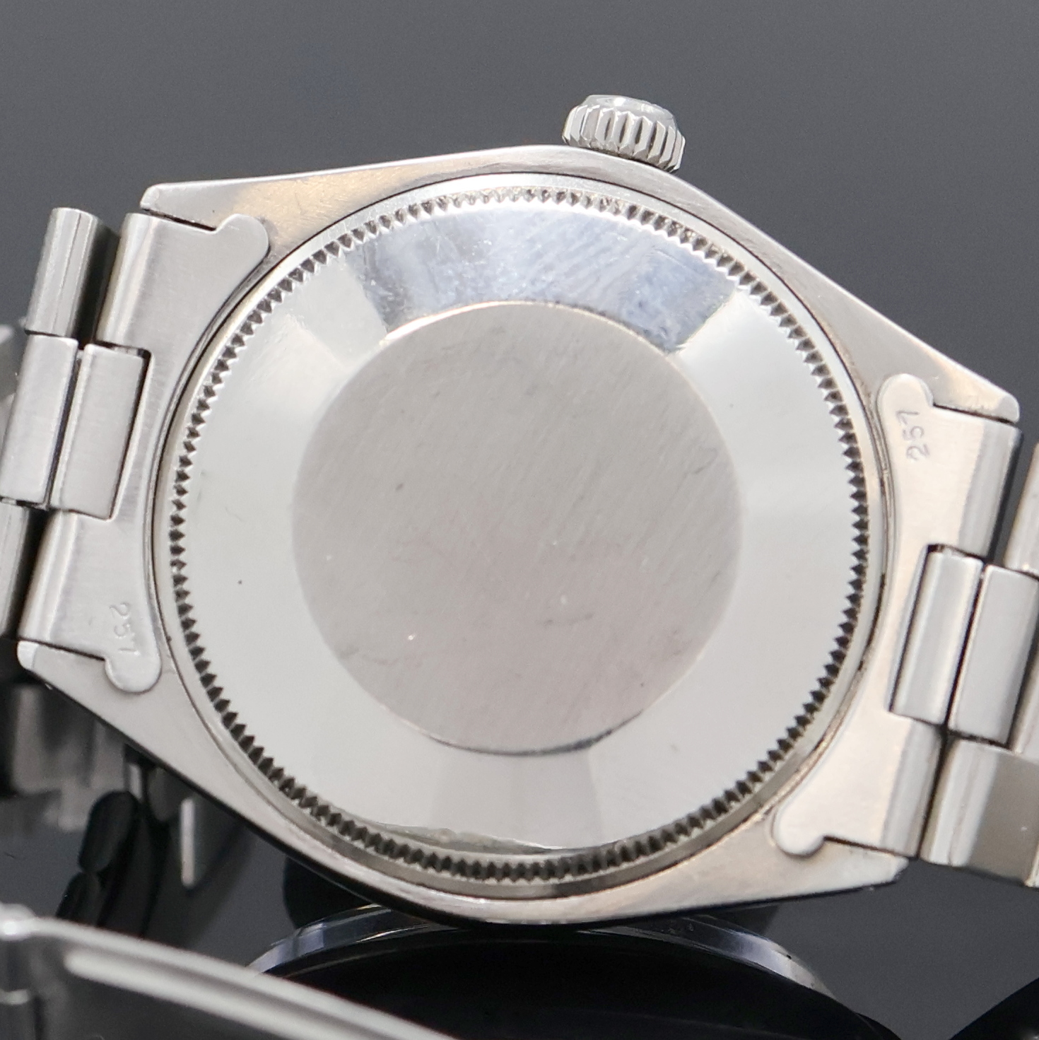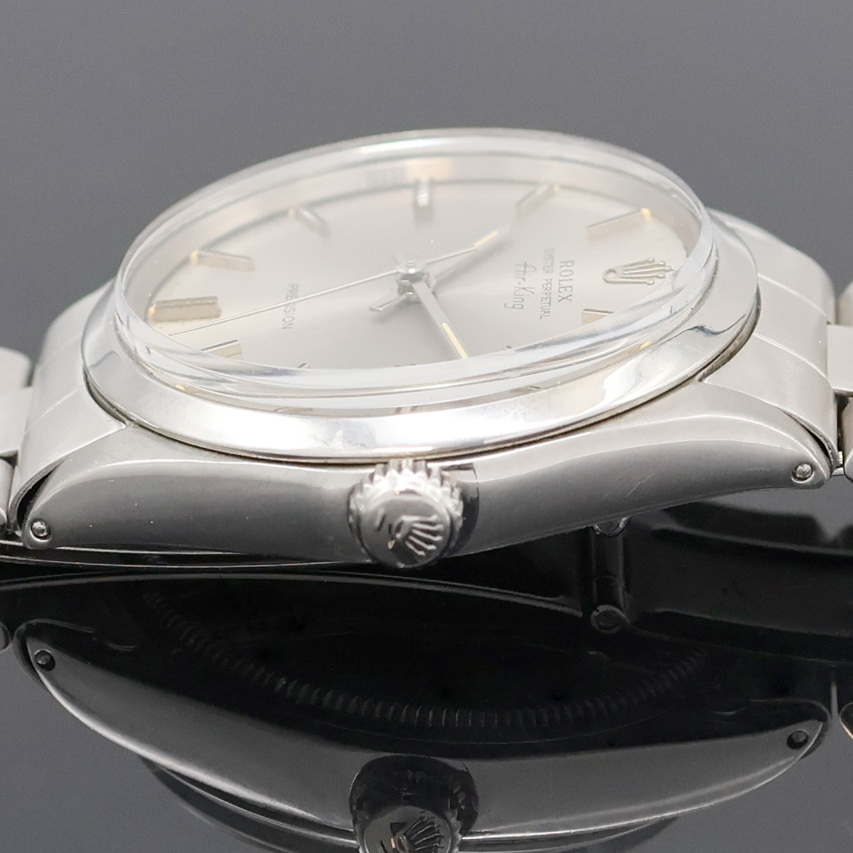 ROLEX Herrenarmbanduhr Oyster Perpetual Air-King Precision Referenz 5500/1002, Automatik, Schweiz lt. Bodenstempel 1. Quartal 1970, Edelstahlgeh. inkl. gefaltetem Oysterband Ref. 7835 mit Endlinks 257, Boden und Krone verschr., ab Herst. wasserd., silb. Zifferbl. m. aufgel. Std.-Zeichen und Tritium-Leuchtpunkten altersbed. fl., Anz. v. Std., Min. und Zentralsek., 26 St., Kal. 1520, Kif.-Stoßs., D. ca. 34 mm, L. ca. 20 cm, Nutzsp.altersbed., Überh. empf., EZ 2-3, aus Sammlungsauflösung