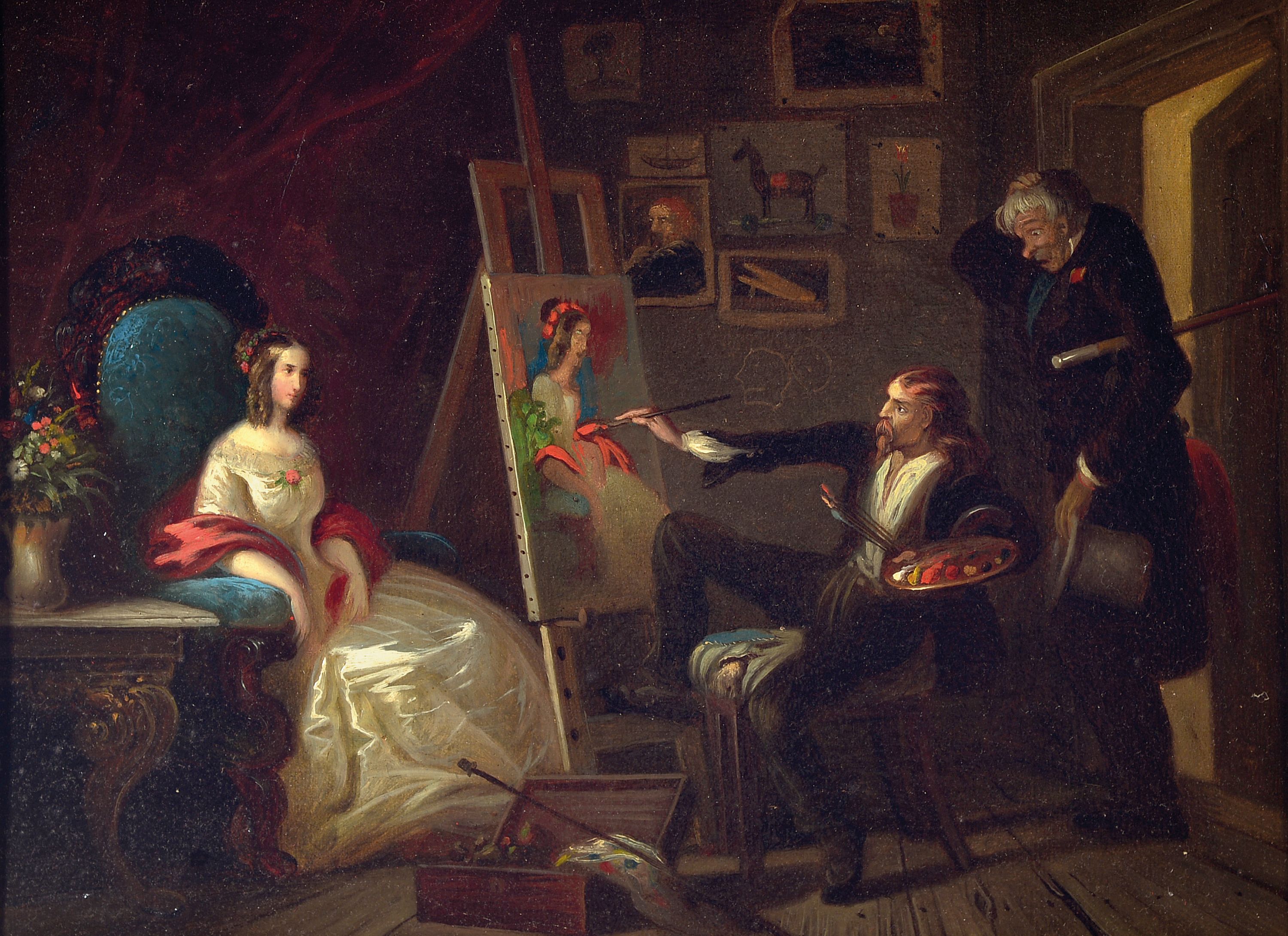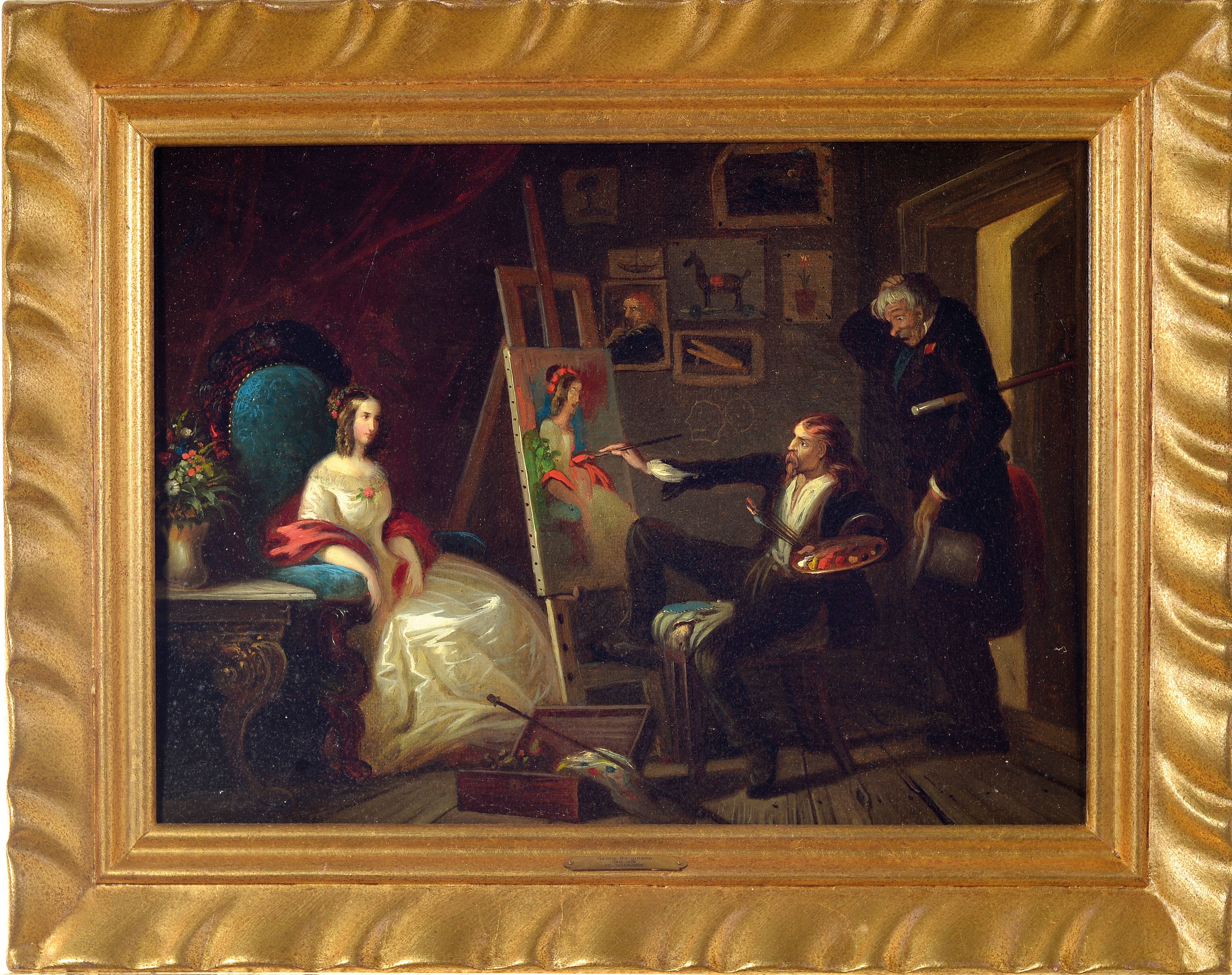 im Atelier, im Hintergrund erschrocken beäugt vom Auftraggeber, Öl/Holz, ca. 29x40cm,