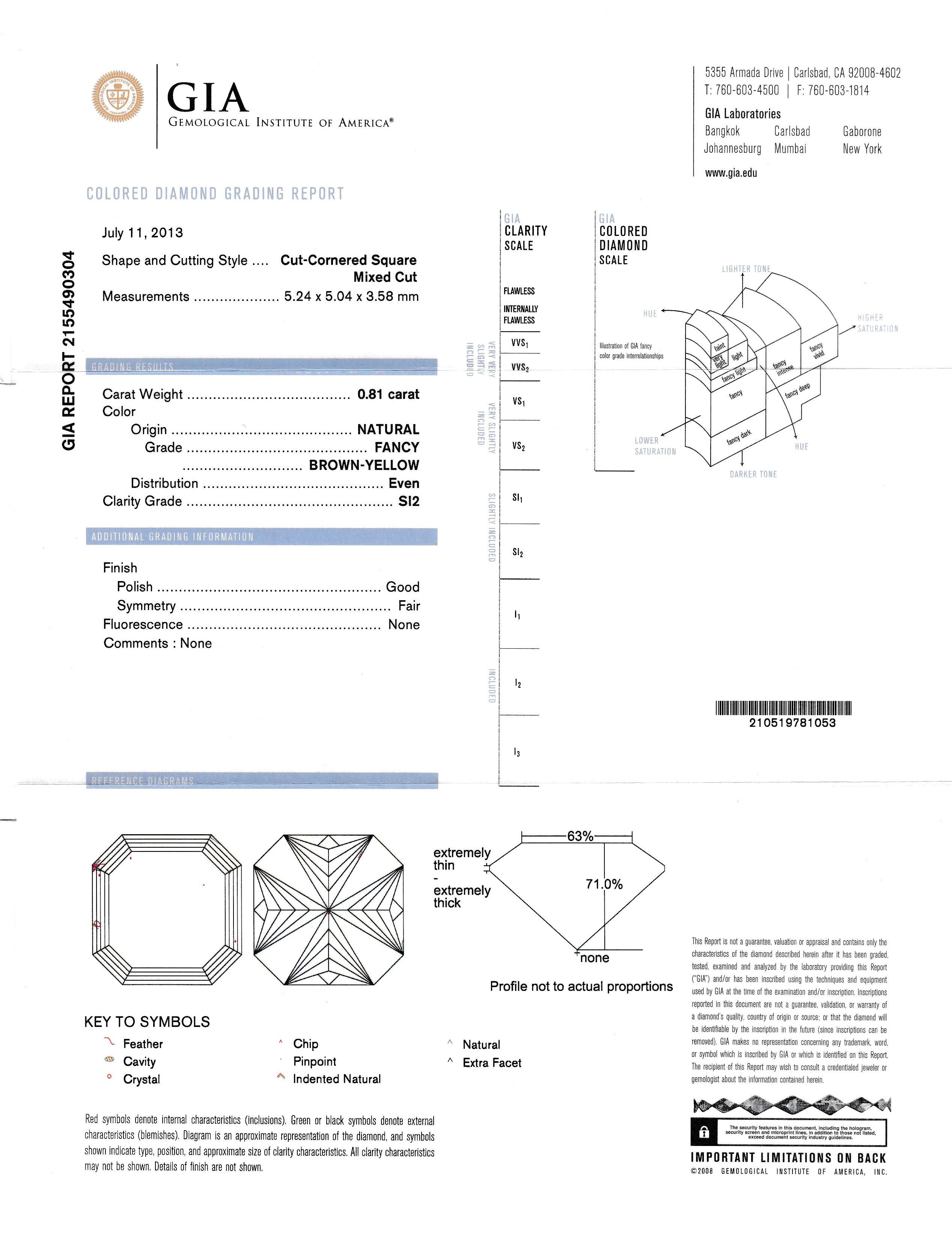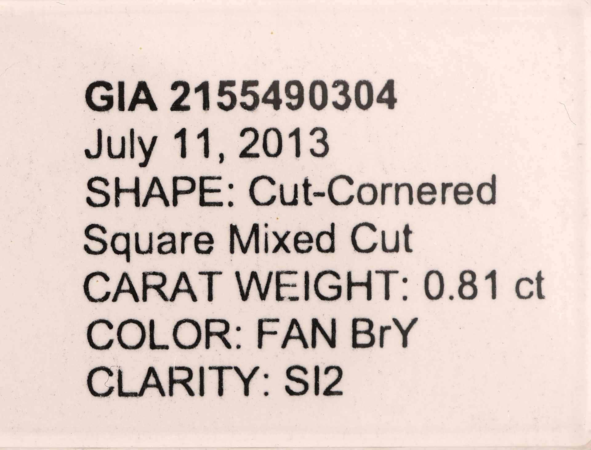 Loser Diamant, 0.81 ct Natural Fancy Brown- Yellow/si2, Cornered Square Mixed Cut, verschweißt, GIA-Expertise