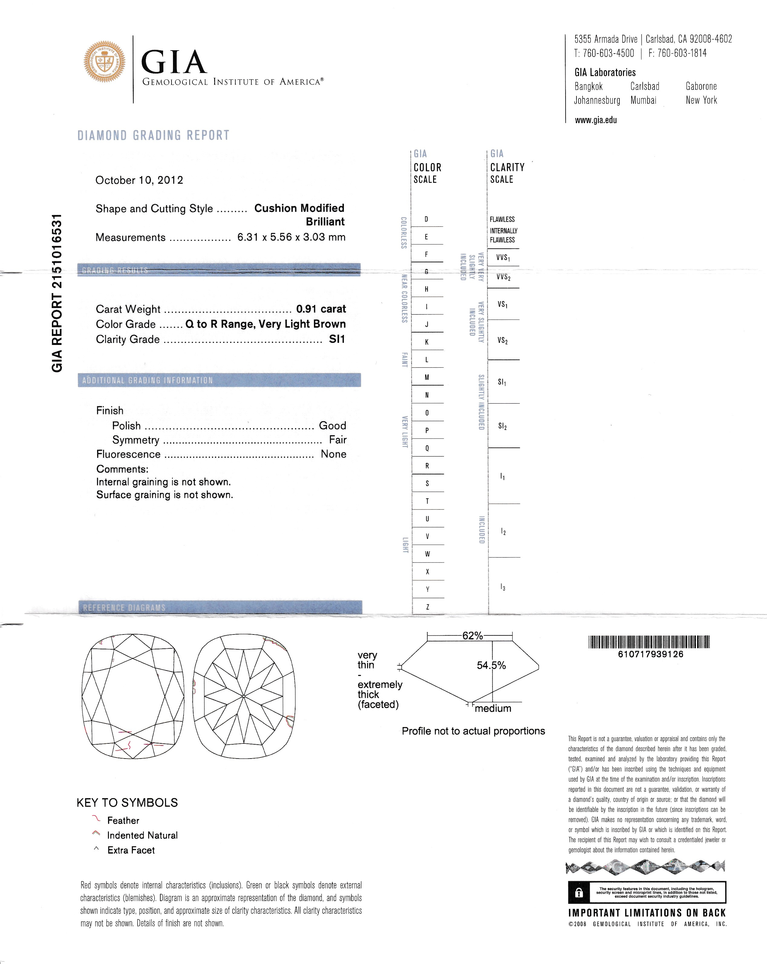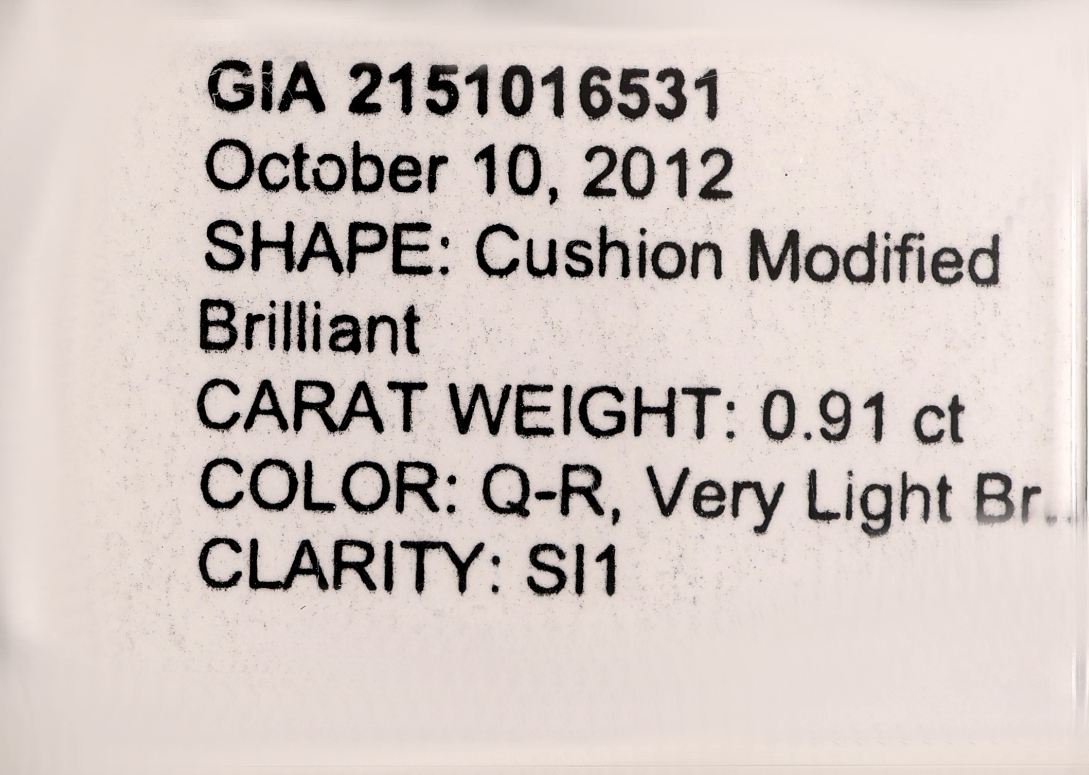 Loser Diamant im modifizierten Kissenschliff 0.91 ct Very light Brown (Q-R)/si1, verschweißt, GIA-Expertise