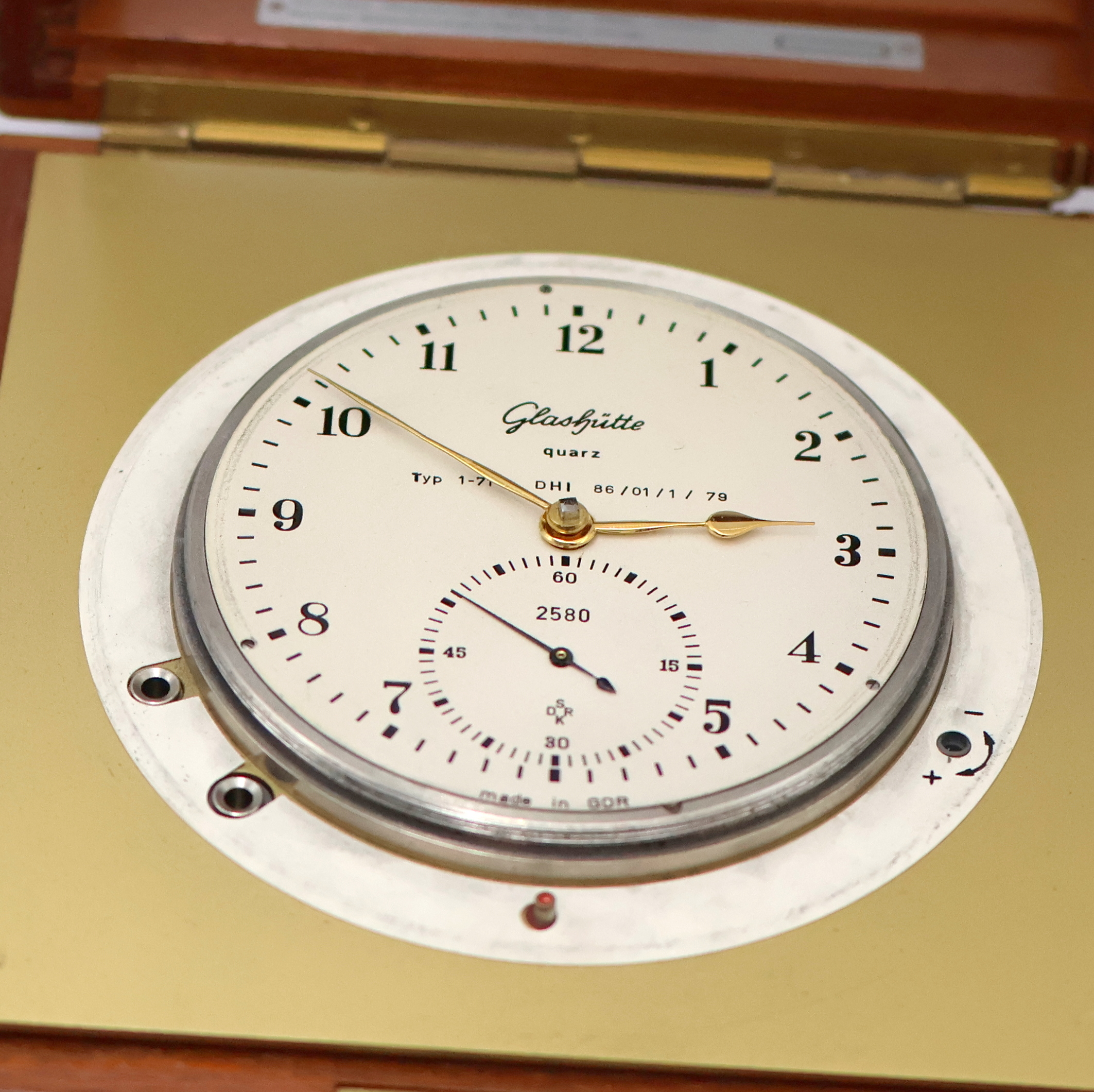 Glashütte Quartz Marinechronometer Type 1-71, DDR um 1980, 2-tlg. vergl. Holzkasten,