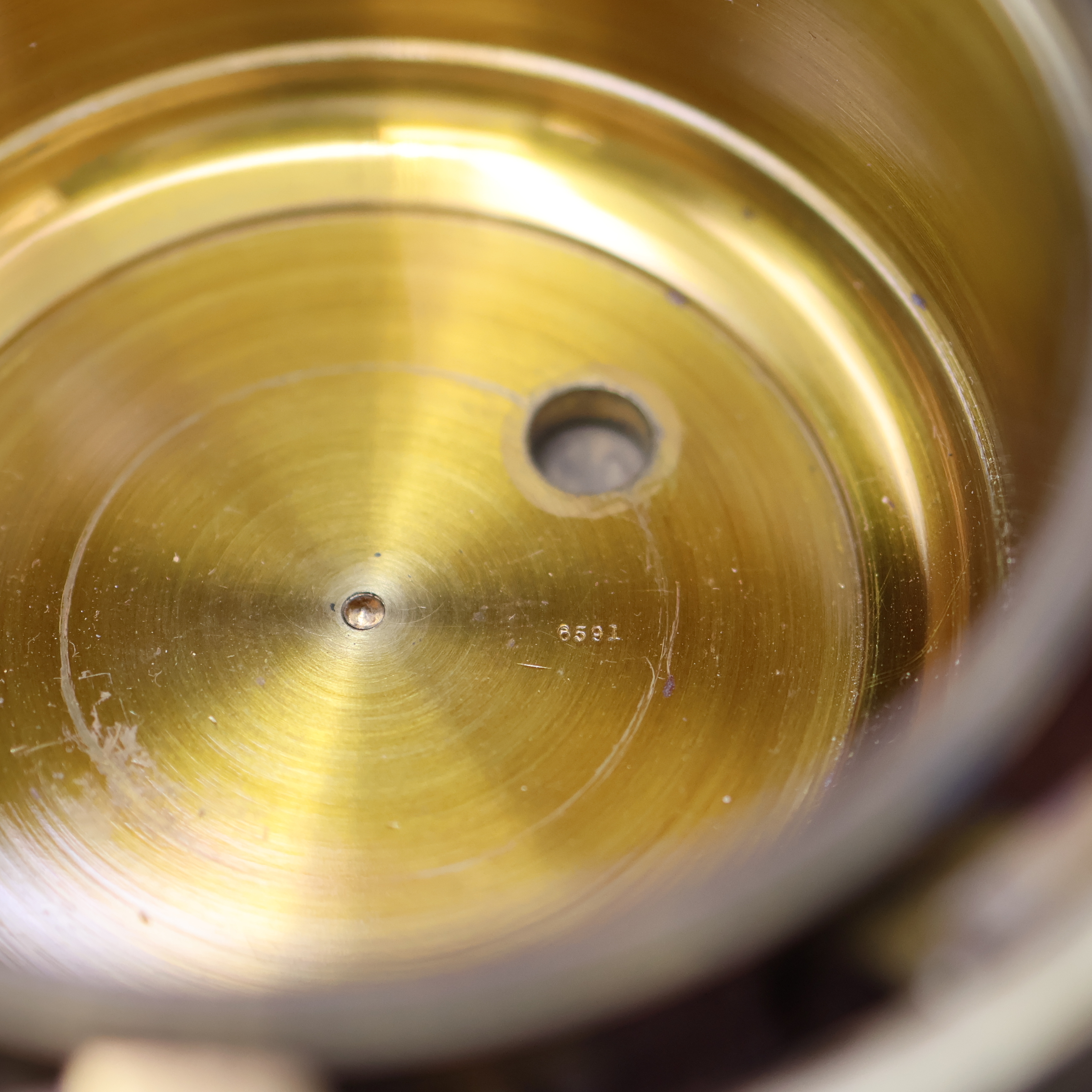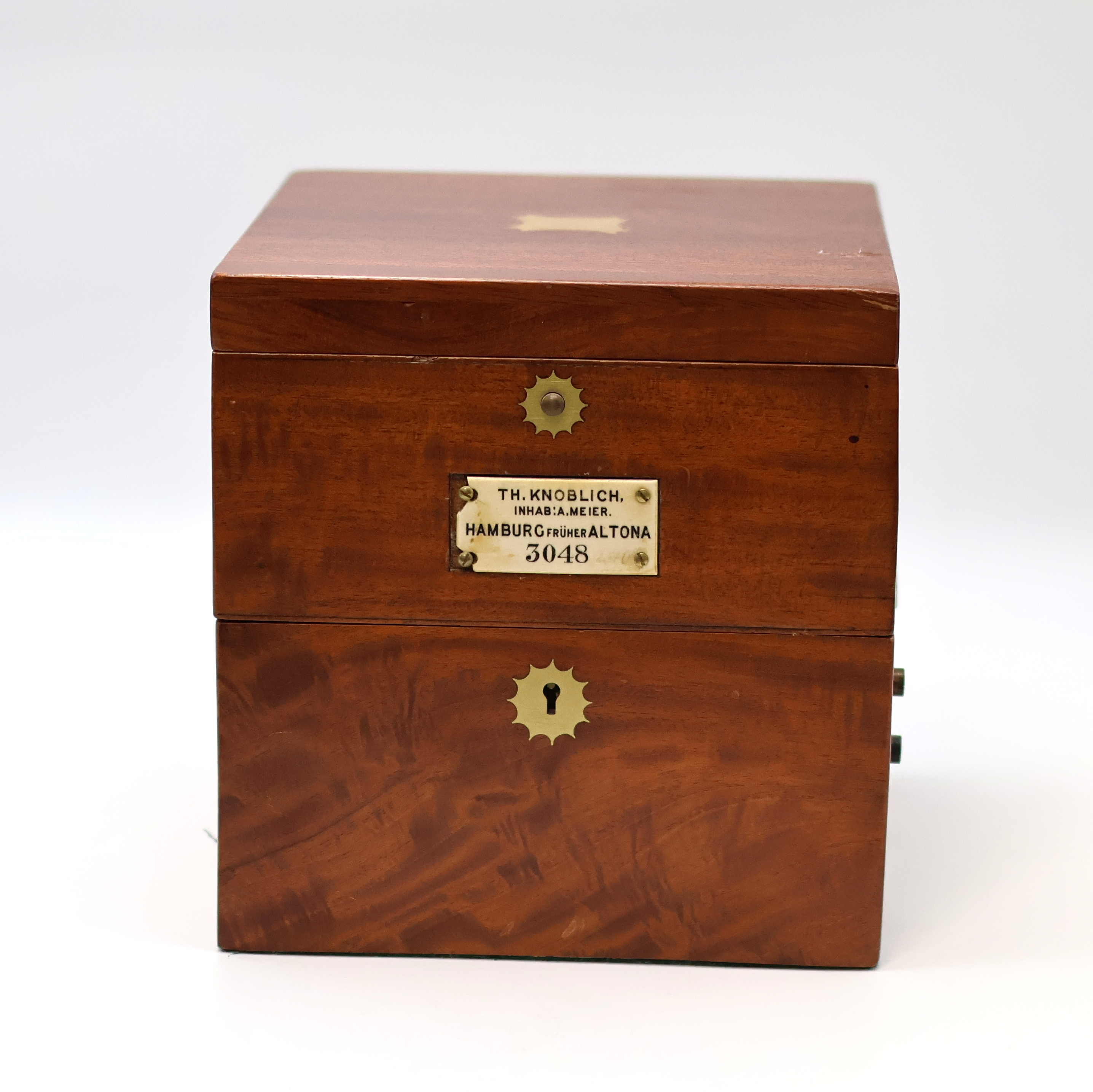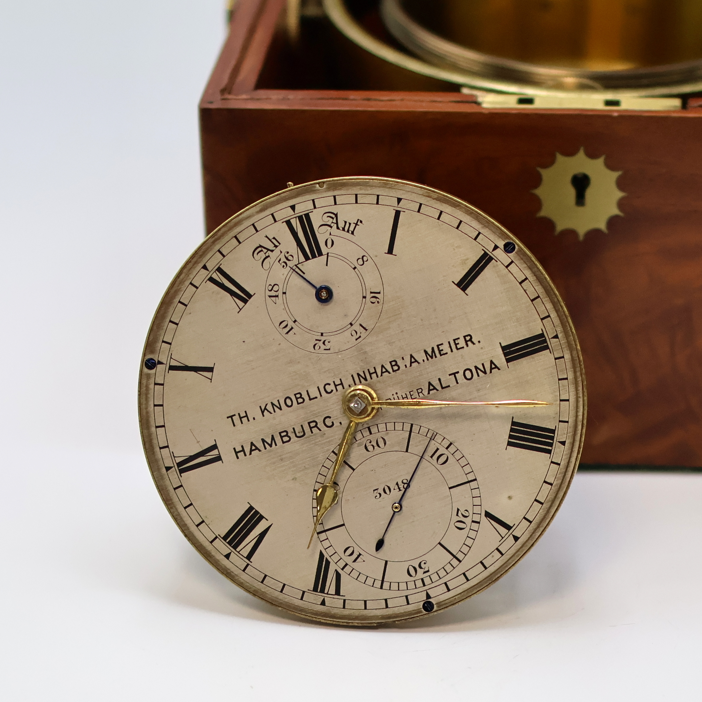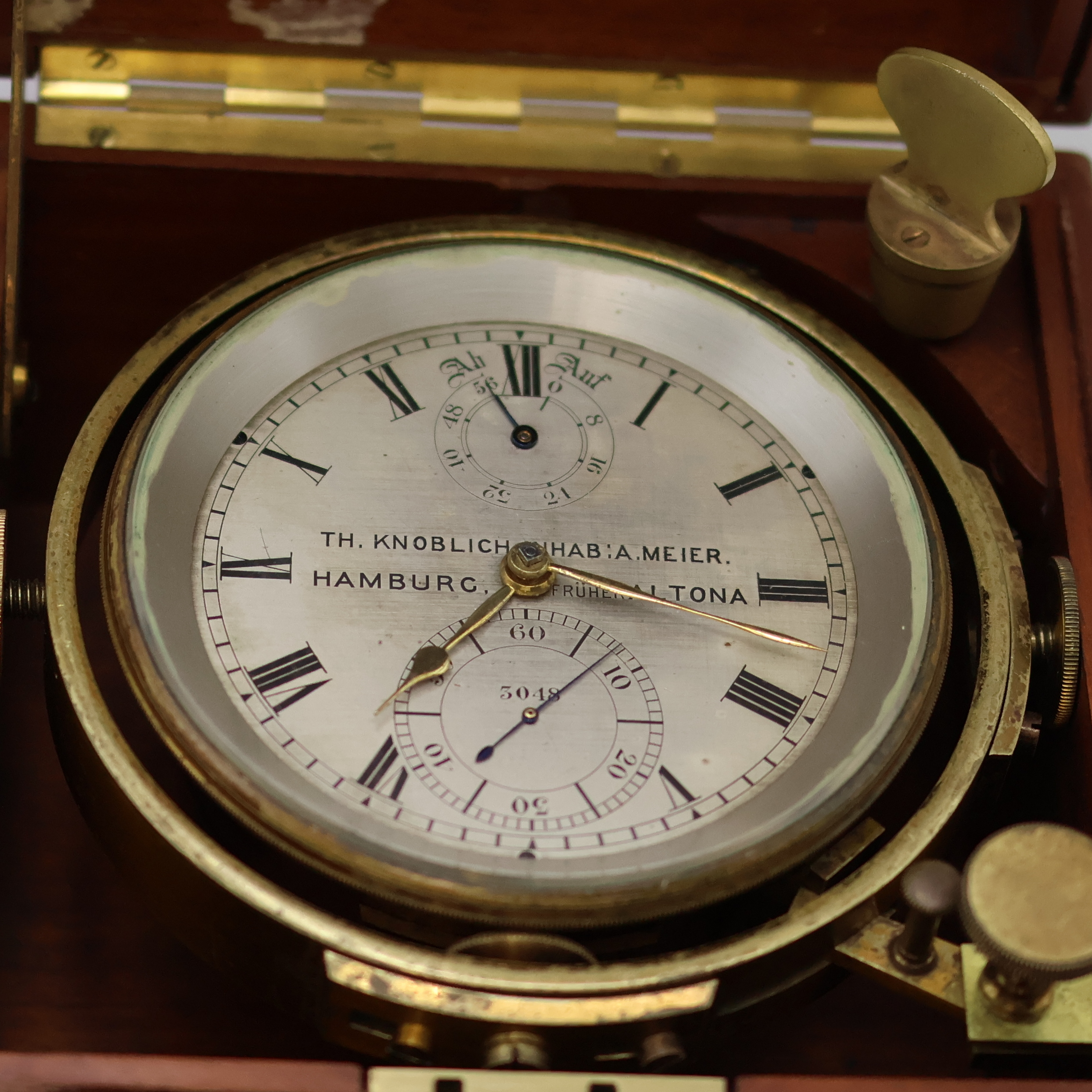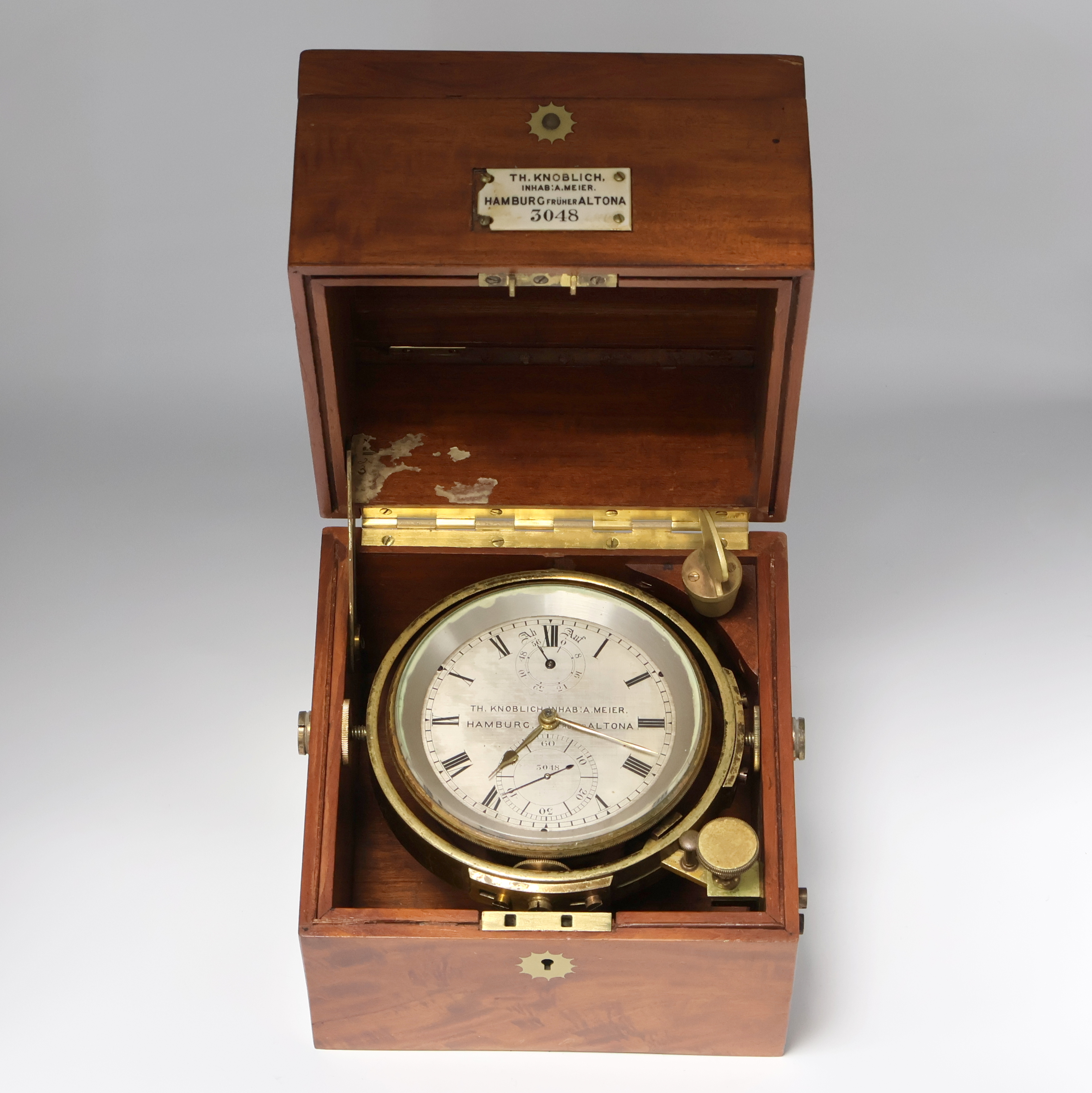 Th. KNOBLICH Inhab. A.Meier, Hamburg früher Altona Marinechronometer Nr. 3048, England/ Deutschland um 1910, 3-tlg. Holzkasten rest., Deckel später, Glas zu ers., kardanisch aufgehängtes u. zaponiertes Messinggeh., Lünette verschr., orig. Signatur-Plakette besch., silb. Zifferbl. pat./fl., 56-Std. Auf & Ab Anzeige b. 12, große exzentr. Sek. b. 6, orig. Zeiger, pol. Messingwerk v. Mercer Nr. 6501, Kette/Schnecke, freistehende Gangfeder, Komp.-Unruh m. zyl. Spir., M. ca. 19 x 18 x 18 cm, Überh. unerl., EZ 3-4, aus Sammlungsauflösung