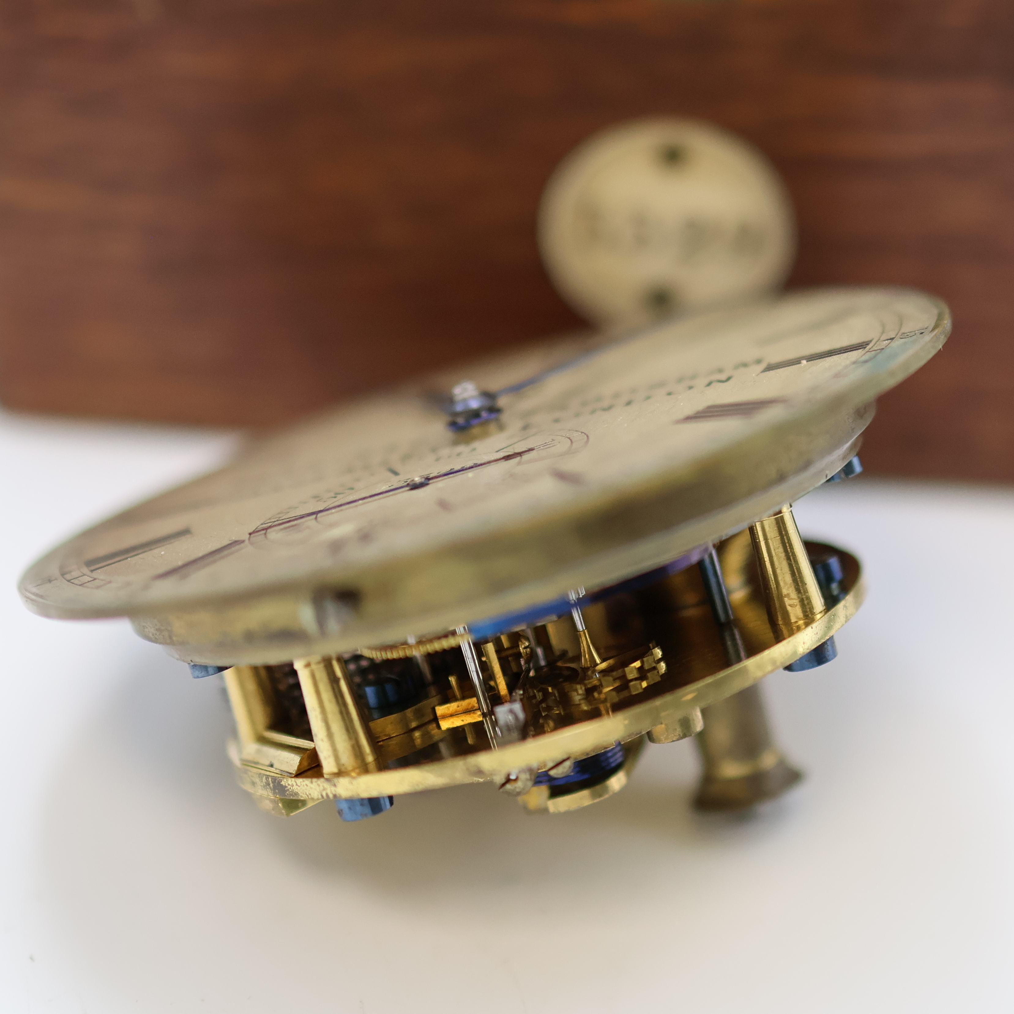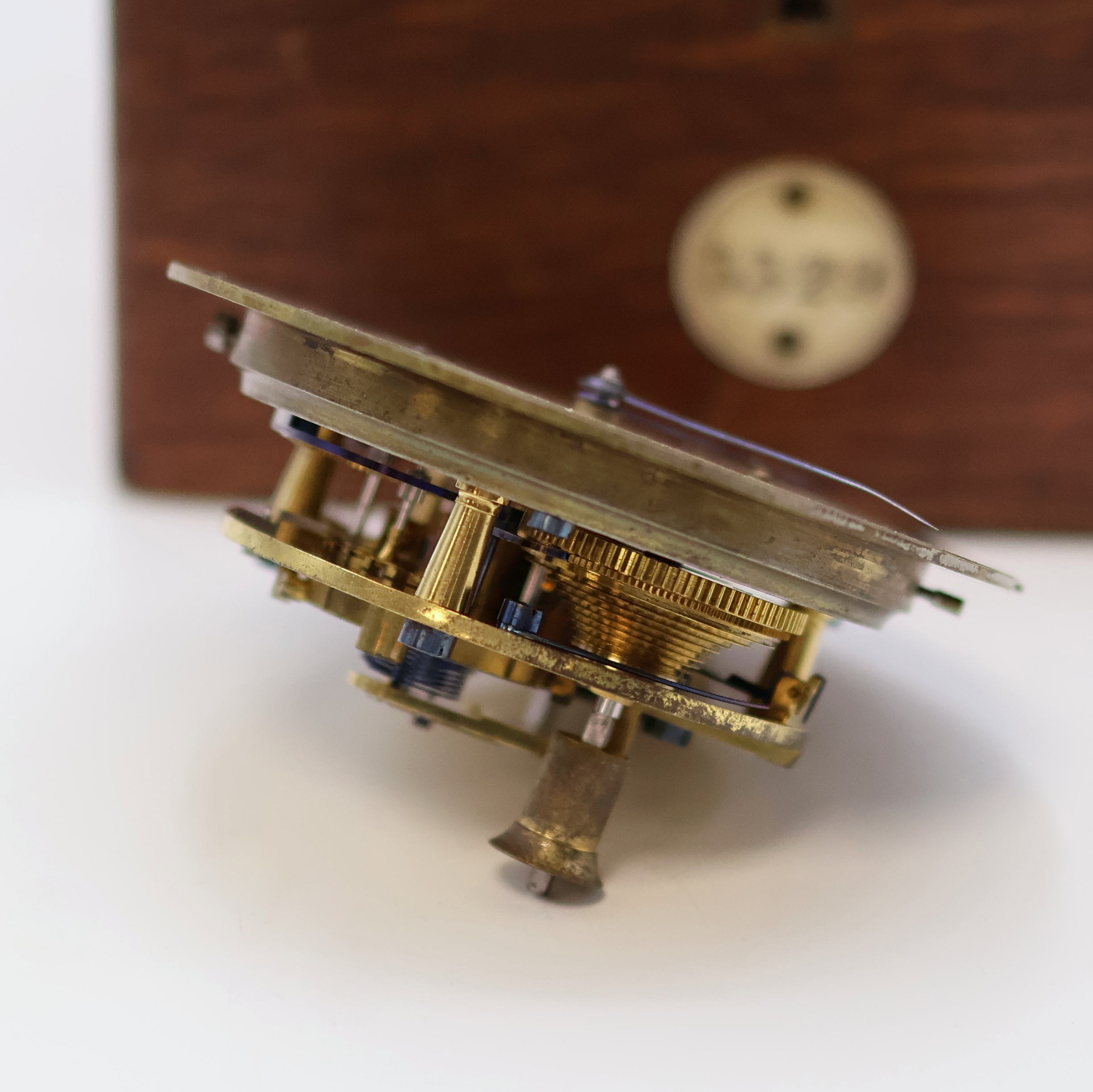 2-tlg. Holzkasten, orig. Nummer- u. Signatur- Schild, silb. Zifferbl. pat., gebl.