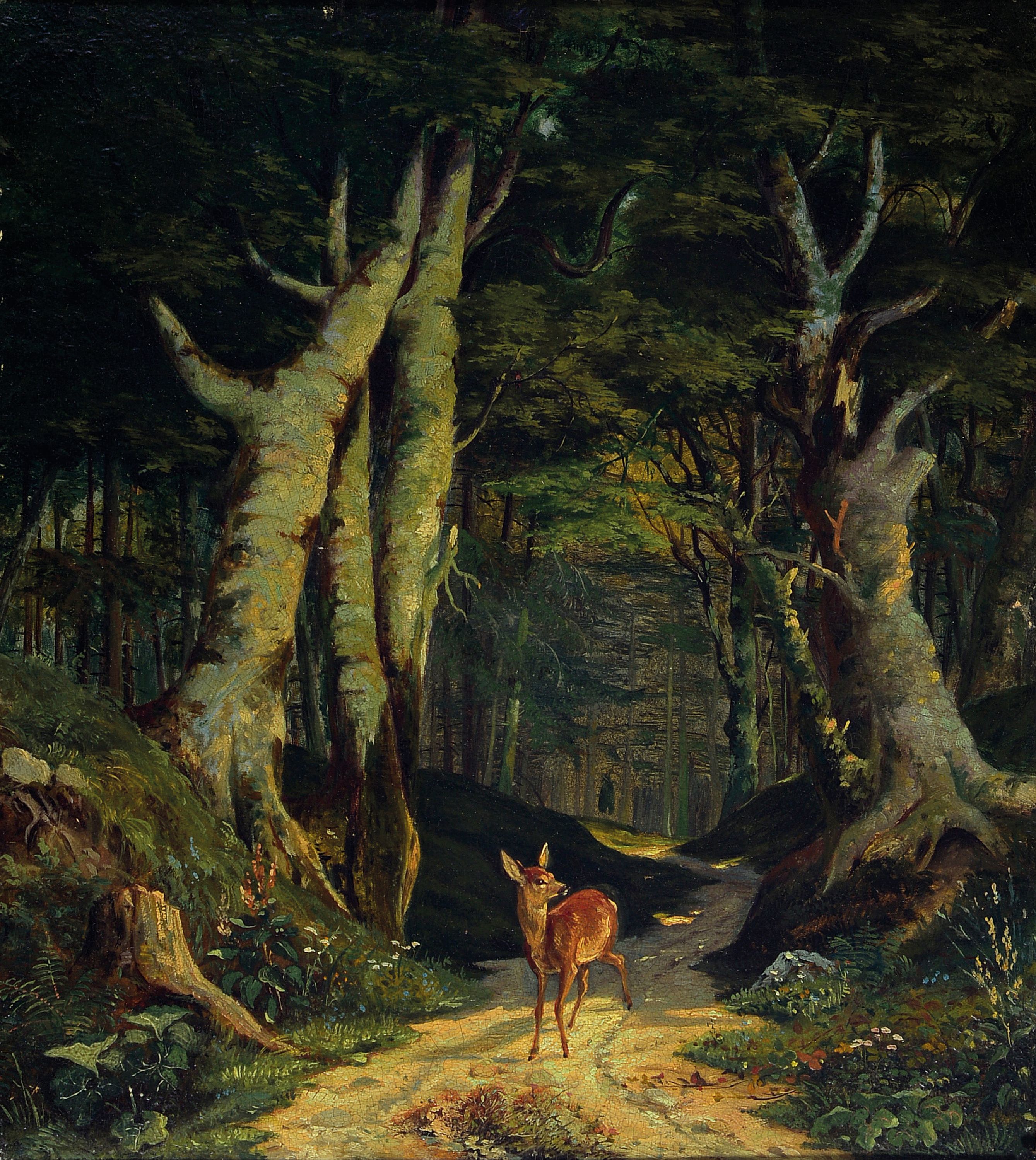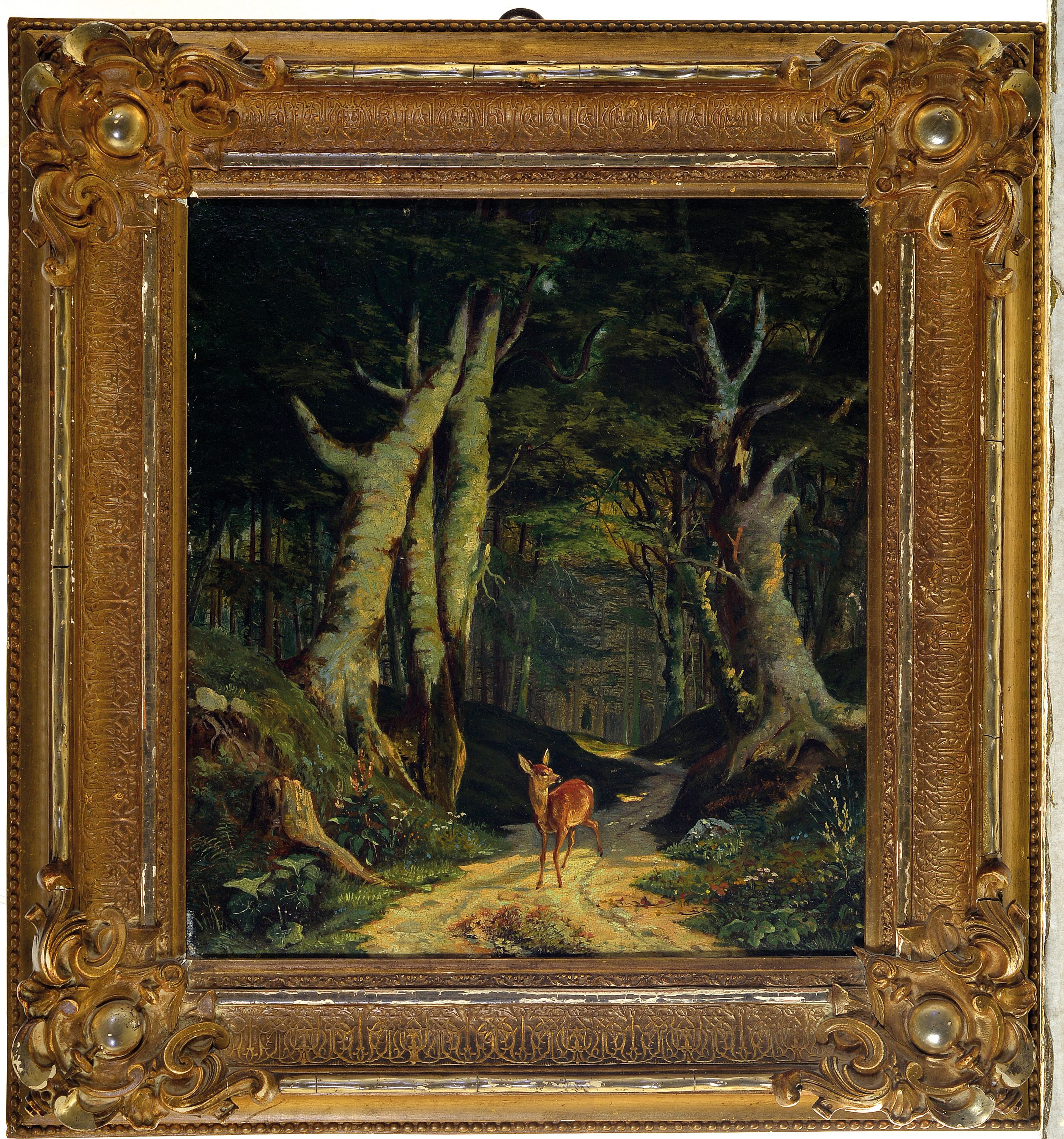 Unbekannter Künstler des 19.Jh., Waldinterieur mit Reh, Öl/Malkarton, 35x31 cm,l.