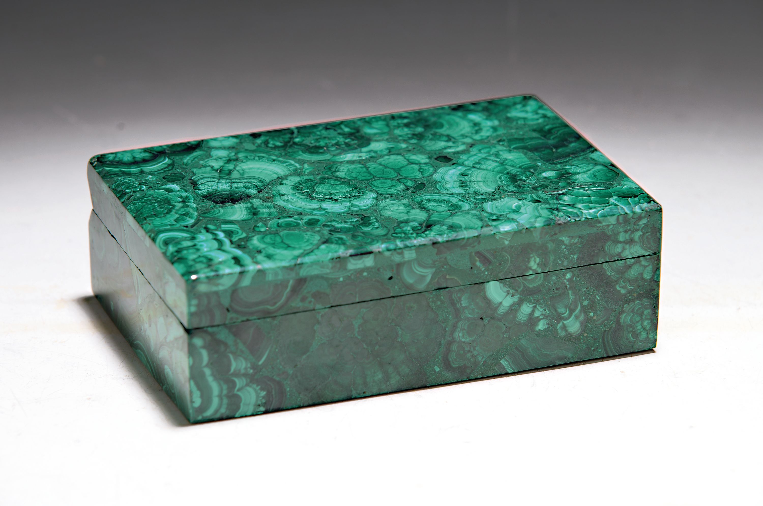 Deckeldose aus Malachit, neuzeitlich, ca. 4.5x15x10cm, Wandstärke ca. 0.5 cm