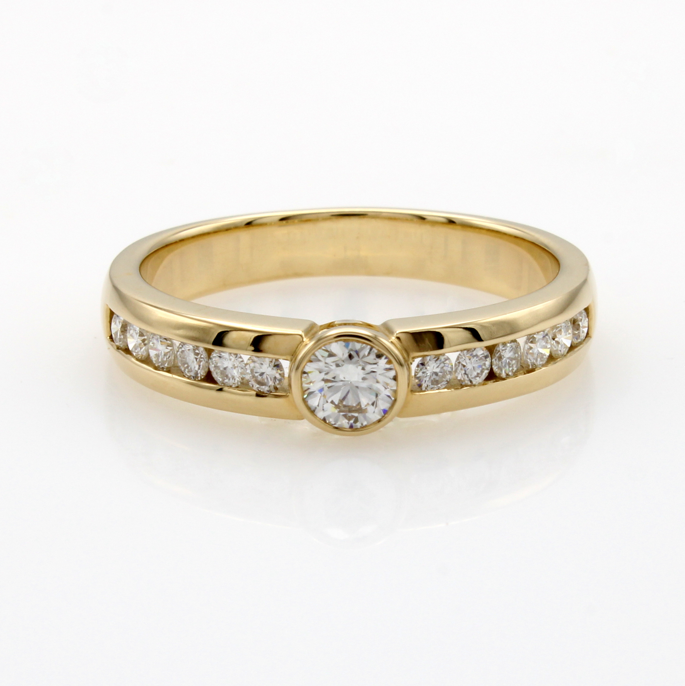 Ring mit Brillanten, GG 585/000, 1 Brill. mittig gef. u. Besatzbrill. in Kanalfassung zus. ca. 0.60 ct Weiß/si, RW ca. 60 Schätzpreis: 3040, - EUR