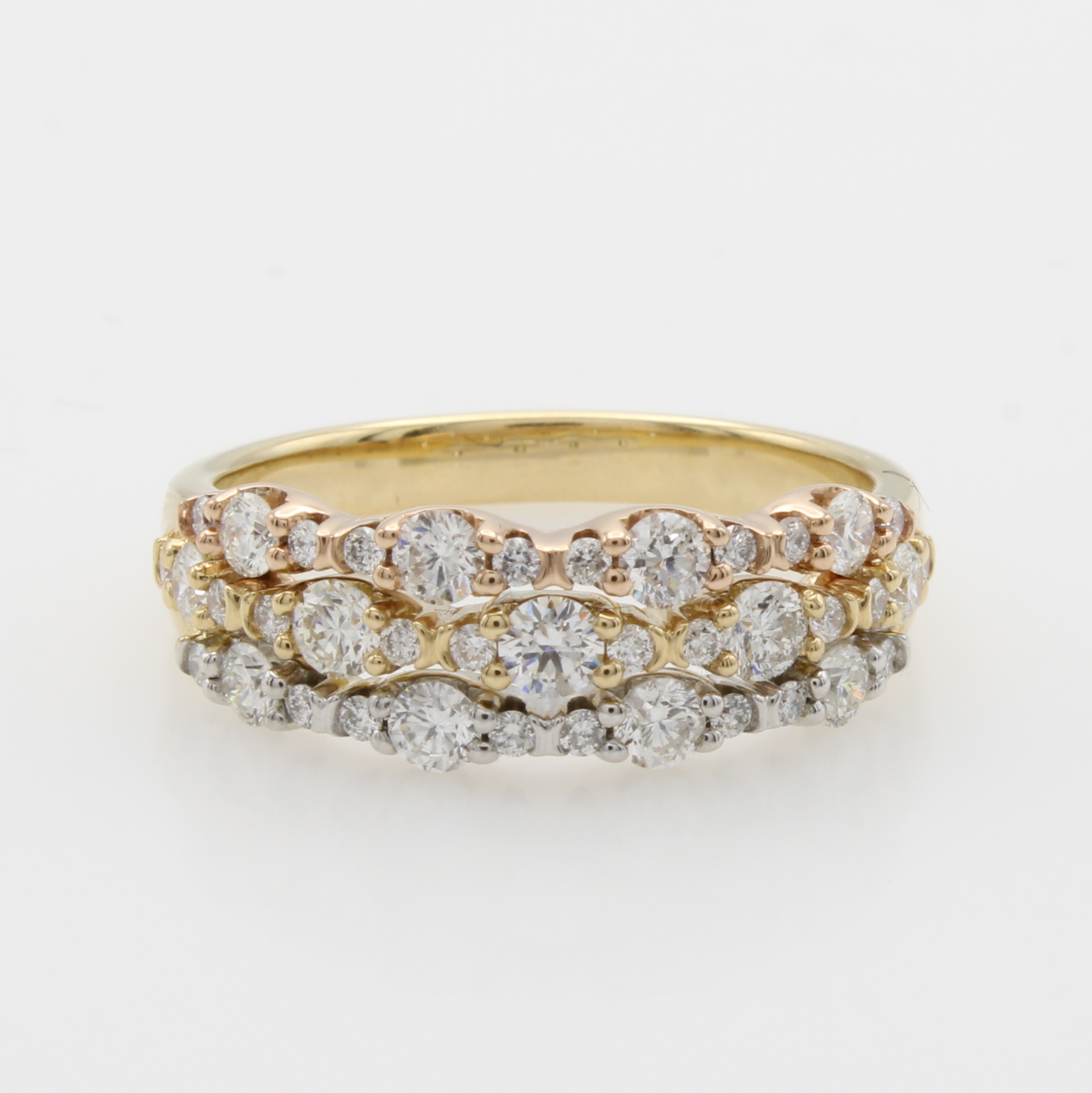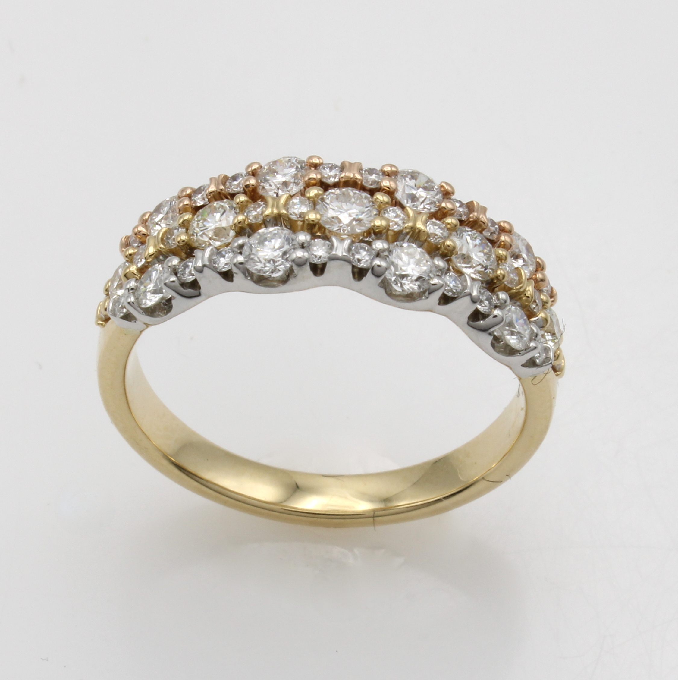 Ring mit Brillanten, GG/WG/RG 585/000, Brill. zus. ca. 1 ct Weiß/p, 3-rhg. Optik, RW ca. 56 Schätzpreis: 2820, - EUR