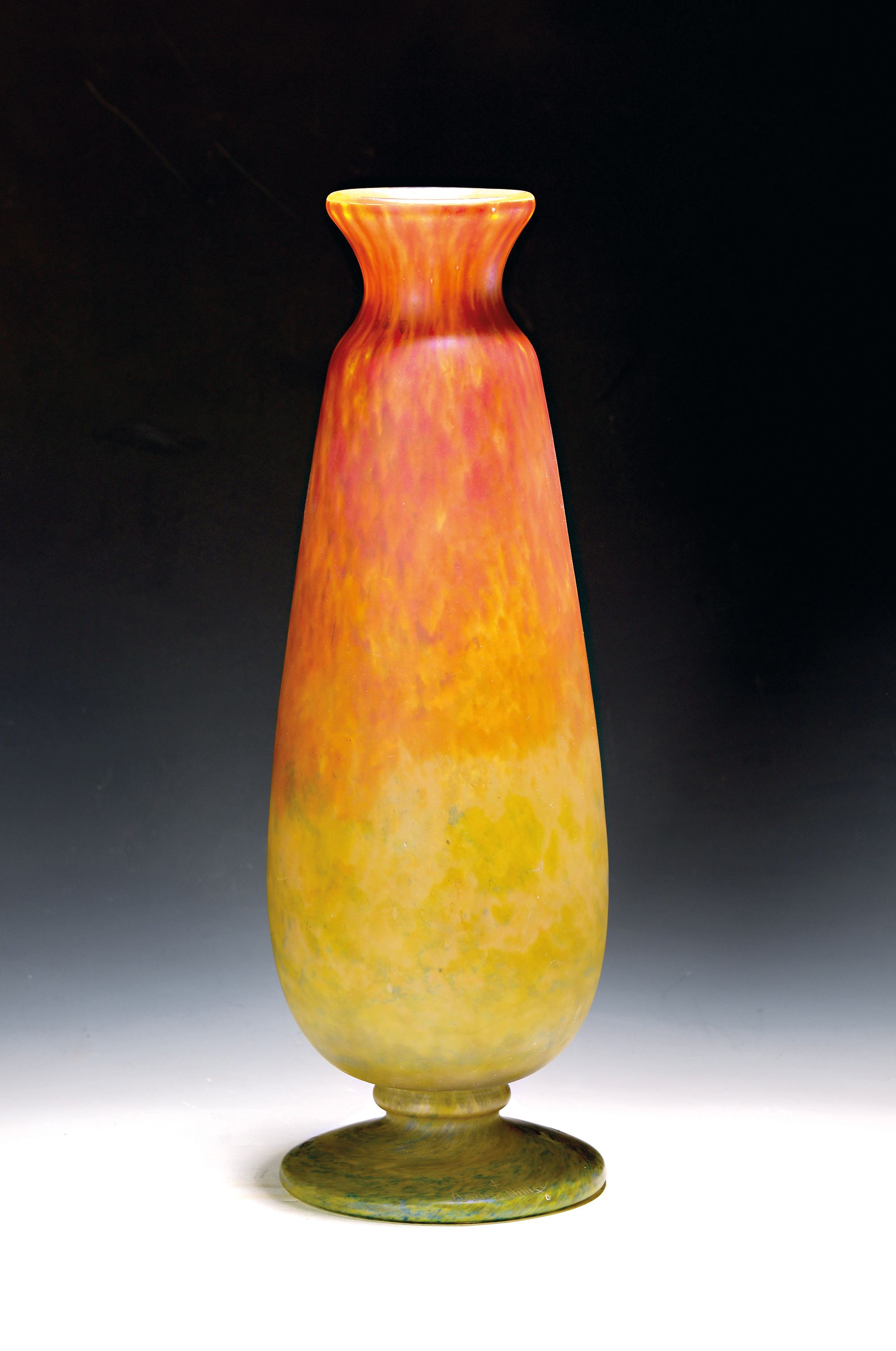 Sehr große Vase, Daum Nancy, 1920er Jahre, Schichtglas mit gelben, grünen und orange-