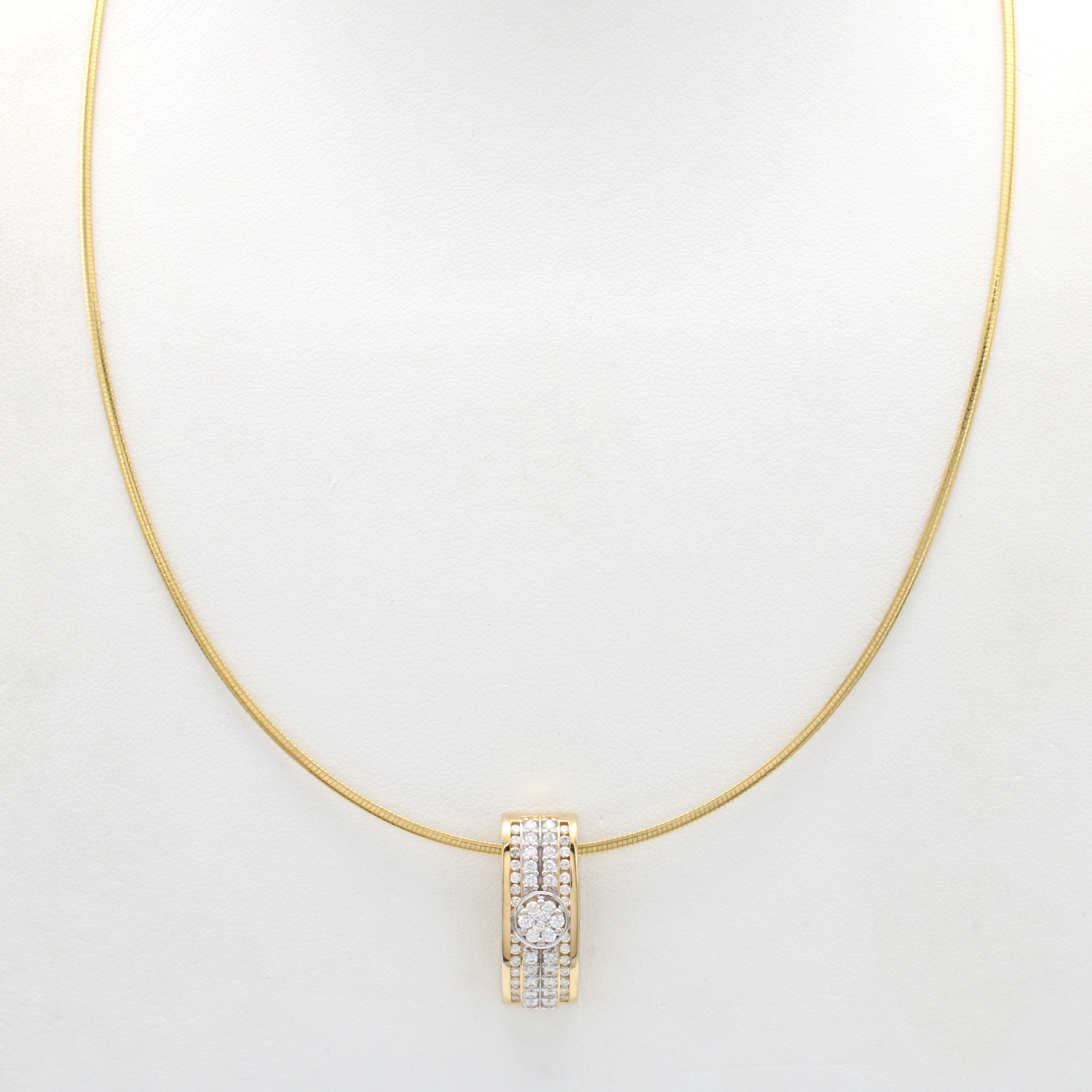 Anhänger mit Brillanten an Omegareif, GG 585/000 z.T. rhod., länglicher, konvexer Anhängerbes. m. 59 Brill. zus. ca. 0.60 ct Weiß/lupenrein, L. ca. 45 cm Schätzpreis: 4900, - EUR