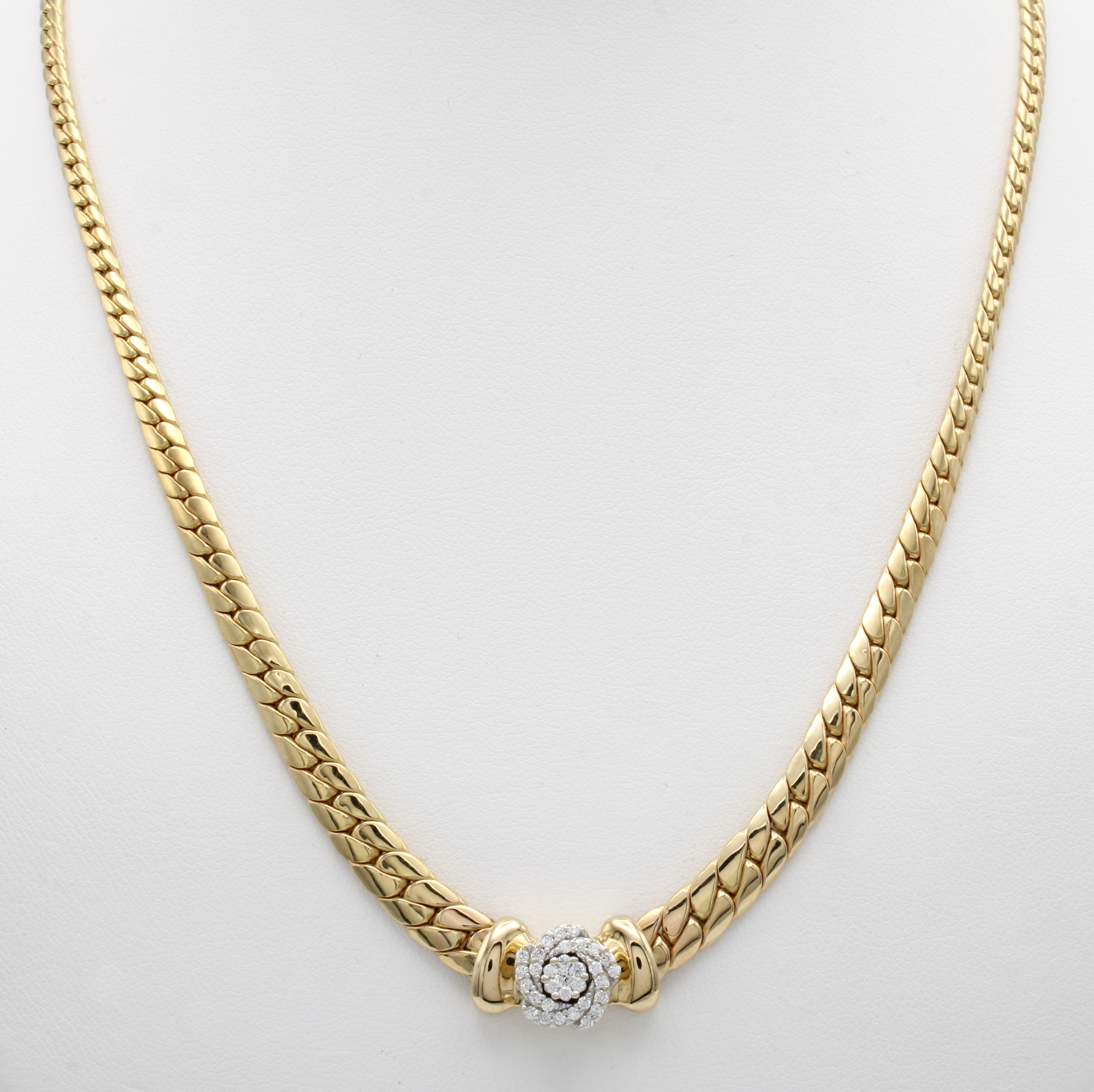 Panzercollier mit Brillanten, GG/WG 585/000, blütenf. Mittelteil bes. m. Brill. zus. ca. 0.25 ct Weiß/lupenr., Kette im Verlauf, L. ca. 44 cm Schätzpreis: 4350, - EUR