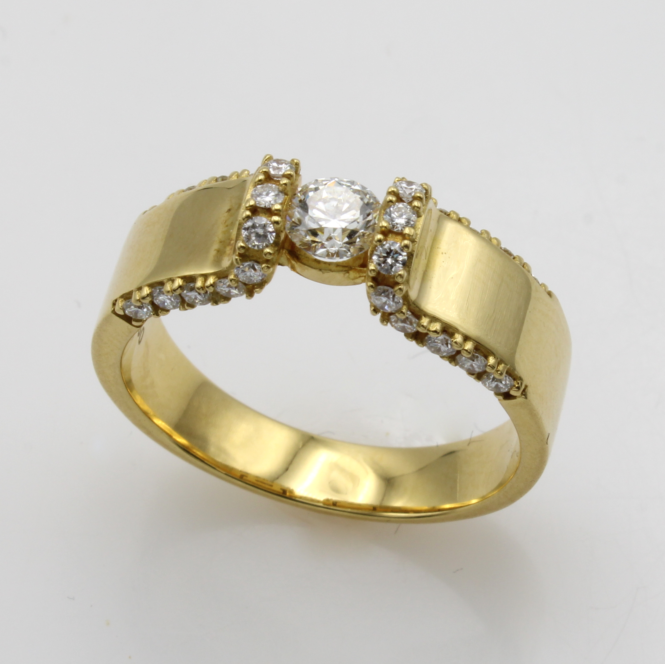 Ring mit Brillanten, GG 750/000, Solitär u. Besatzbrill. (z.T. seitlich gef.) zus. ca. 0.60 ct Weiß/si, RW ca. 56 Schätzpreis: 4000, - EUR