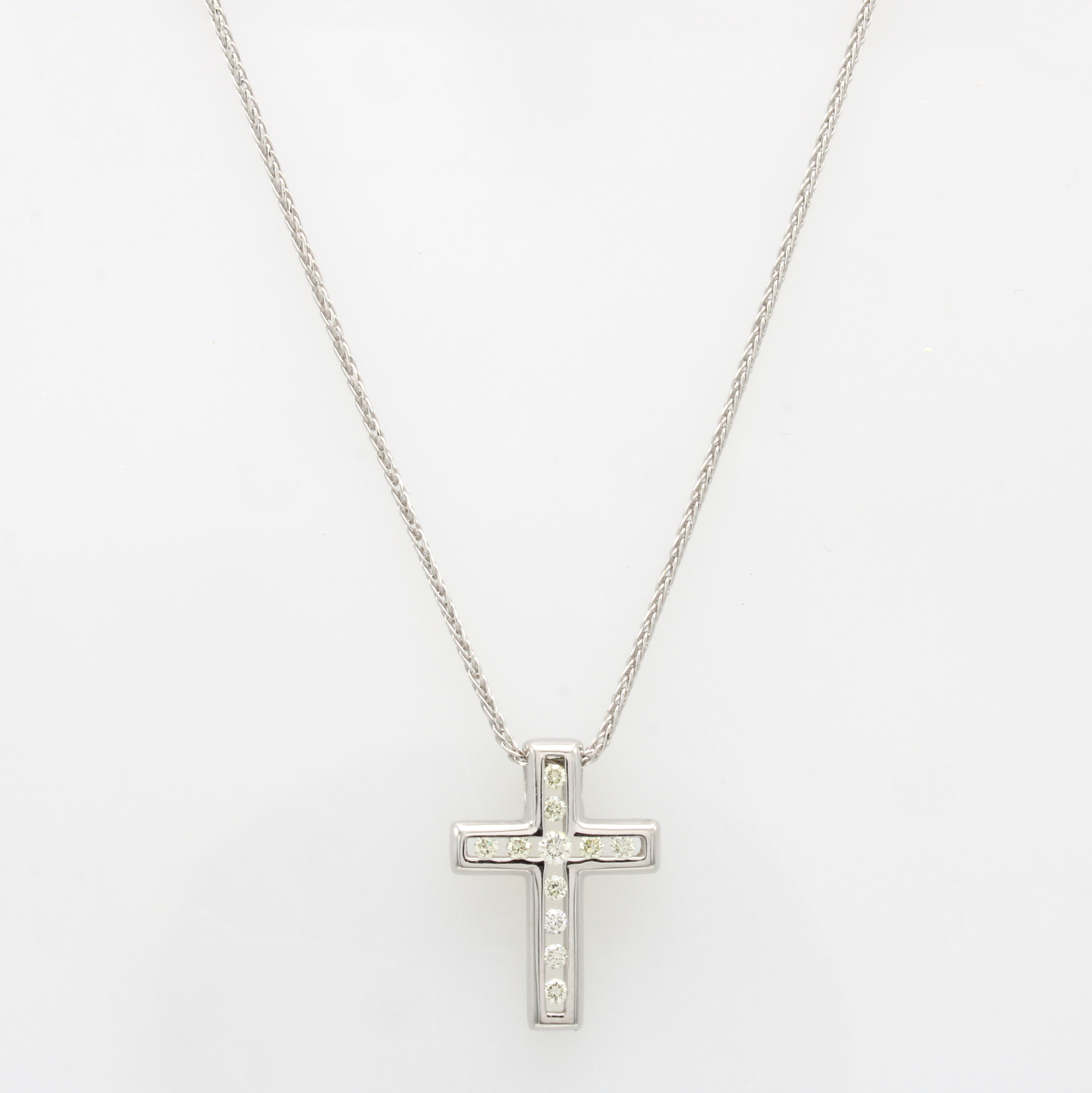 Kreuzanhänger mit Brillanten an Kette, WG 585/000, Brill. zus. ca. 0.20 ct get.Weiß/ lupenr., Kanalfassung, in L. ca. 42.5 u, 44.5 cm zu tragen Schätzpreis: 1730, - EUR
