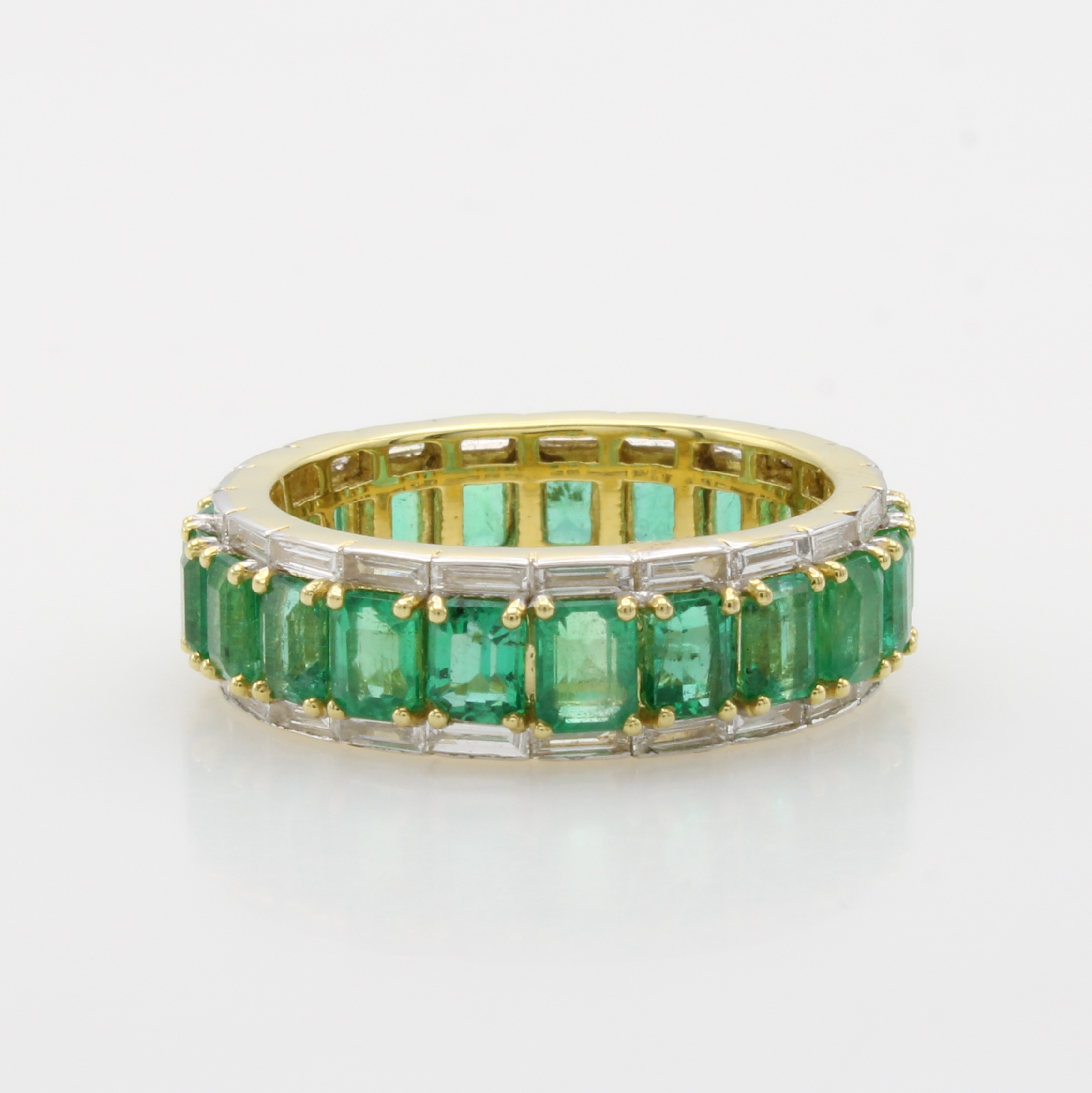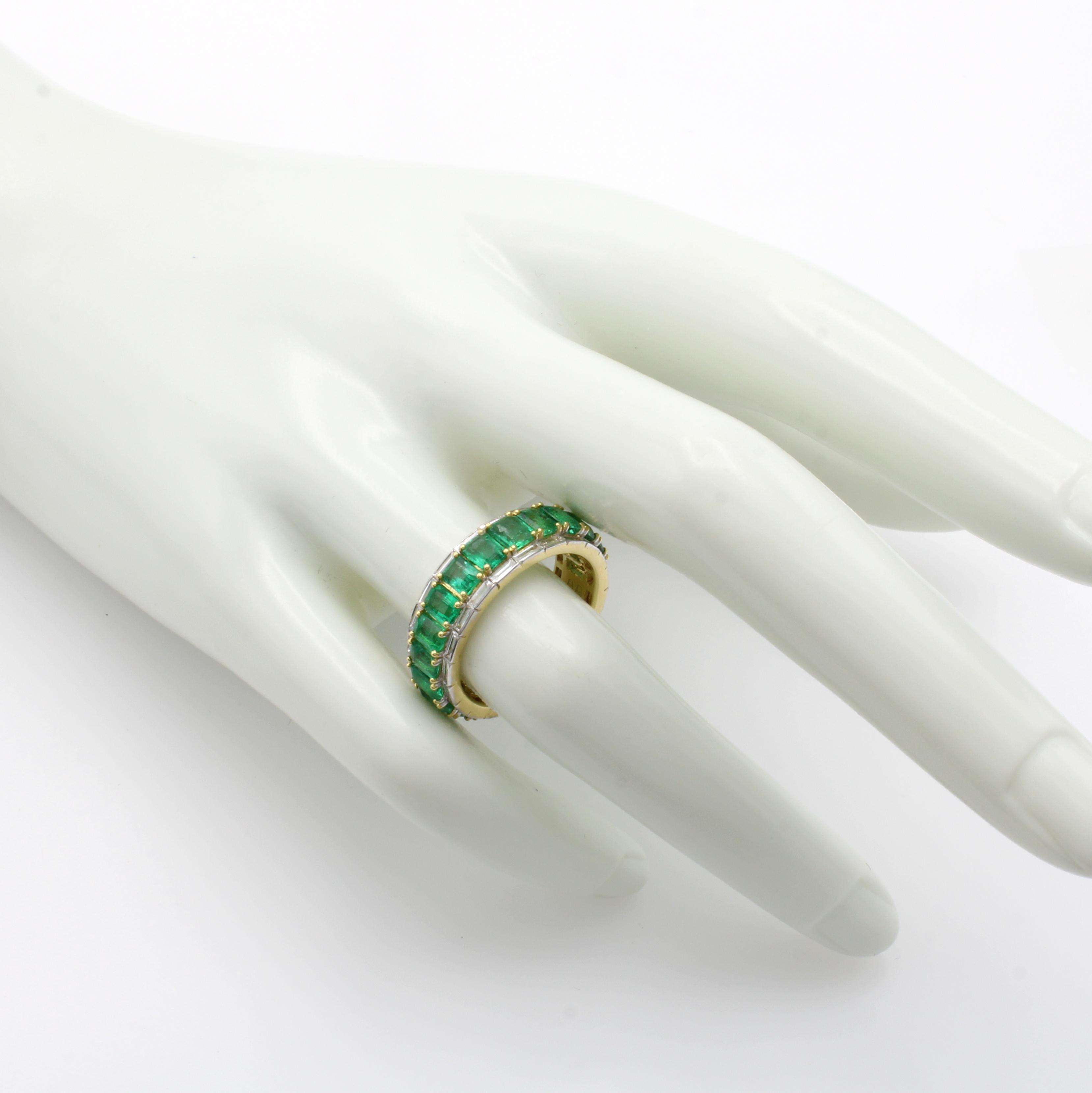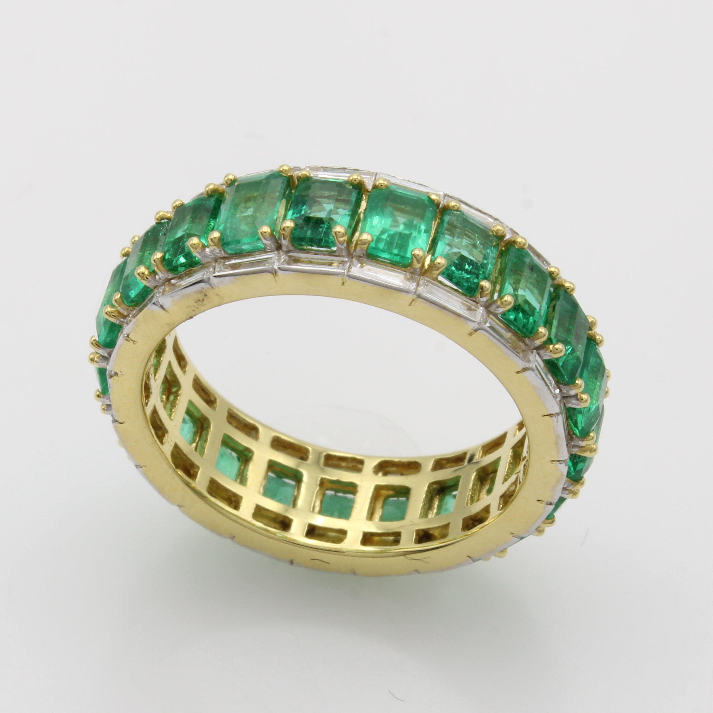 Memoryring mit Smaragden und Diamanten, GG 750/000, viereck. Smaragde zus. ca. 4.51 ct, Rand bes. m. Diamantbaguettes zus. ca. 0.94 ctWeiß/si, RW ca. 56 Schätzpreis: 14600, - EUR