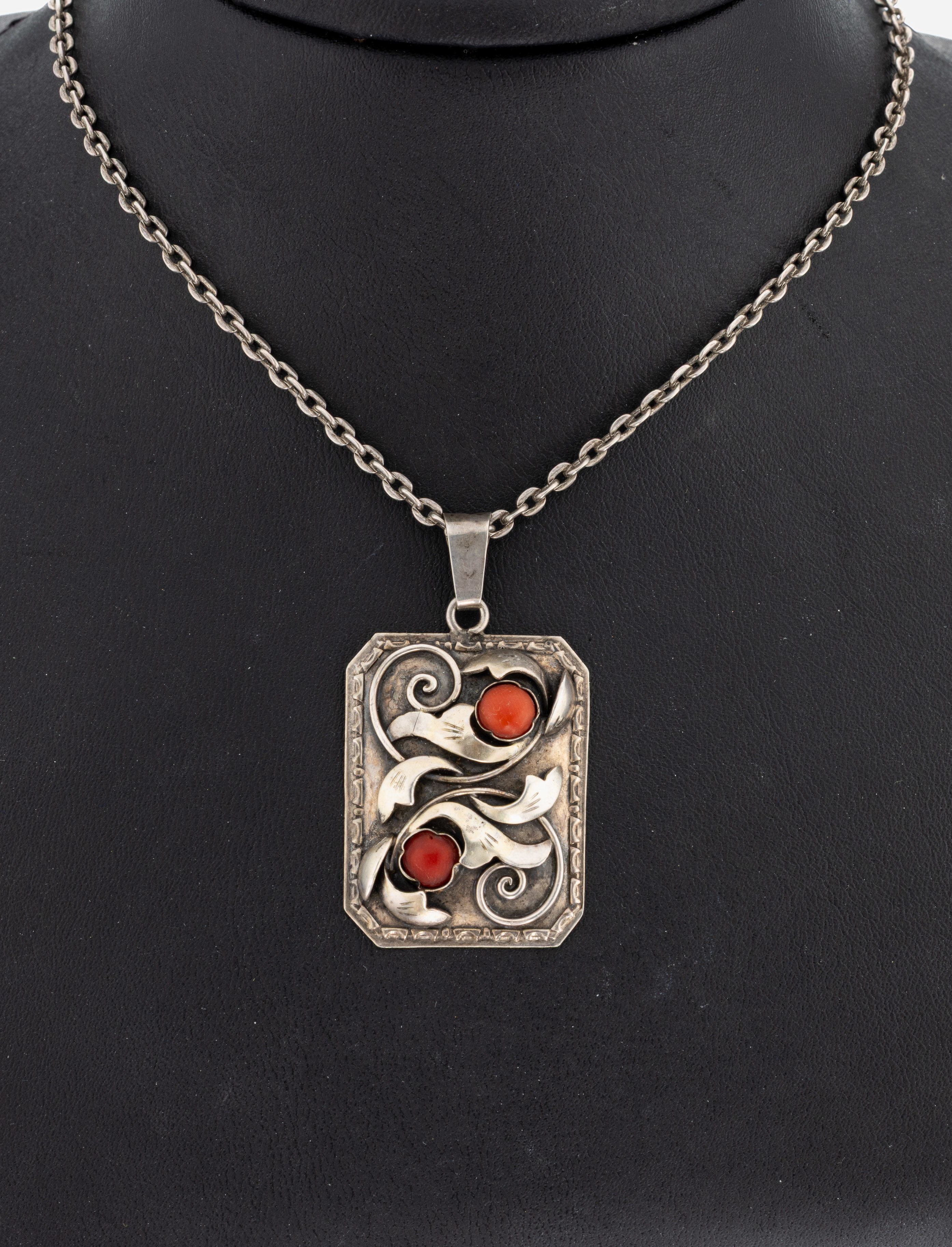Korallen-Anhänger, 1950er Jahre, 900er Silber, oktagonale Grundform, aufgelegte