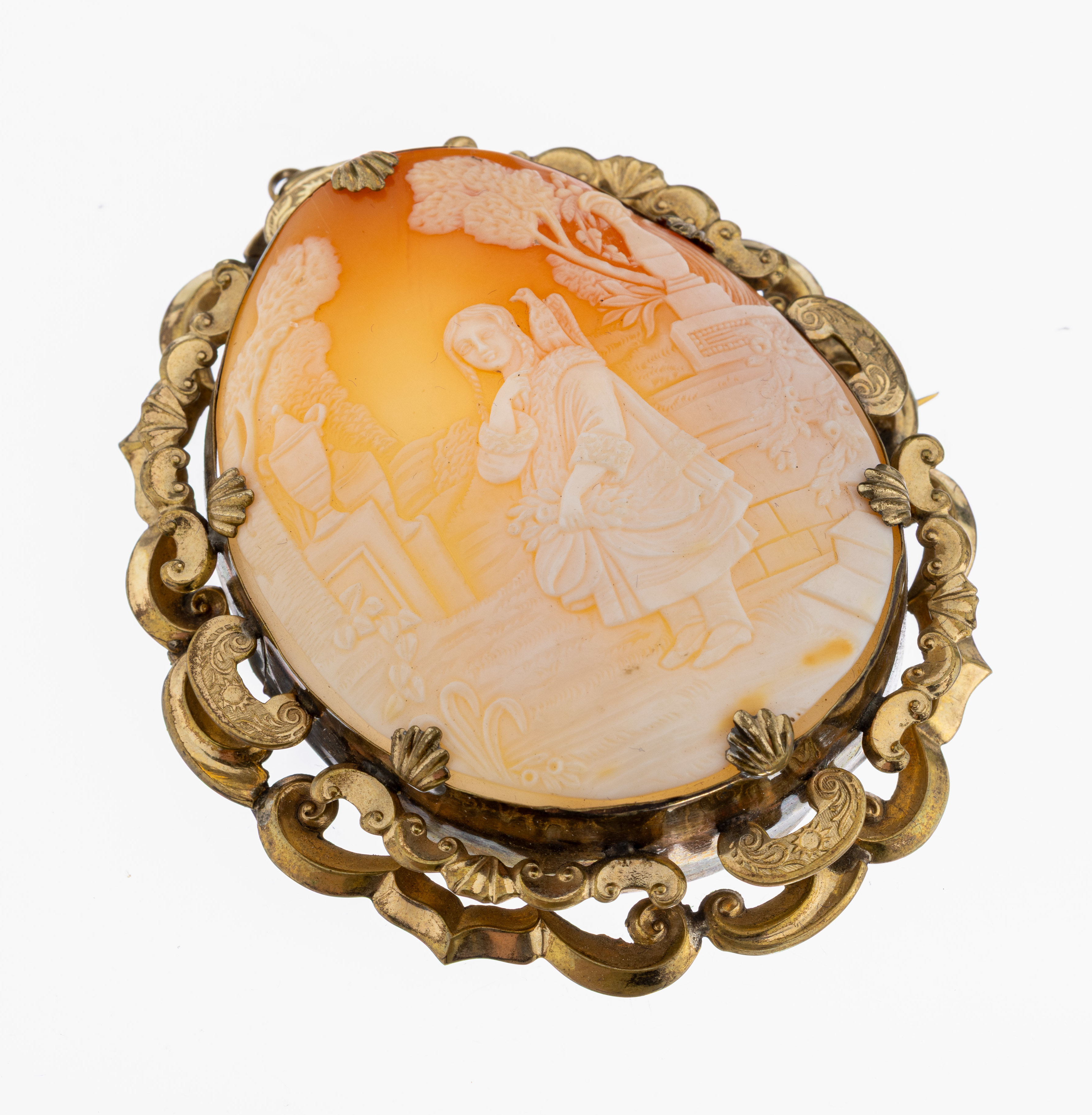 Kamee-Brosche, um 1900, ovale Muschelkamee,Darstellung einer Frau in ländlicher