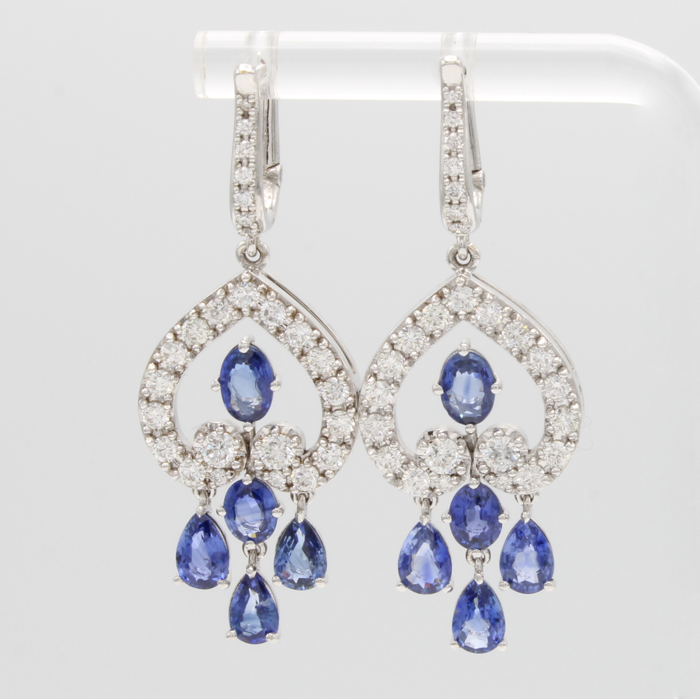 Paar Ohrgehänge mit Saphiren und Brillanten, WG 750/000, angedeutete Pikform bes. m. Brill.zus. ca. 1.49 ct Weiß/si-p, tropfenförm. u. ovale Saphire zus. ca. 4.83 ct Schätzpreis: 9000, - EUR