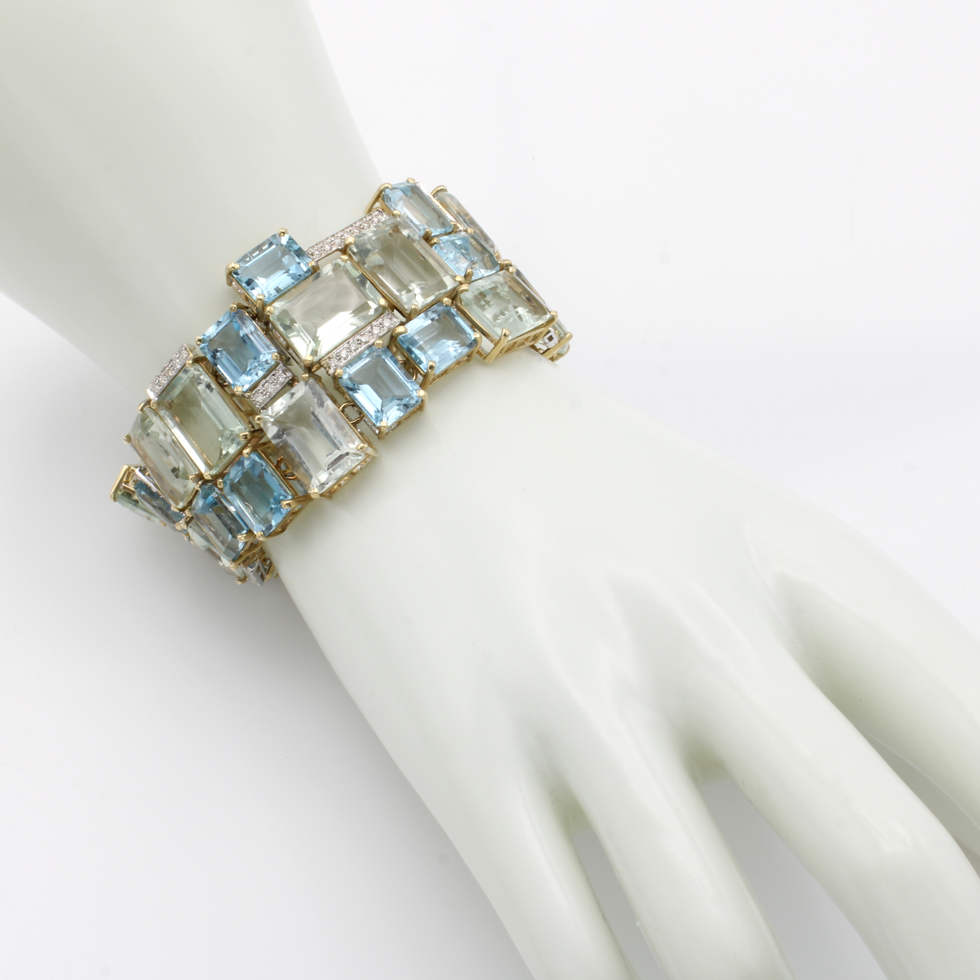 Ausgefallenes Armband mit Farbsteinen und Brillanten, RoséG/WG 585/000, achteck. Blautopase (beh.) u. grüne Amethyste zus. ca. 197.20 ct, Brill. zus. ca. 1.65 ct Weiß-get. Weiß/p, Kastenschl., L. ca. 21 cm Schätzpreis: 16000, - EUR
