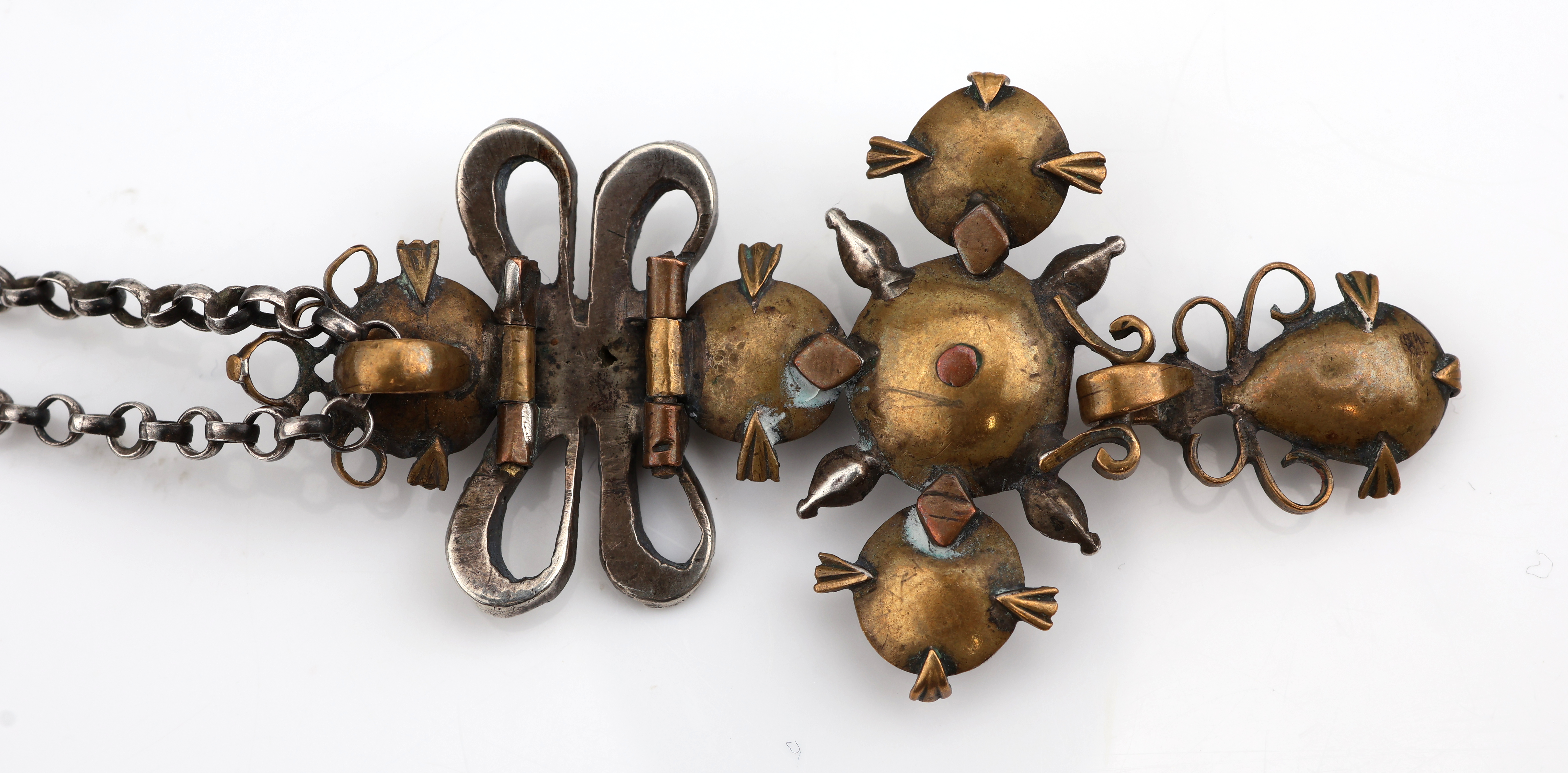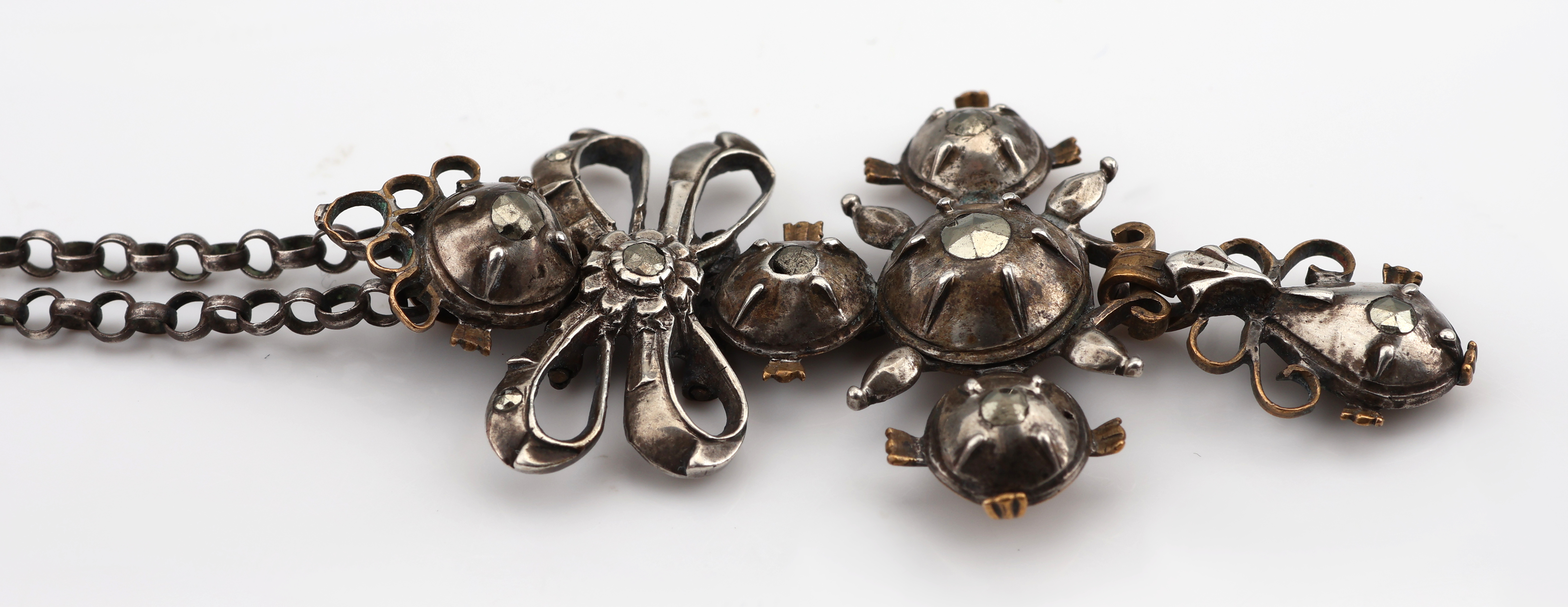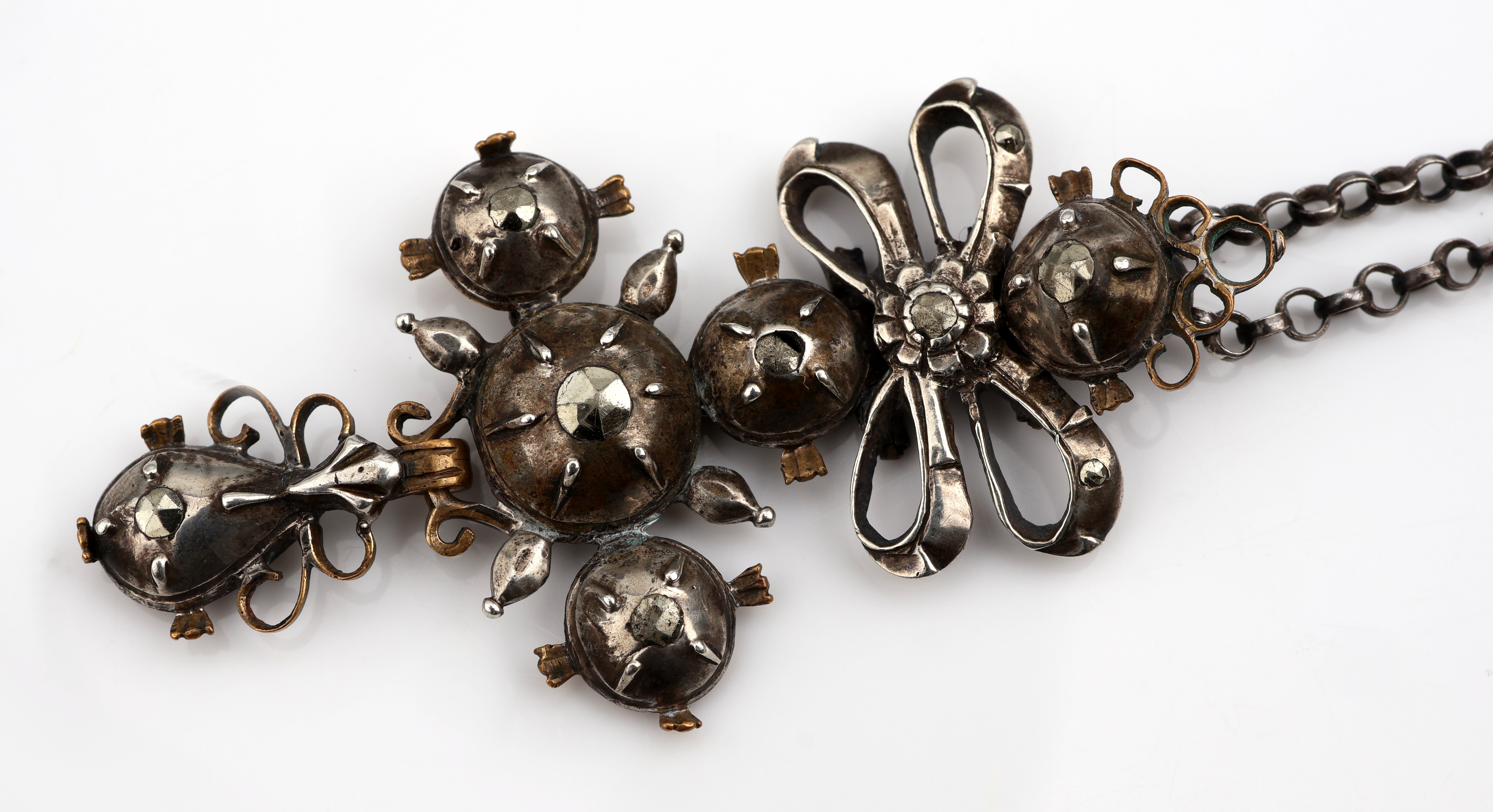 Anhänger, um 1780, Silber und Metall, Schleife mit Kreuz, kl. Markasiten (sek.), rs.verbödet, an Kette, Silber gepr., L. ca. 47.5 cm, Federringschließe