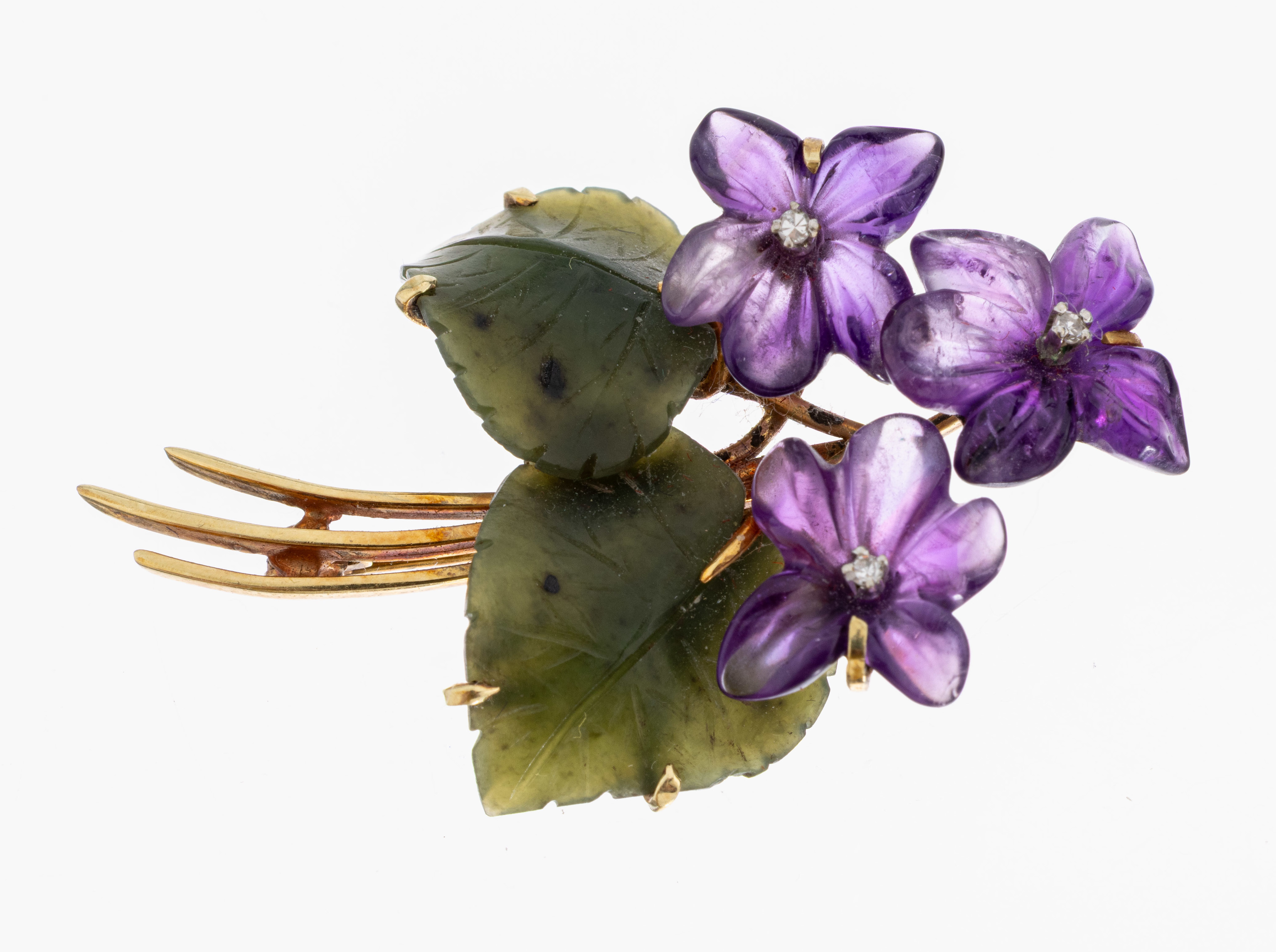 14 kt Gold Amethyst-Nephrit-Diamant- Veilchenbrosche, 1950er Jahre, GG 585/000, 3