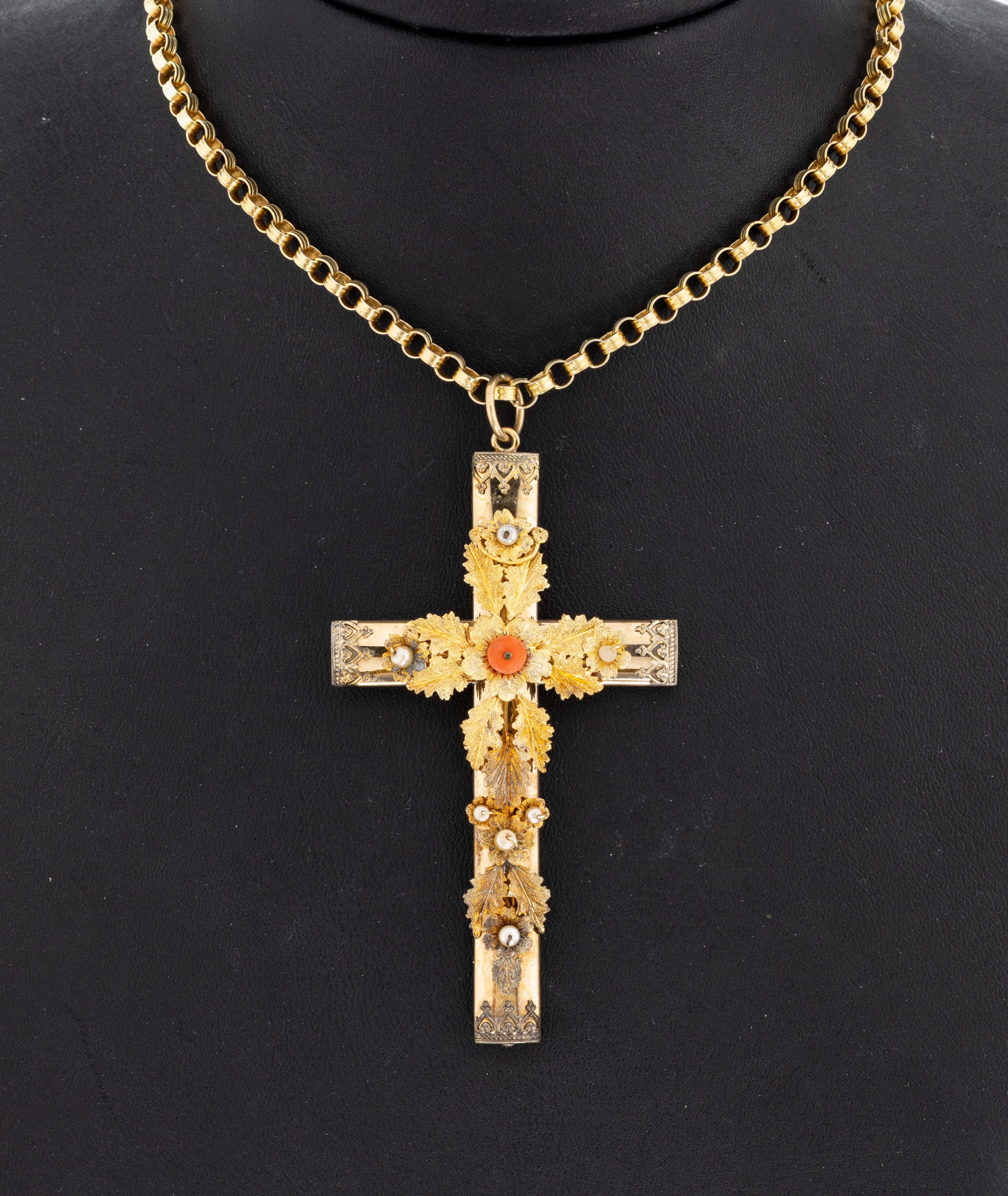 Koralle-Perl-Kreuzanhänger, um 1900, Silberverg., aufgelegtes Blattwerk mit Korallenkugelund
