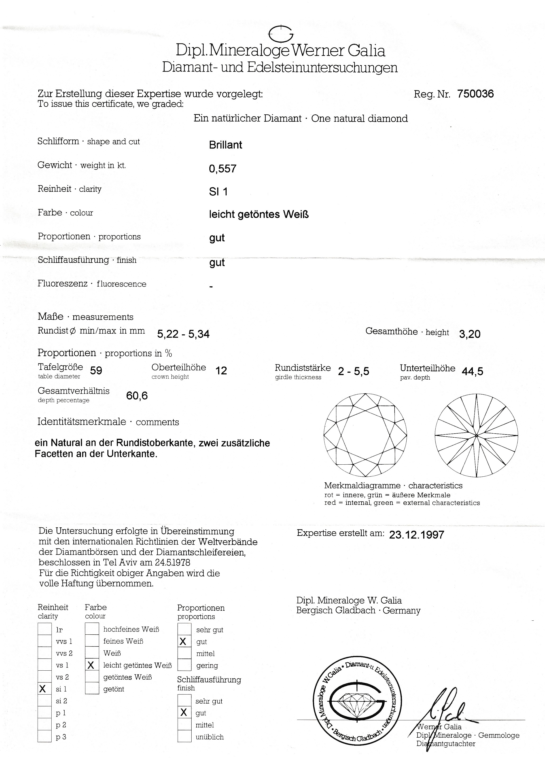 von 1997 je 0.557 ct l.get.Weiß/si1, Zargenfassung Schätzpreis: 3000, - EUR