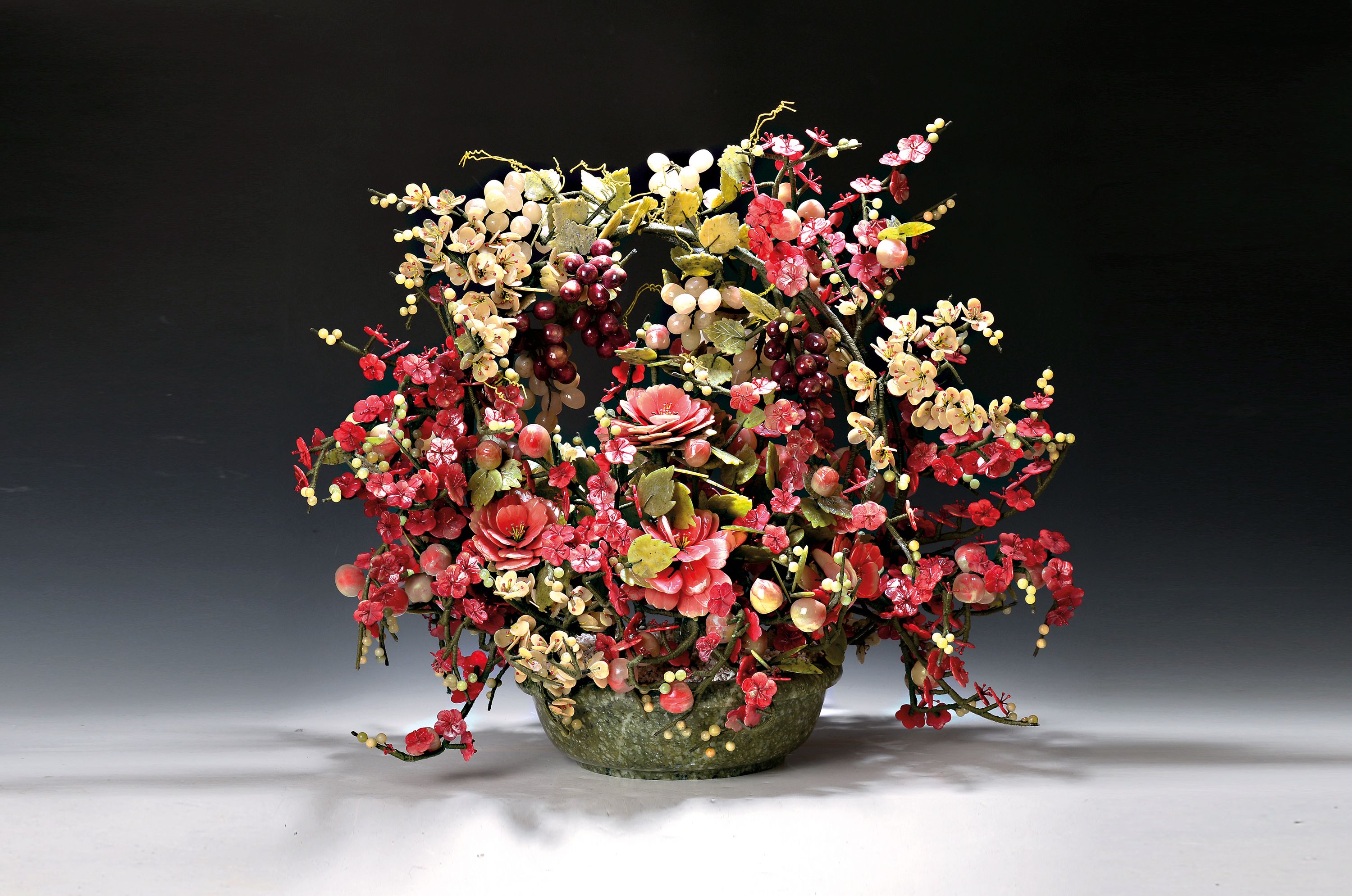 Opulentes Blumen- und Früchtebukett aus Jade, Glas und Hartstein, wohl China, 1980er-Jahre