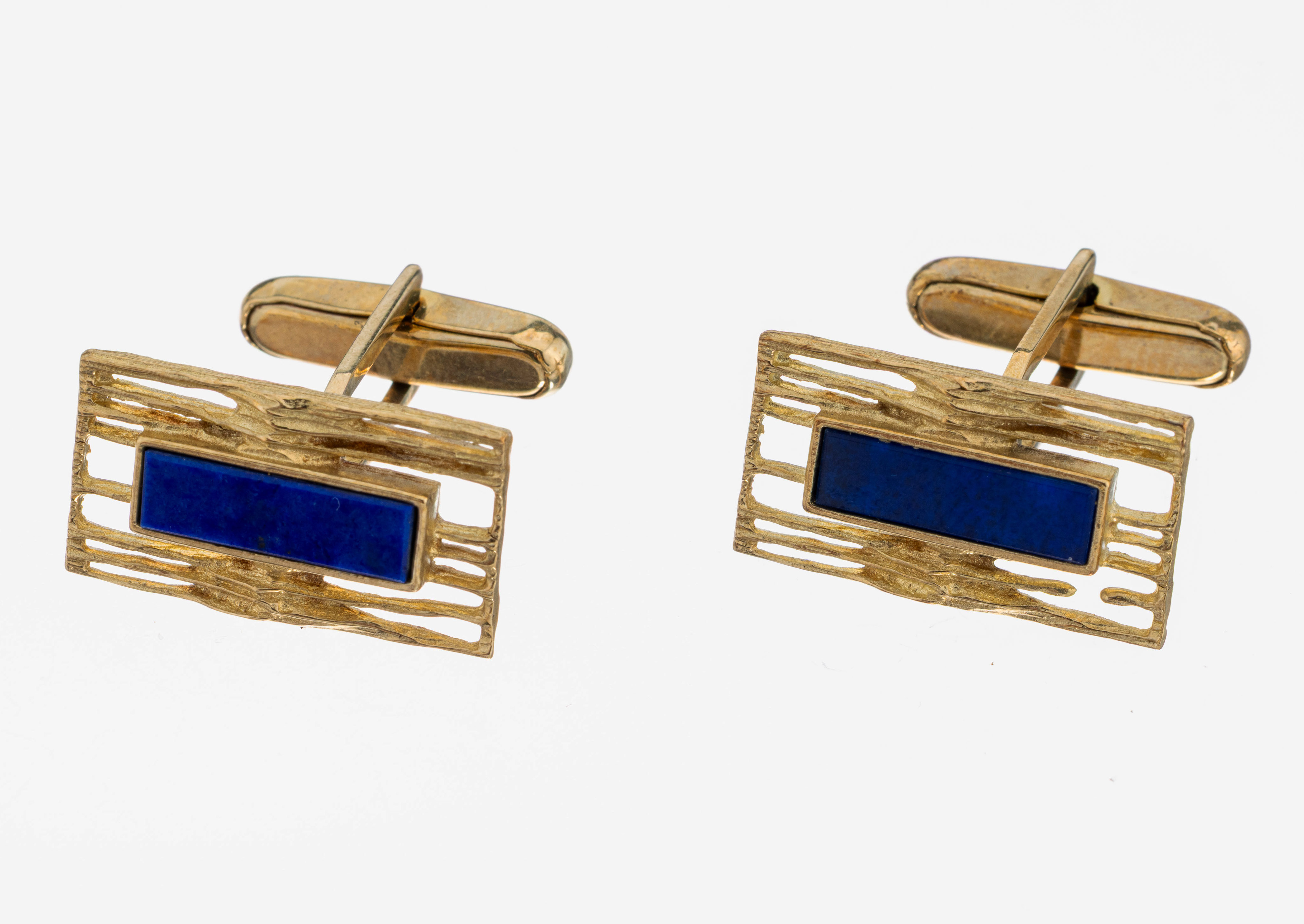 Paar 8 kt Gold Lapislazuli-Manschettenknöpfe, GG 333/000, durchbrochen, strukt., längliche Lapislazuli-Einlagen, ca. 7.5 g
