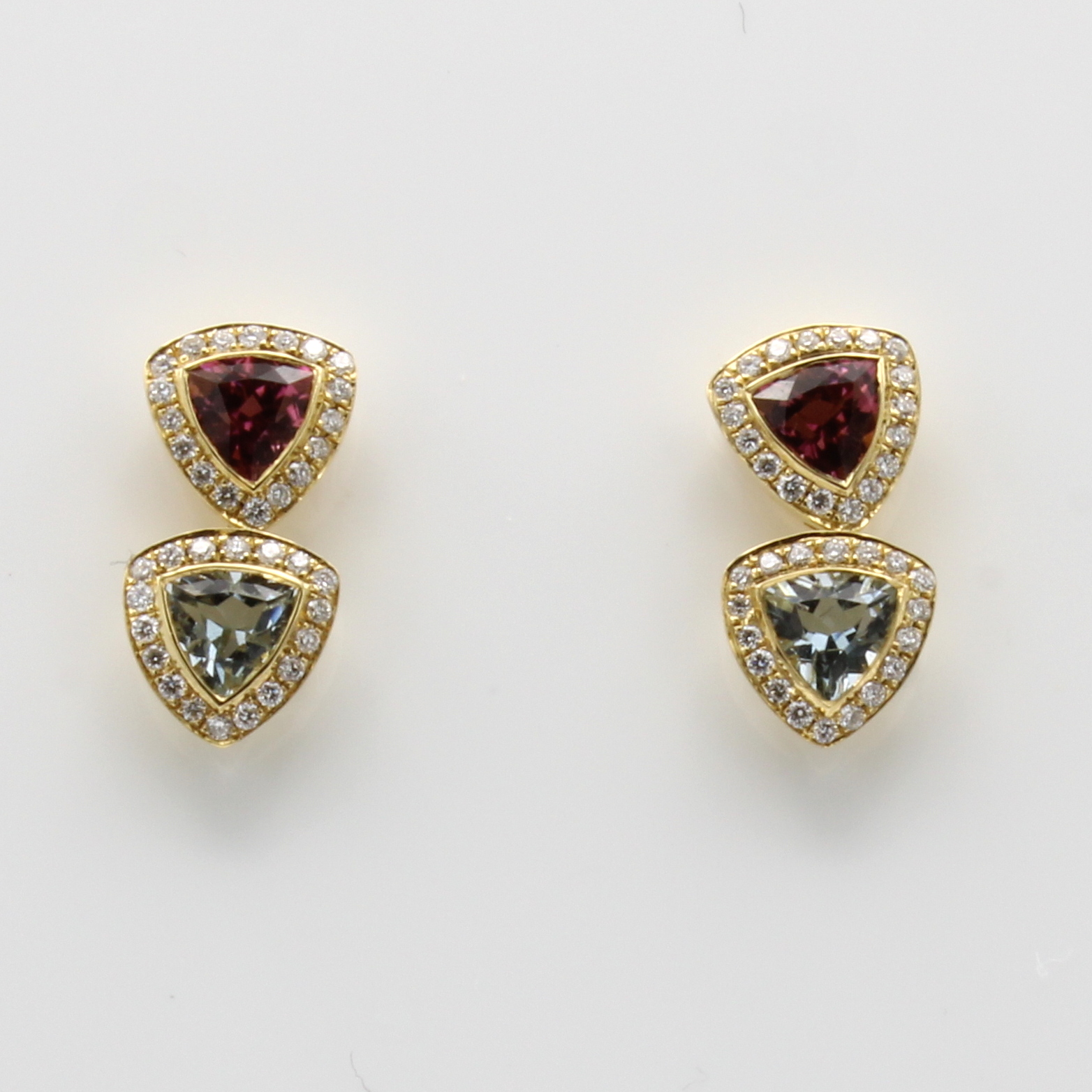Paar Ohrstecker mit Turmalinen, Aquamarinen und Brillanten, GG 750/000, 2 pink Turmaline zus. ca. 0.56 ct, 2 Aquamarine zus. ca. 0.56 ct und Brill. zus. ca. 0.24 ct feines Weiß/vs Schätzpreis: 3400, - EUR