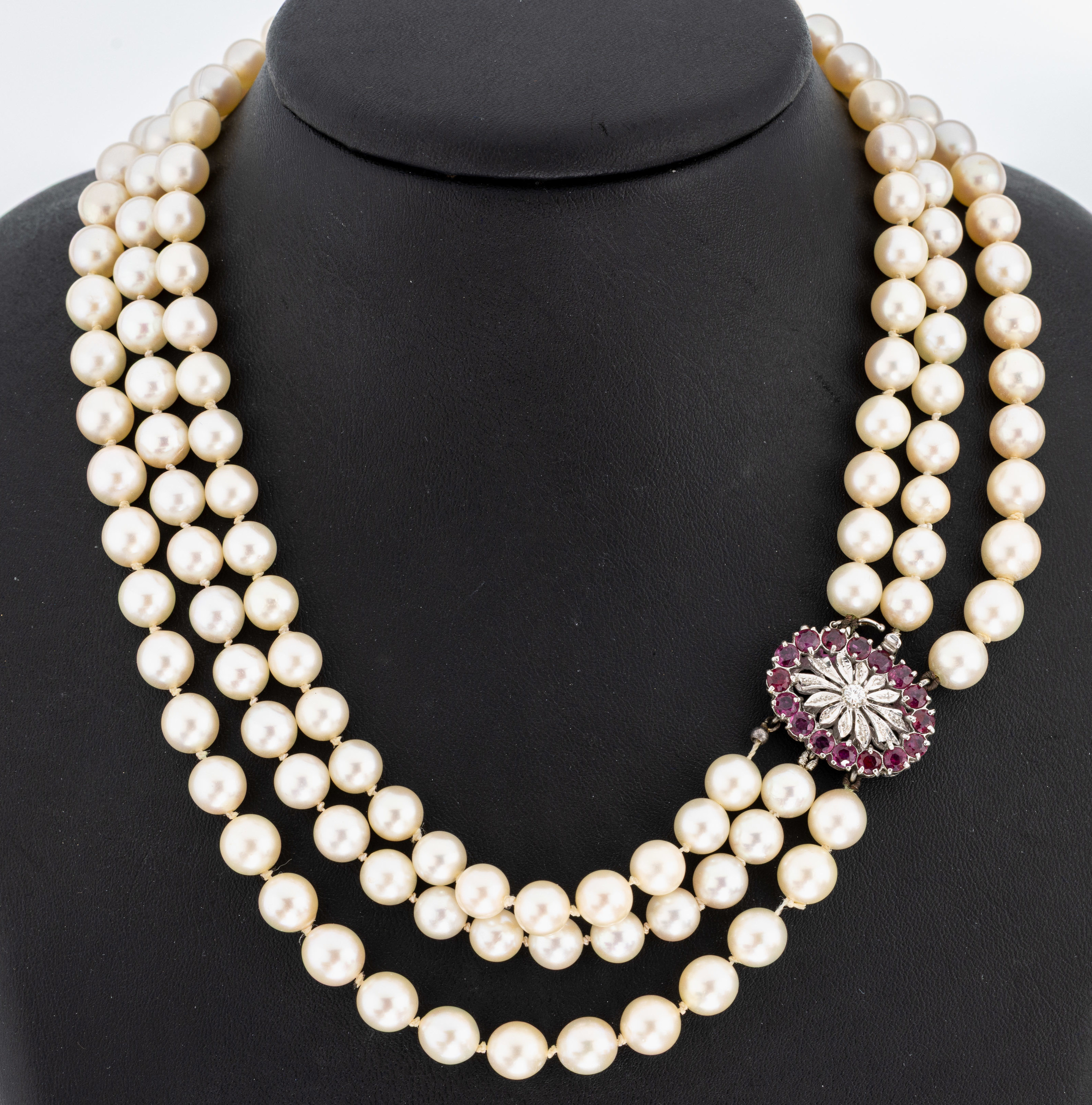 Perl-Collier mit 18 kt Gold Rubin-Brillant -Schmuckschließe, WG 750/000, 3-rhg.