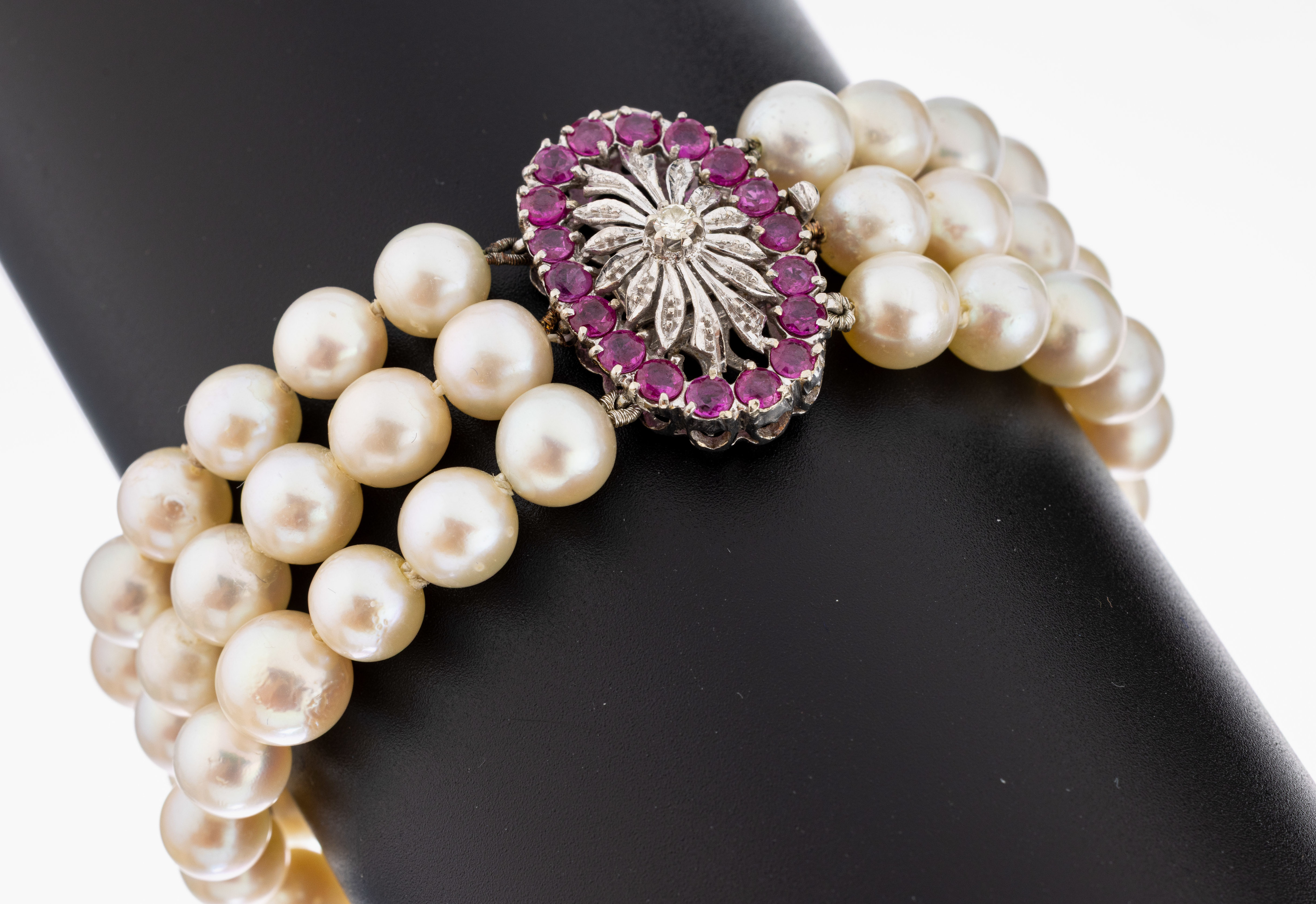Perl-Armband mit 18 kt Gold Rubin-Brillant- Schmuckschließe, WG 750/000, 3-rhg.