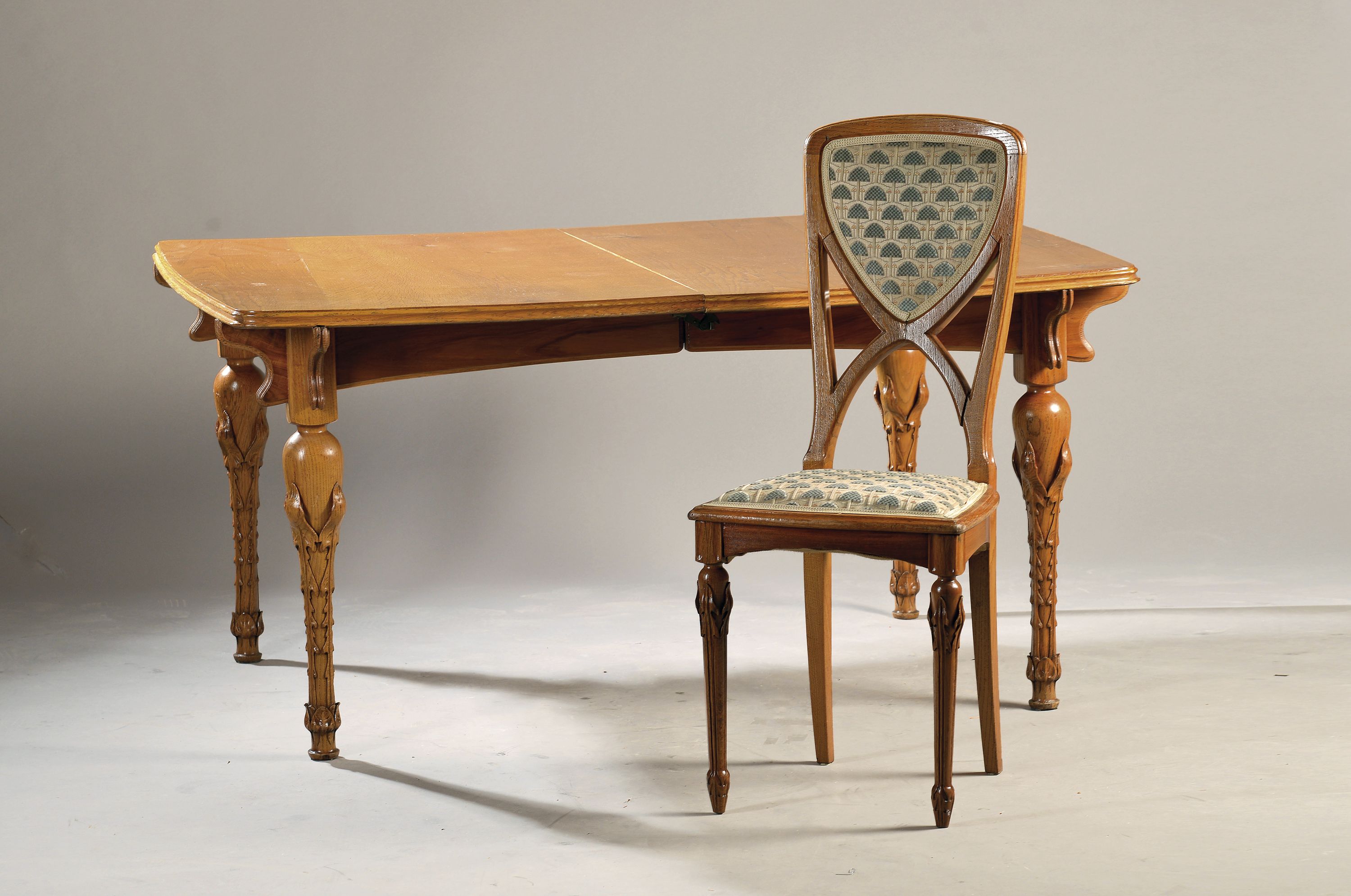 Ausziehtisch mit 6 Stühlen, im Jugendstil, Frankreich, um 1900, Eiche massiv, Tisch