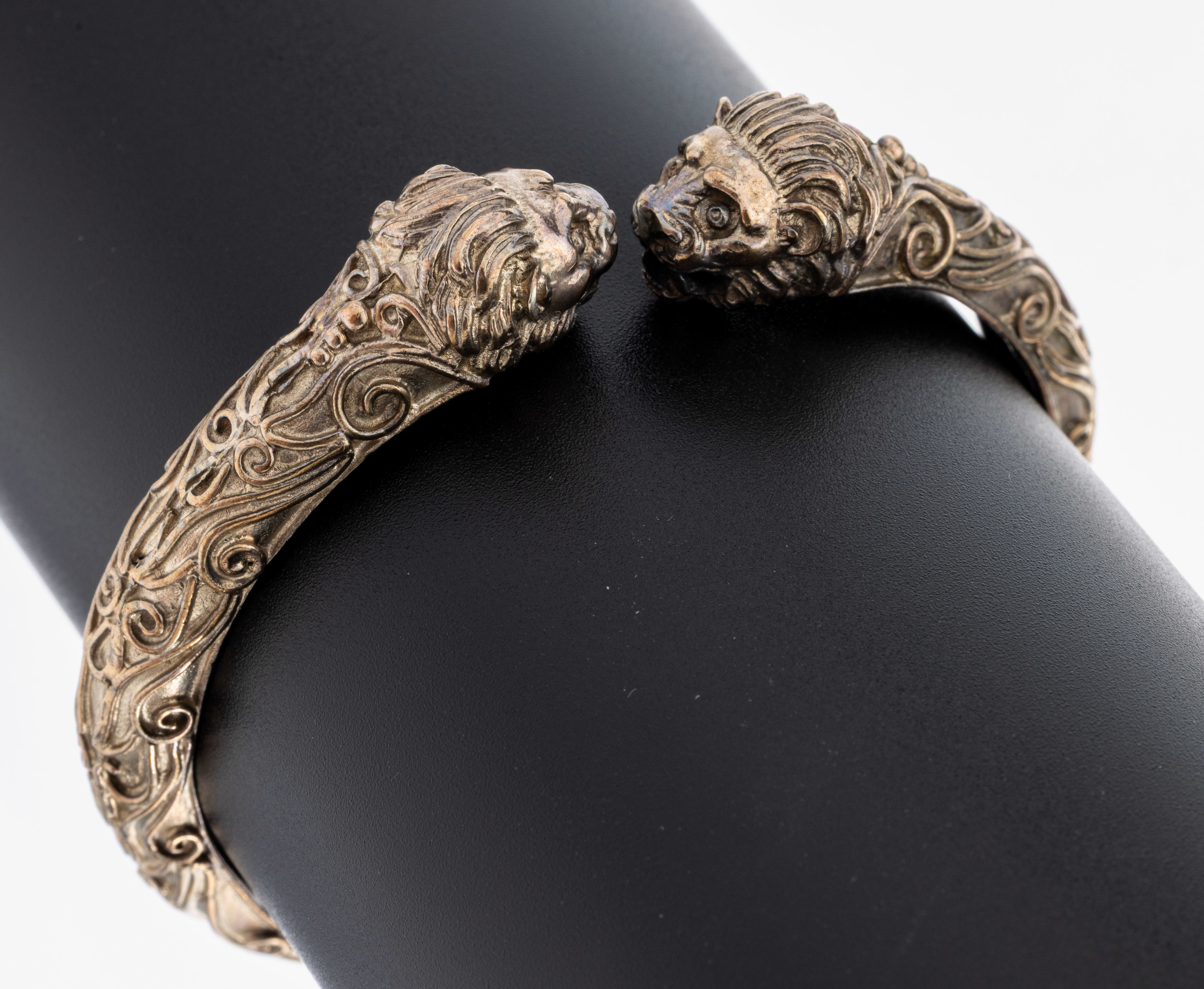 Armreif, "Löwenköpfe", um 1910, Silber gepr., 2 vollplastische Löwenköpfe, aufgel.